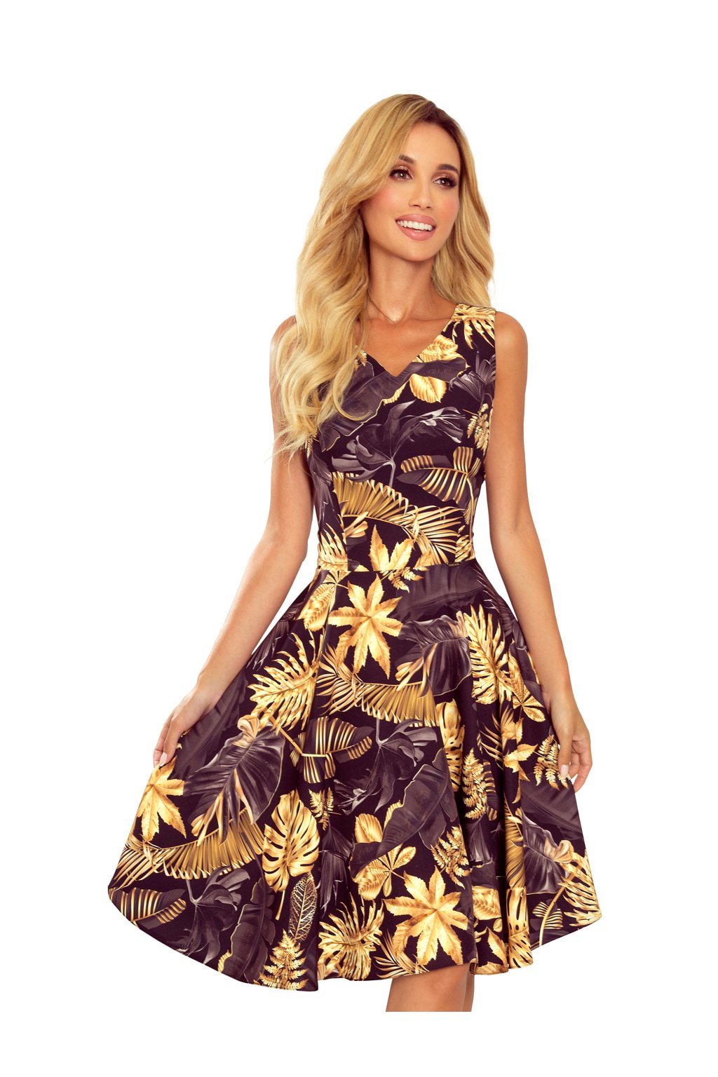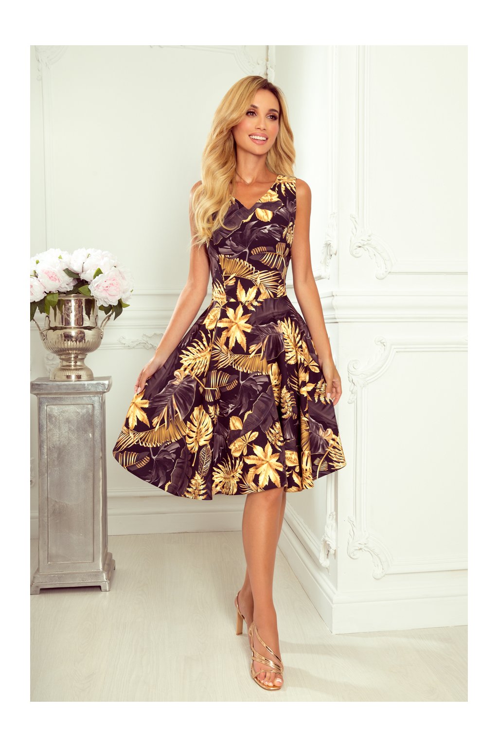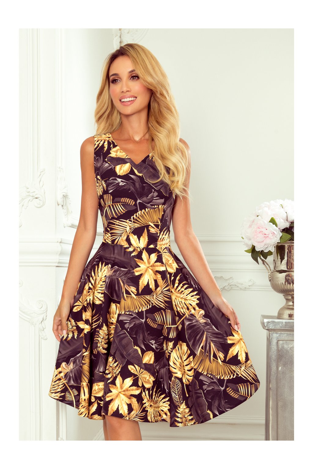 Šaty s výstřihem - Černé + zlaté listy. Vysoce kvalitní, příjemné na dotyk materiál. Značka numoco.