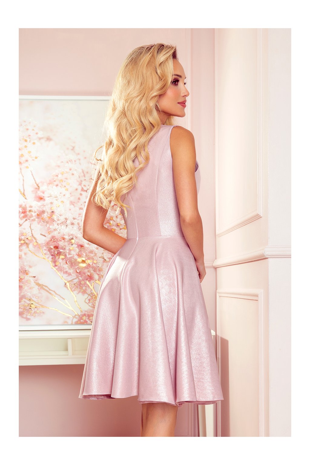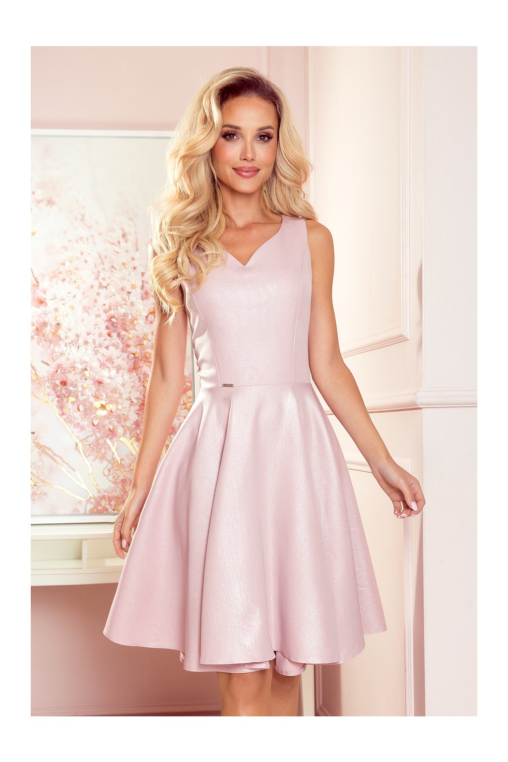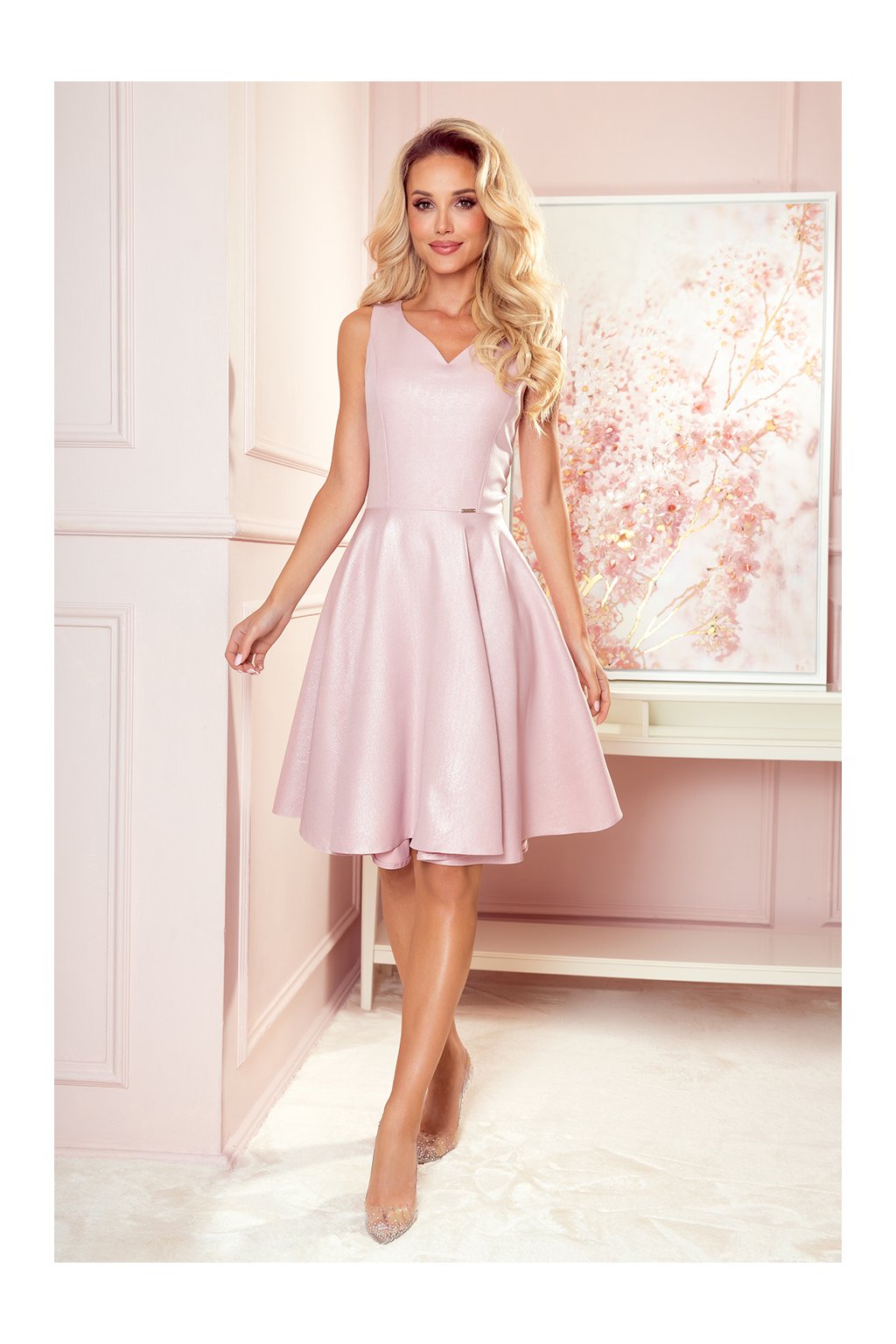 Rozevláté šaty se srdíčkovým výstřihem. Barva: pudrově růžová se třpytkami. Vysoce kvalitní materiál příjemný na dotek. Značka Numoco. Polský výrobek.