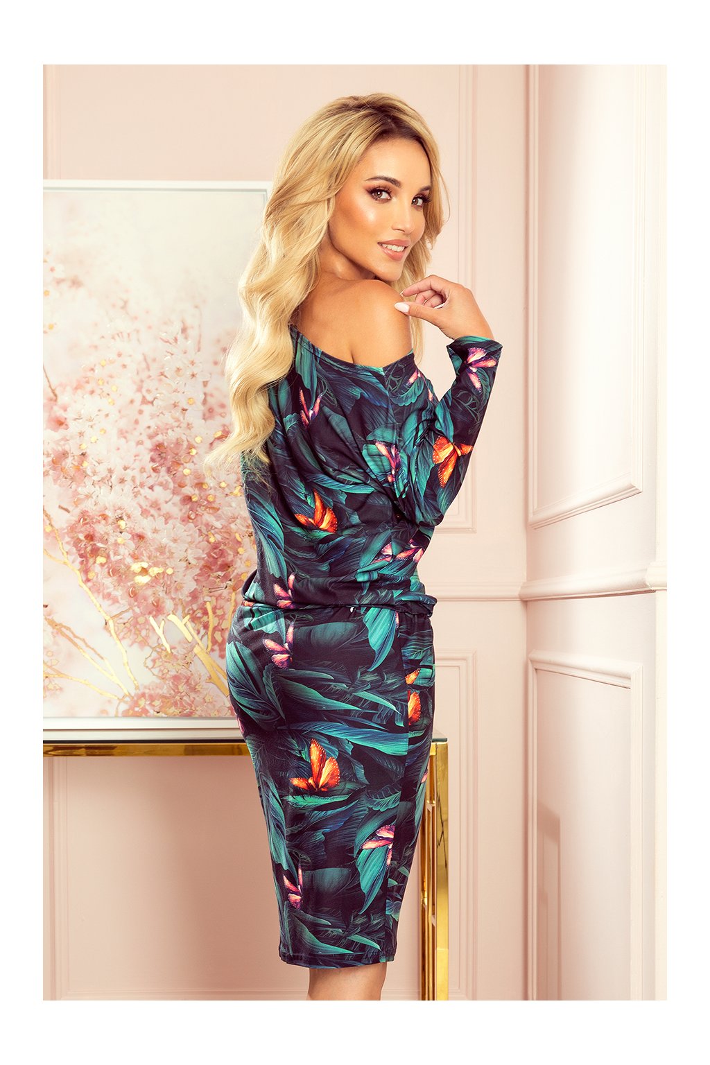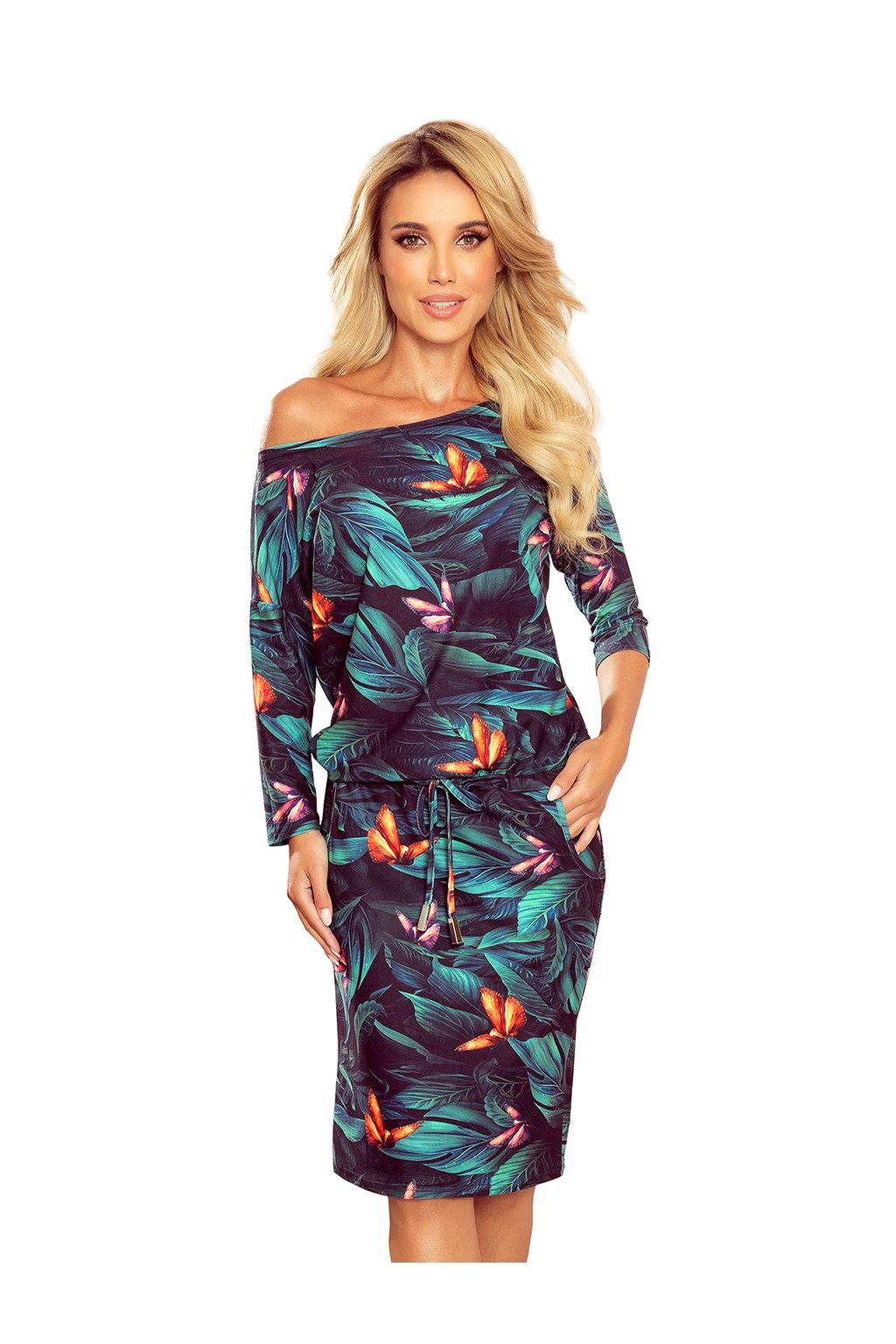 Sportovní šaty s 3/4 rukávy a kapsami - oranžové a růžové motýly na zelených listech. Vyrobeno z pružného materiálu. Polský produkt. Značka Numoco.