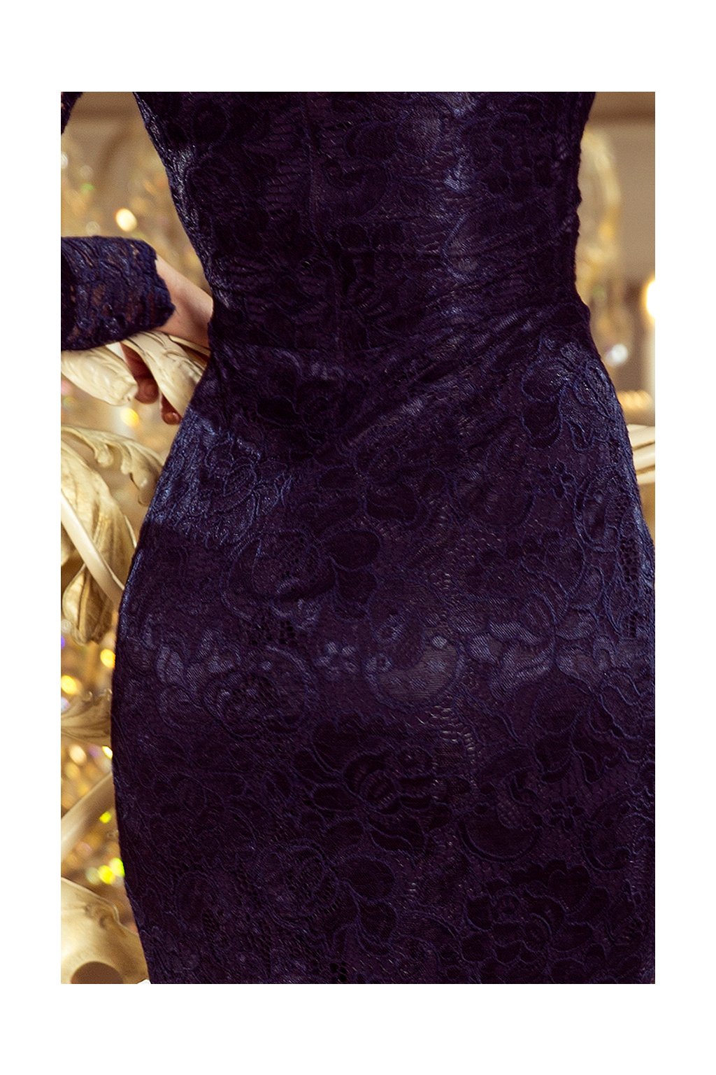 Tmavé modré krajkové šaty s výstřihem a dlouhými rukávy. Klasické a elegantní. Polská produkce. Numoco