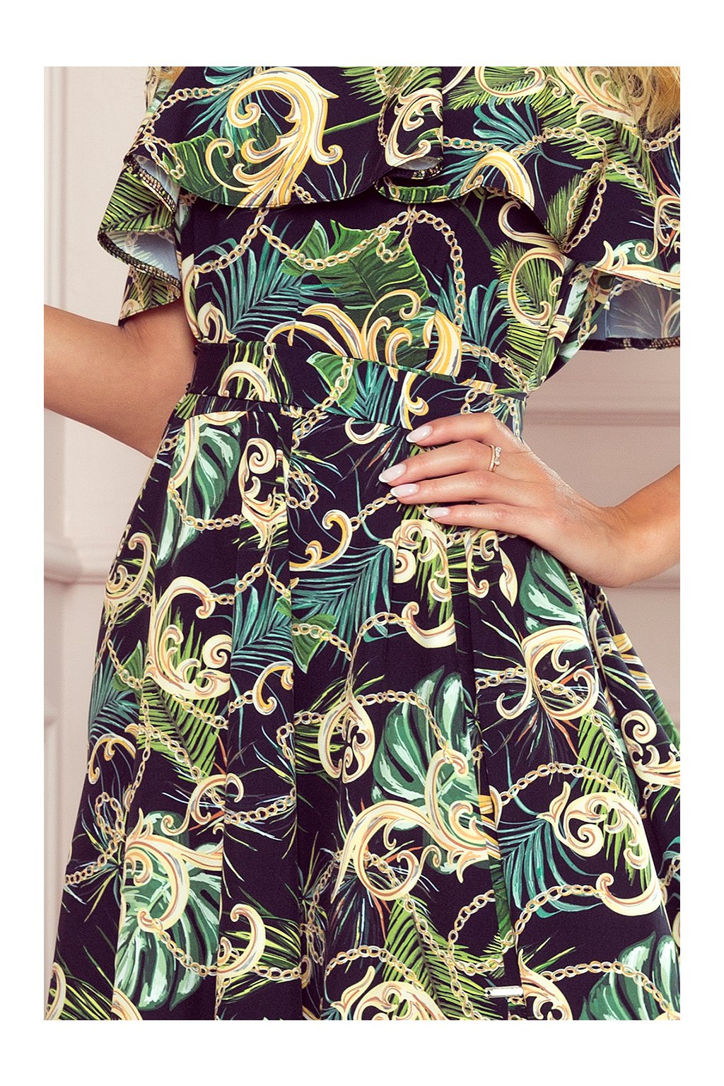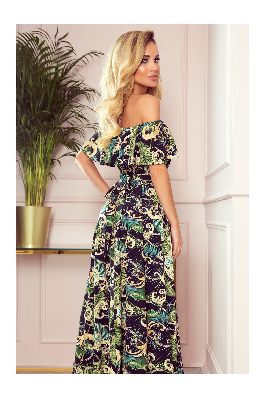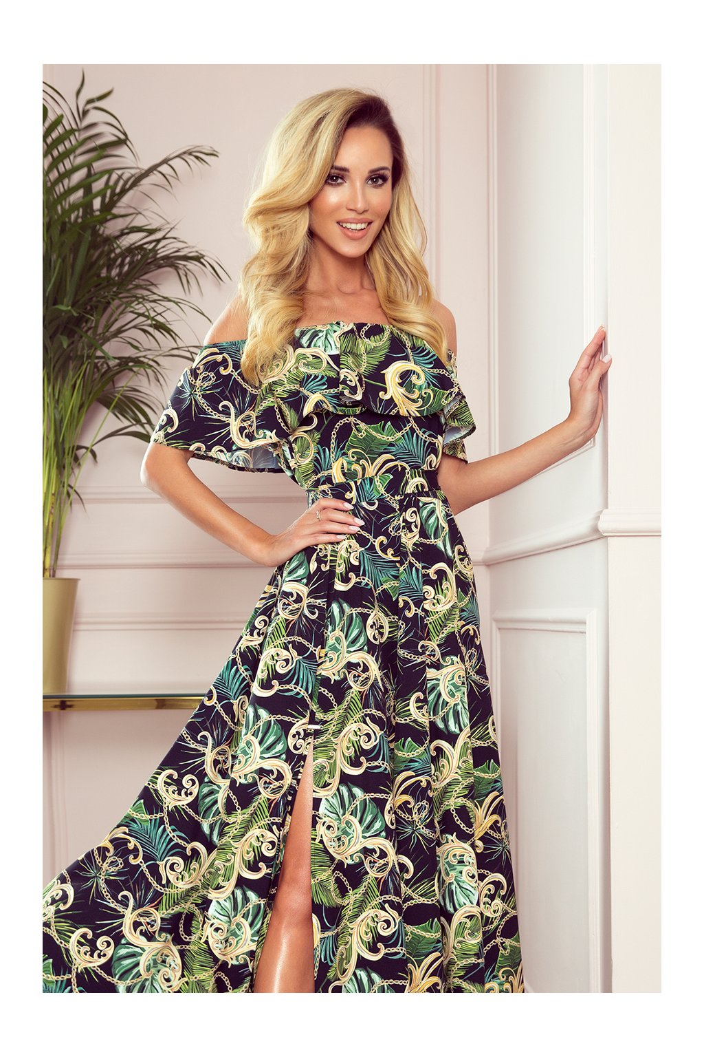 194-4 Dlouhé šaty s volánky - zelené listy a zlaté řetězy