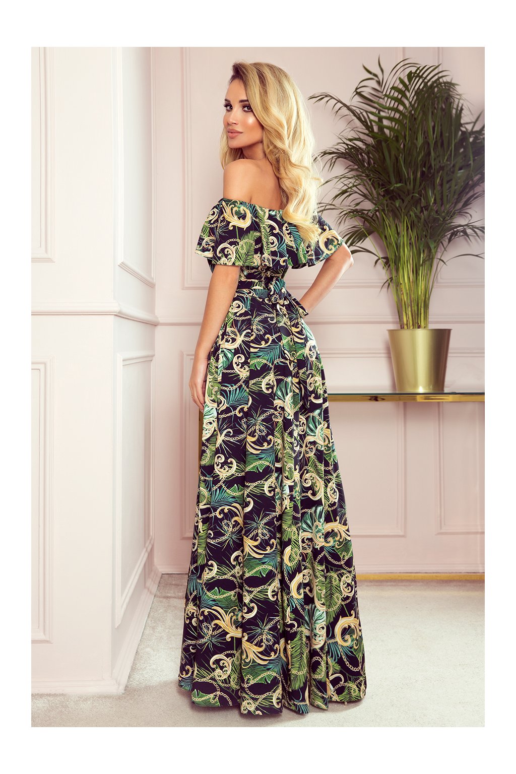 Šaty maxi s límcem - černé se zelenými listy a zlatými řetízky