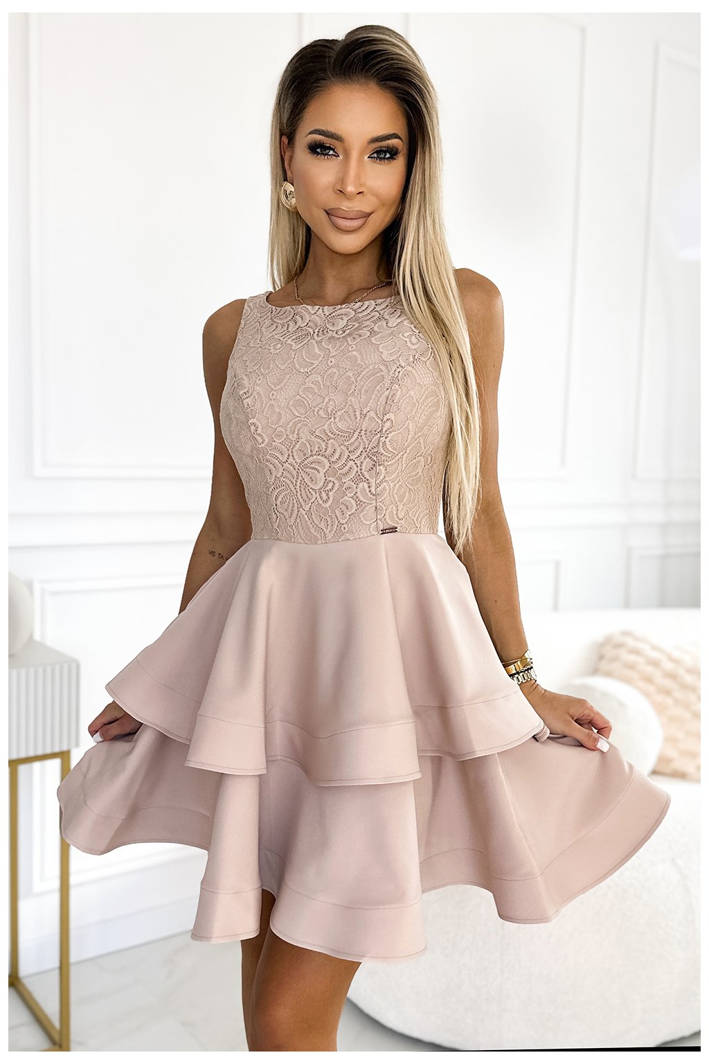 LAURA - šaty s výrazně rozšířenou sukní a elastickou krajkou. Zapínání vzadu na skrytý zip. Barva béžová. Značka Numoco. Polský výrobek.