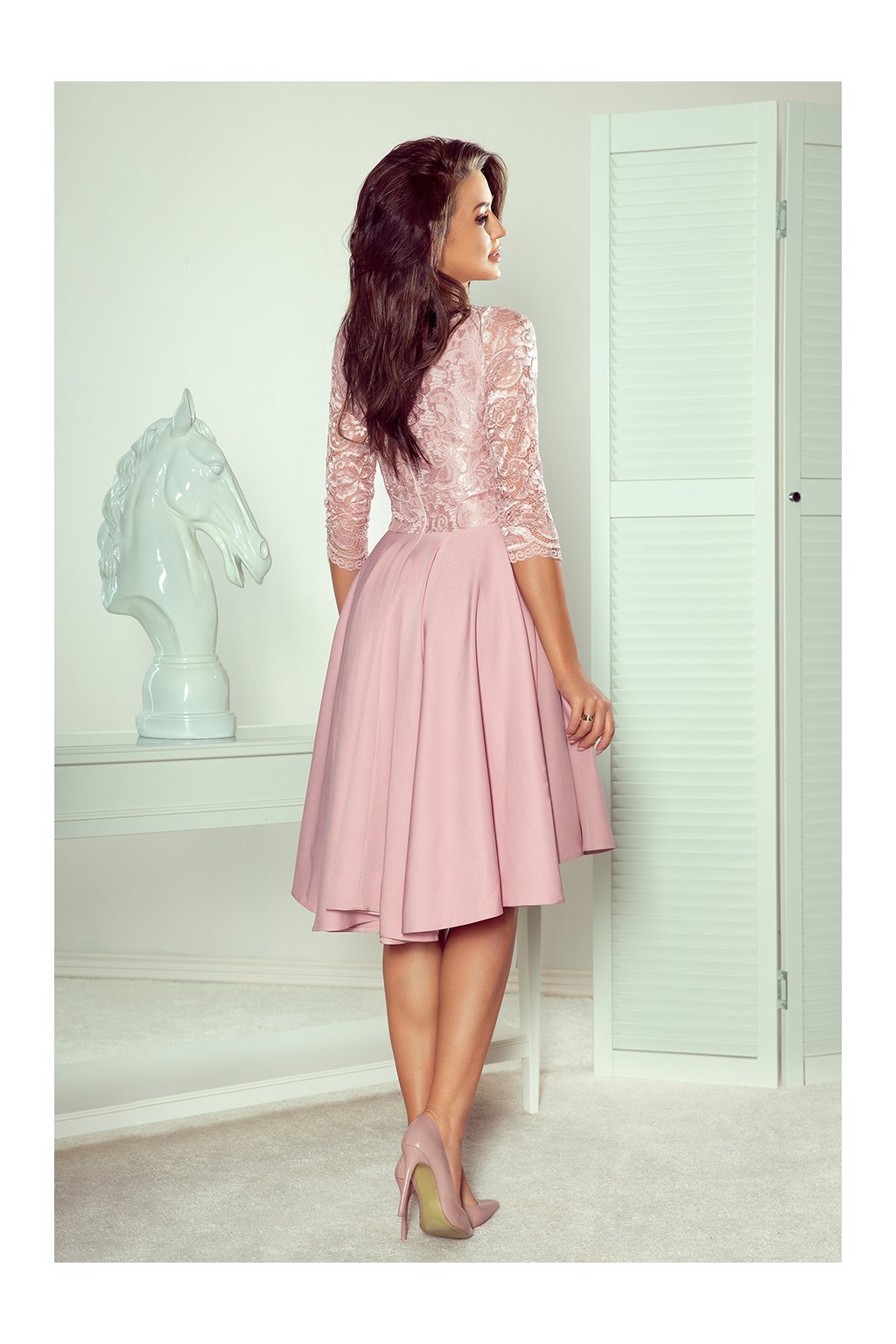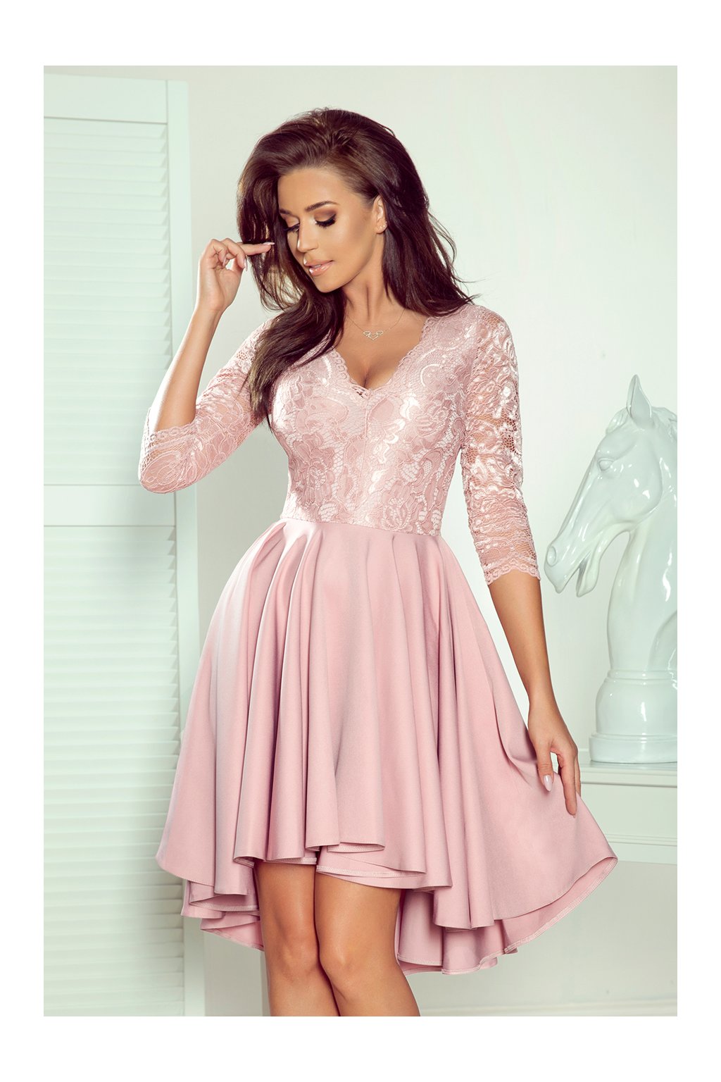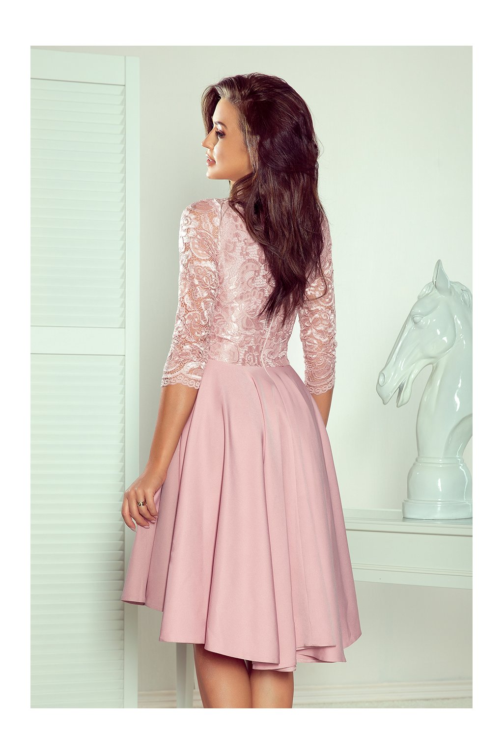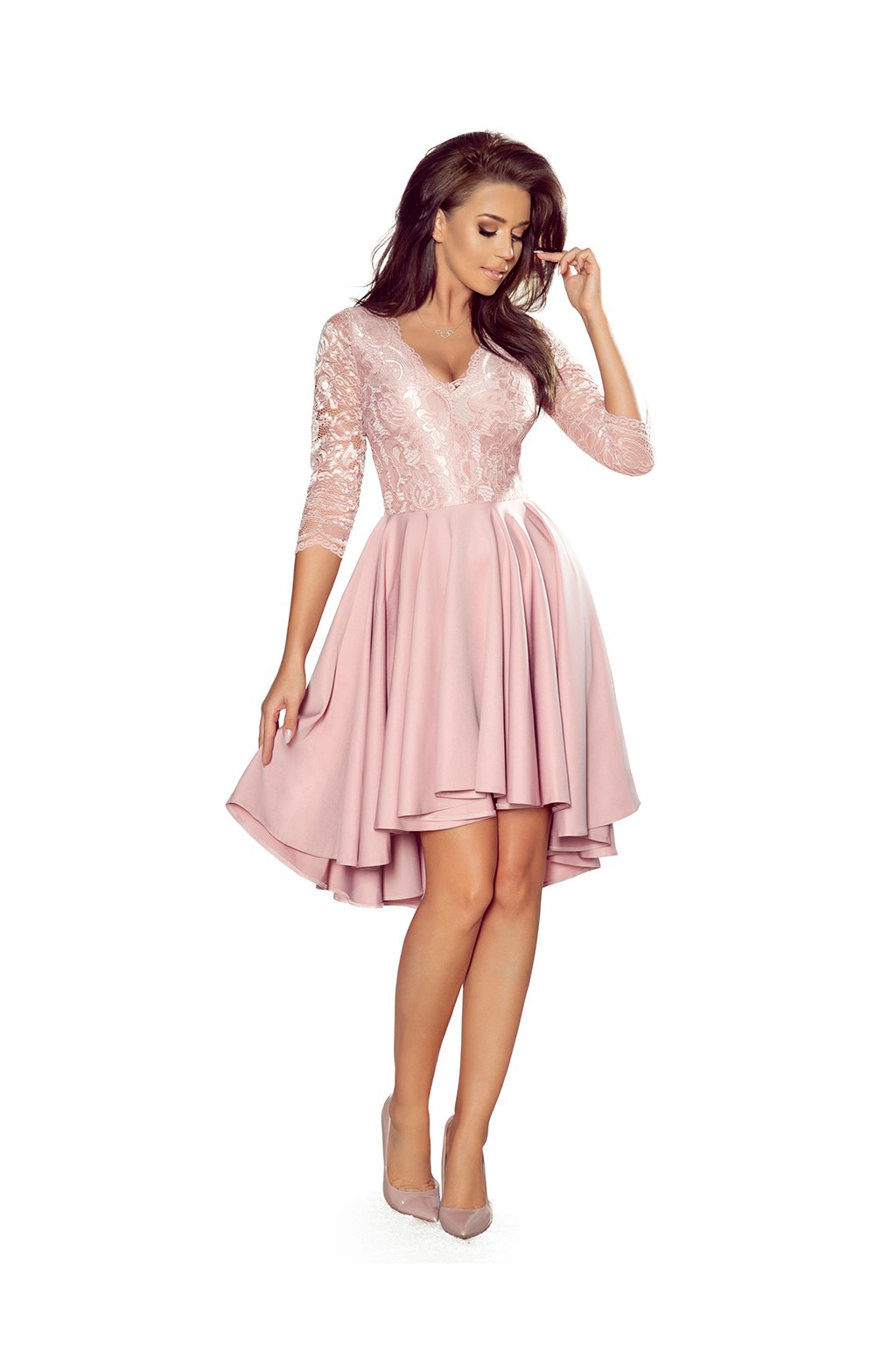 Nicolle - asymetrické exkluzivní šaty s delšími zády, 3/4 rukávy, výstřih a krajka - prášek růžový. Sukně s delším zádovým letem bude ideální pro tanec. Polská produkce. Numoco