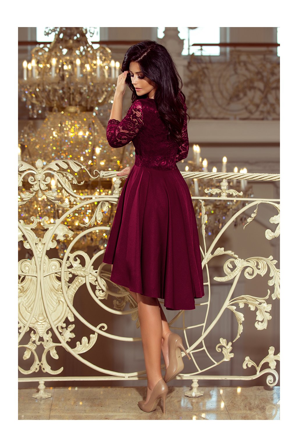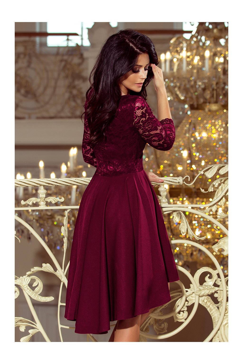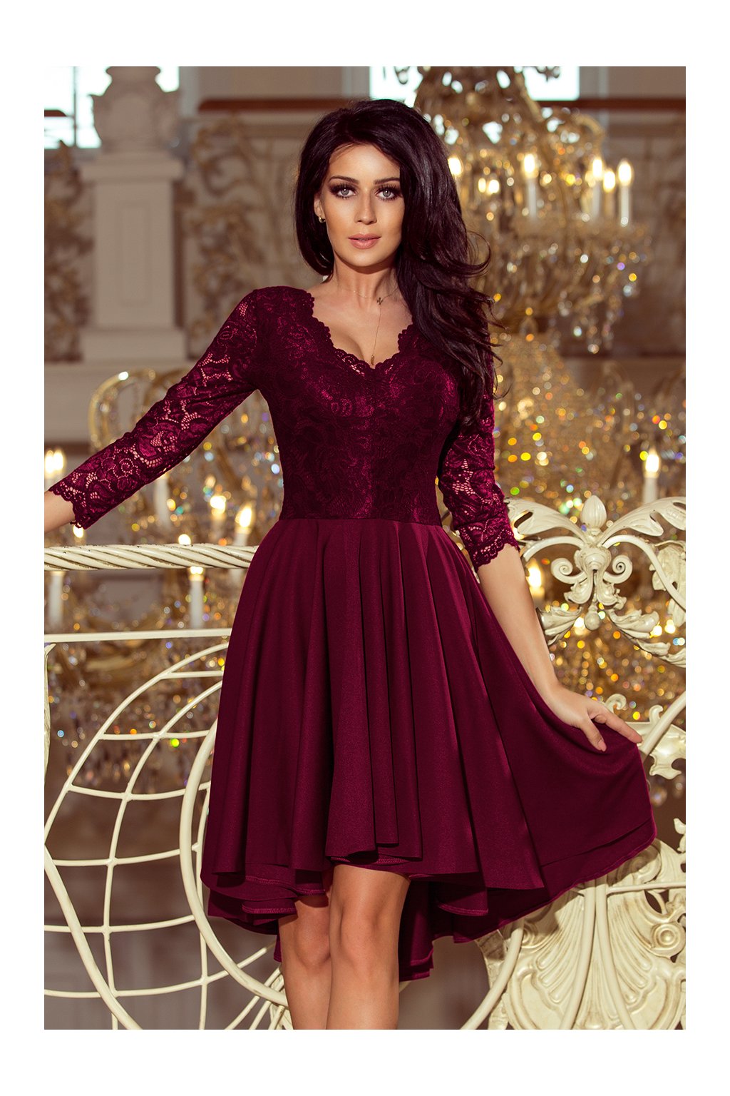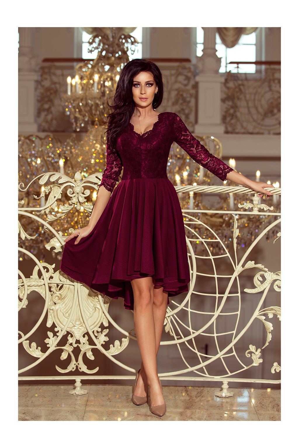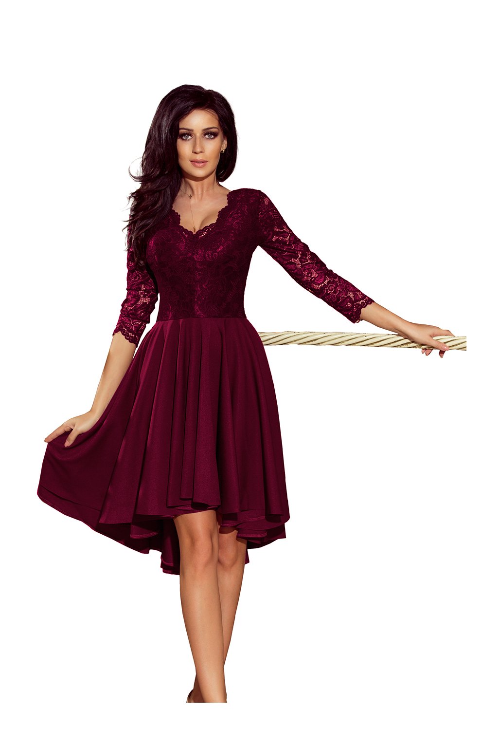 Nicolle - asymetrické exkluzivní šaty s delším zadním dílem, 3/4 rukávem, výstřihem a krajkou - švestková barva. Na tanec se bude skvěle hodit sukně s delším zadním dílem. Polská výroba. Značka Numoco.