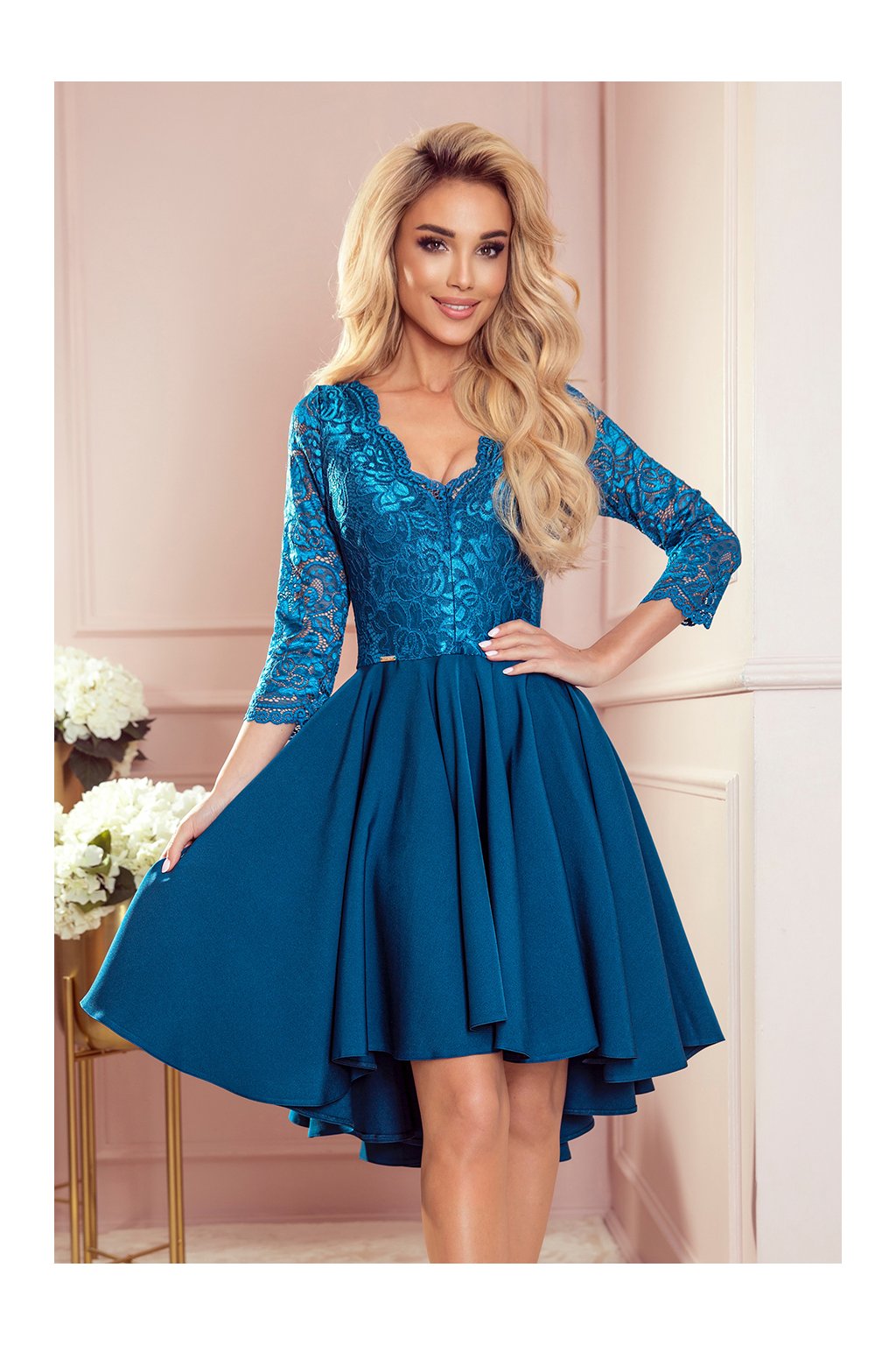 Nicolle - asymetrické exkluzivní šaty s delšími zády, 3/4 rukávy, výstřih a krajka. Barva moře. Sukně s delším zádovým letem bude ideální pro tanec. Polská produkce. Numoco