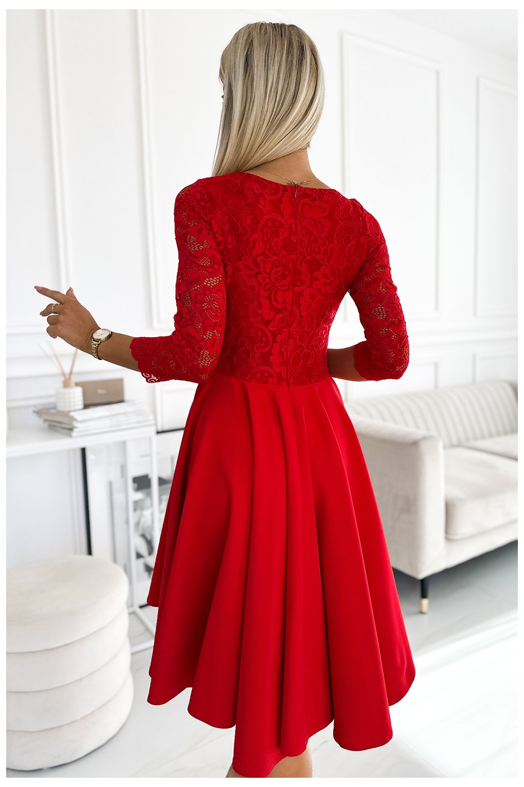 Nicolle - exkluzivní červené asymetrické šaty s delšími zády, rukávy, výstřihem a krajkou. Na tanec se skvěle hodí sukně s delším zadním dílem. Značka numoco. Polská výroba.