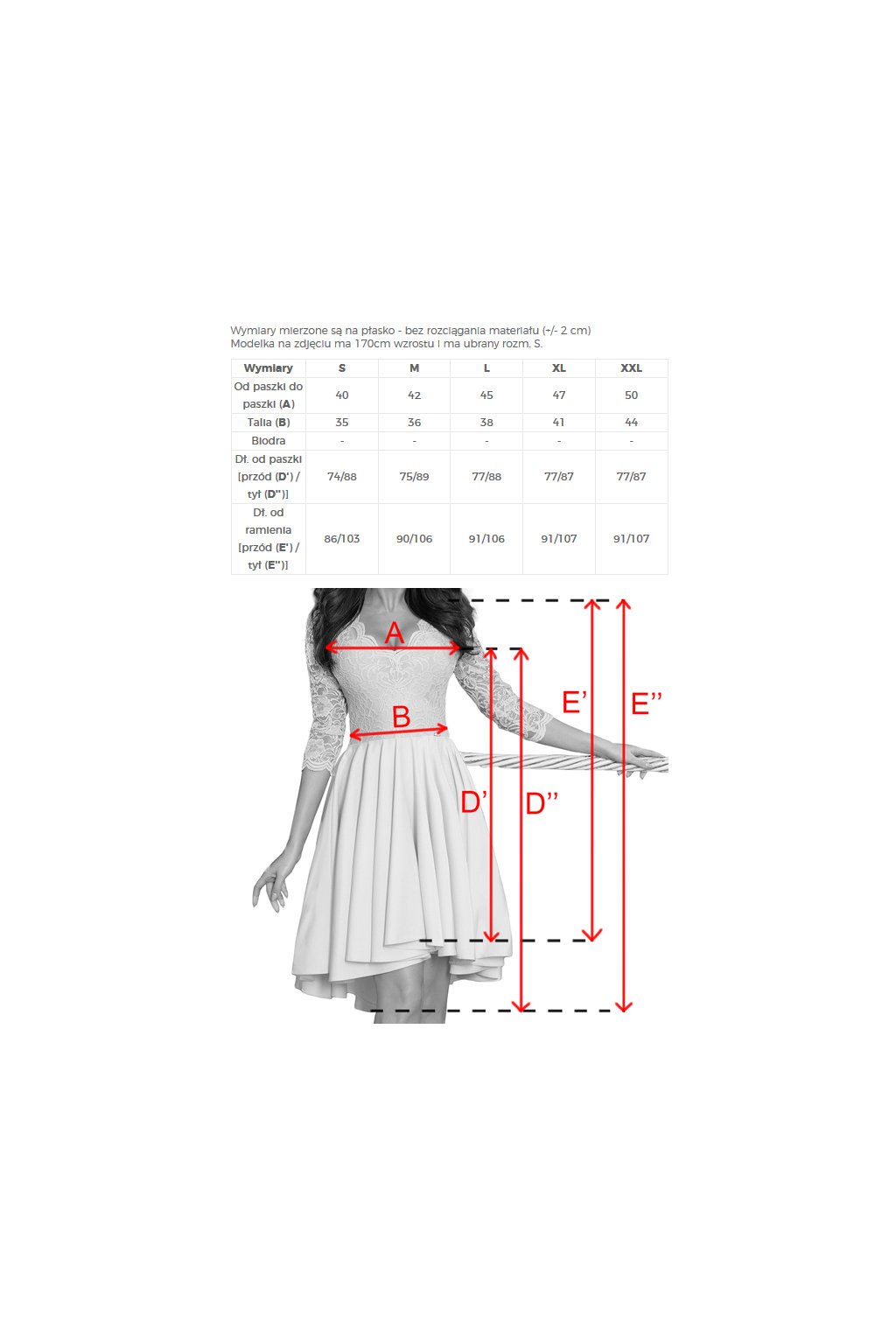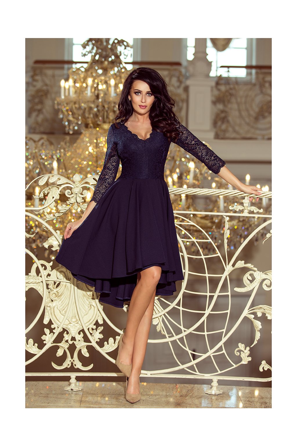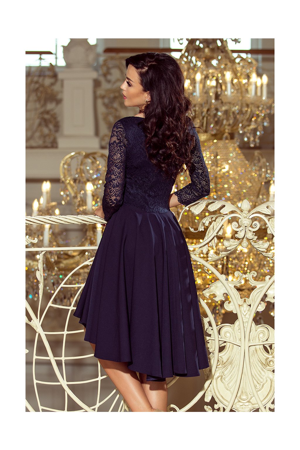 Nicolle - asymetrické exkluzivní šaty s delšími zády, 3/4 rukávy, výstřih a krajka - tmavě modrá. Sukně s delším zádovým letem bude ideální pro tanec. Polská produkce. Numoco