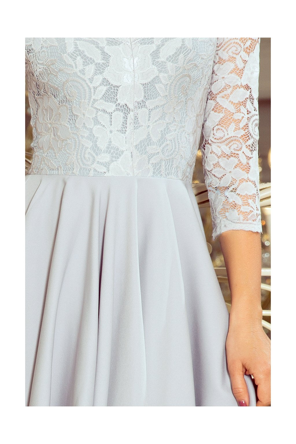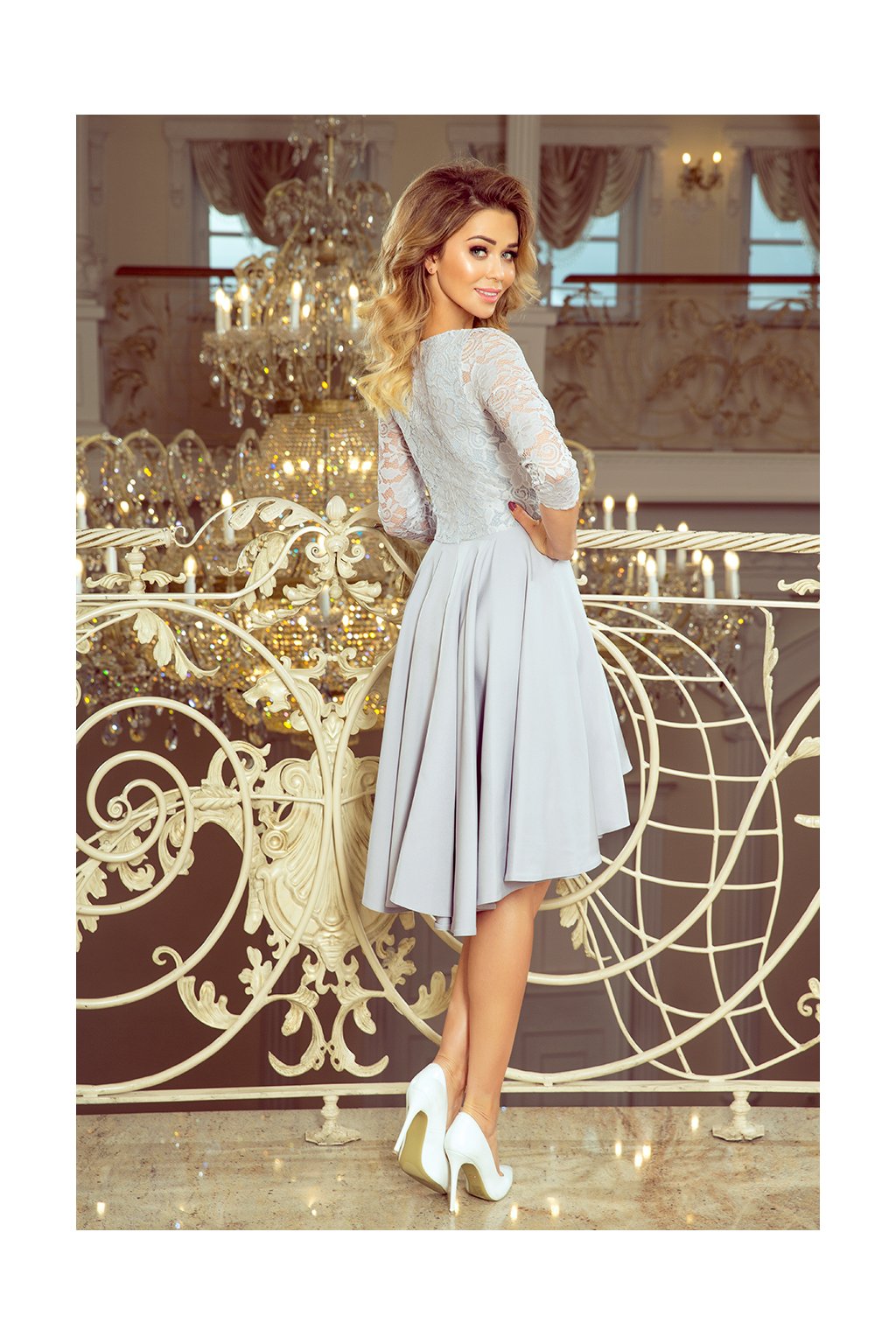Nicolle - asymetrické exkluzivní šaty s delšími zády, 3/4 rukávy, výstřih a krajka - sedé. Sukně s delším zádovým letem bude ideální pro tanec. Polská produkce. Numoco