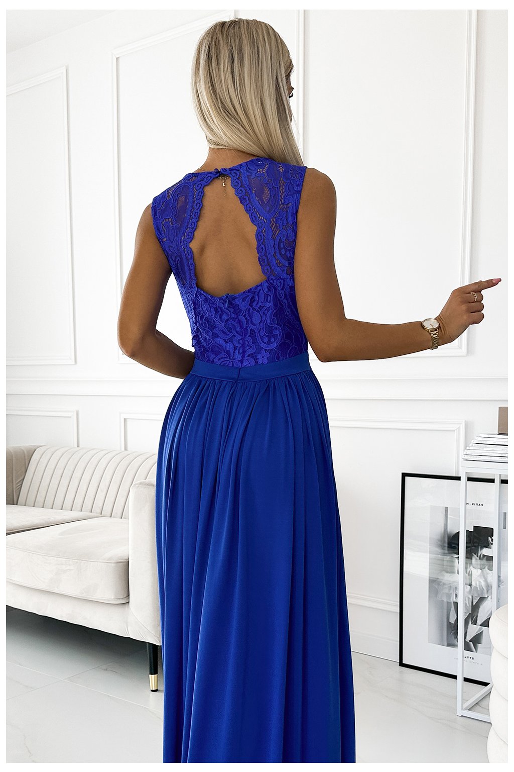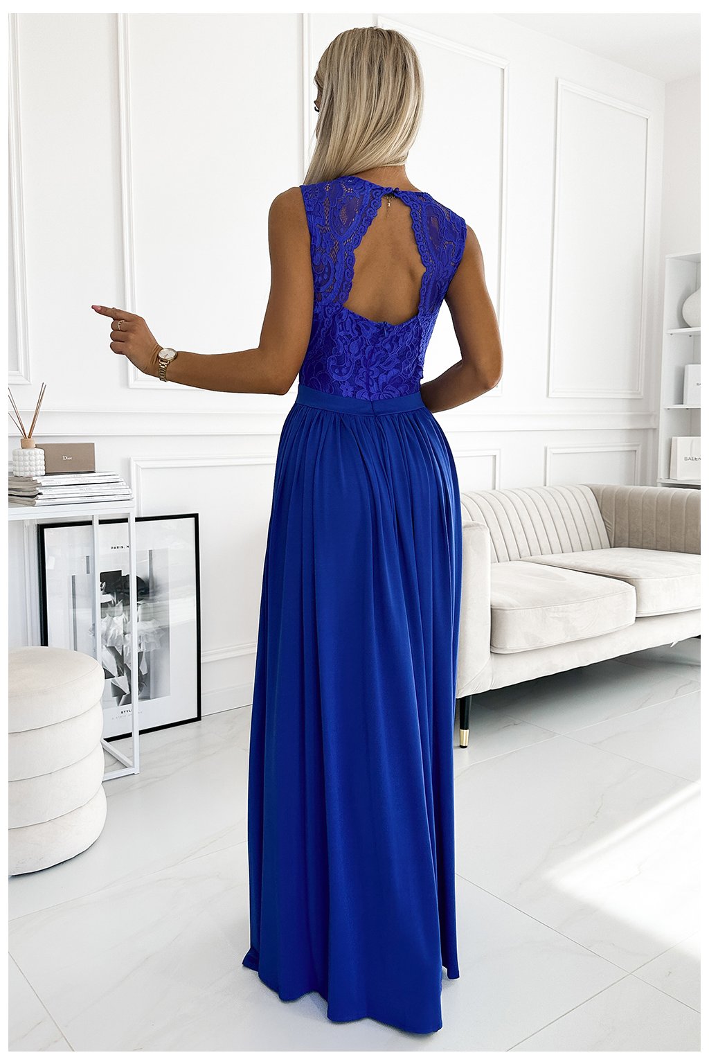 Modré dlouhé maxi šaty s krajkovým výstřihem a otevřenými zády. Šaty krásně odhalují dekolt. Ideální na Silvestra, karneval, ples, svatbu nebo jiné významné události. Polský výrobek. Značka numoco.