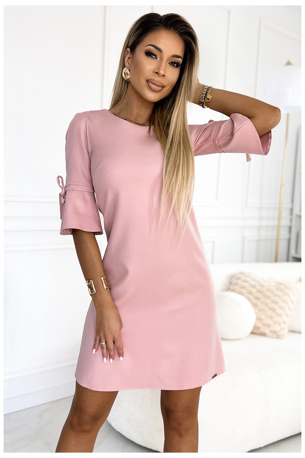 Neva - pohodlné trapézové šaty s rozšířenými rukávy a mašlemi - velmi ženské. Barva - pudrově růžová se třpytkami. Polský výrobek. Značka numoco.