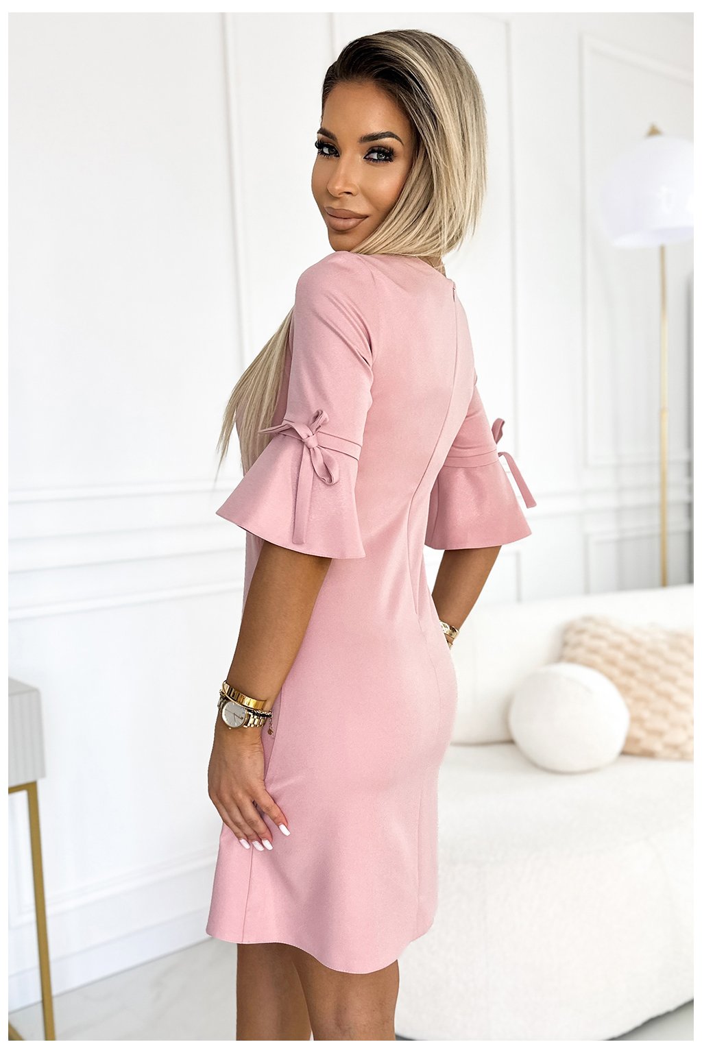 217-9 NEVA Trapézové šaty s mašlí - pudrově růžová se třpytkami