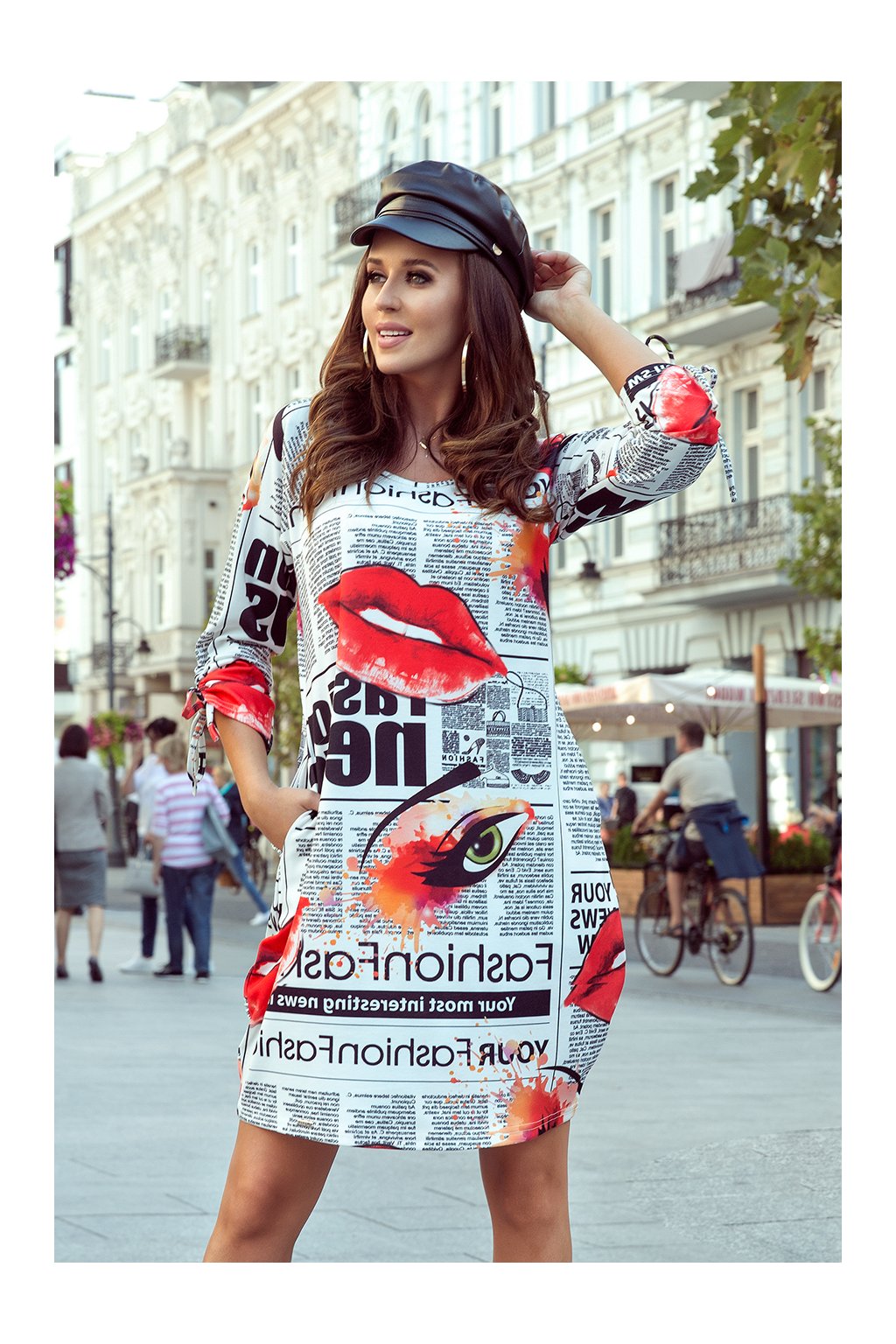 Sophie - pohodlné šaty s kapsami a vázání na rukávech. Polský produkt. Vyrobeno z příjemného na dotek teplého materiálu s módním vzorem novin. numoco.