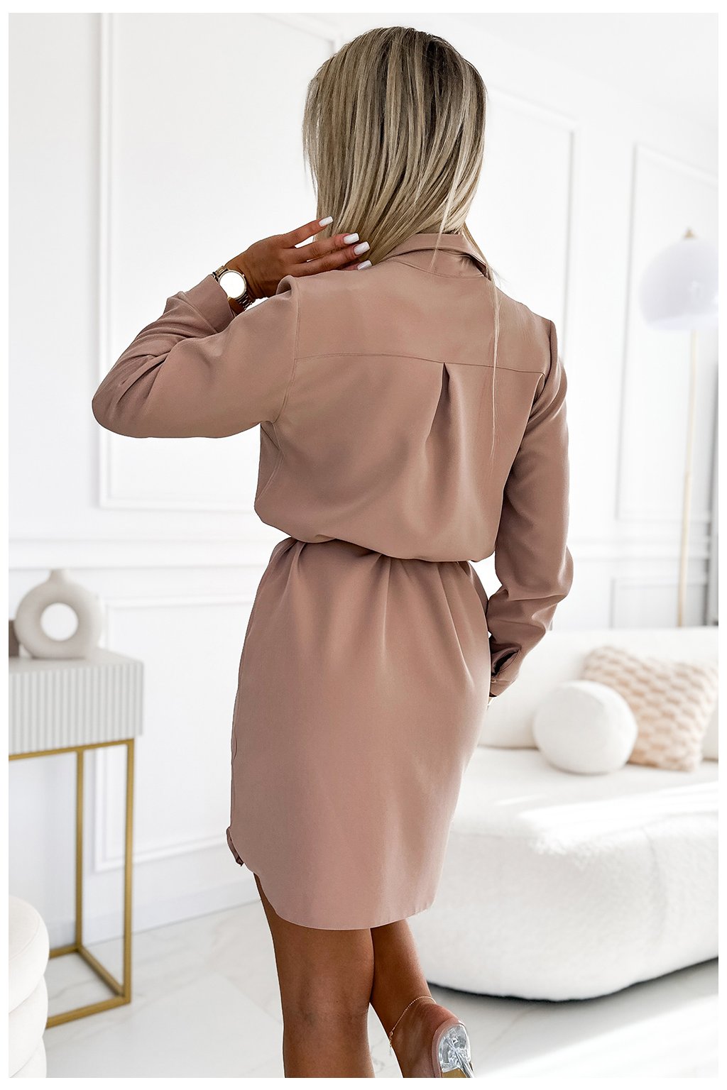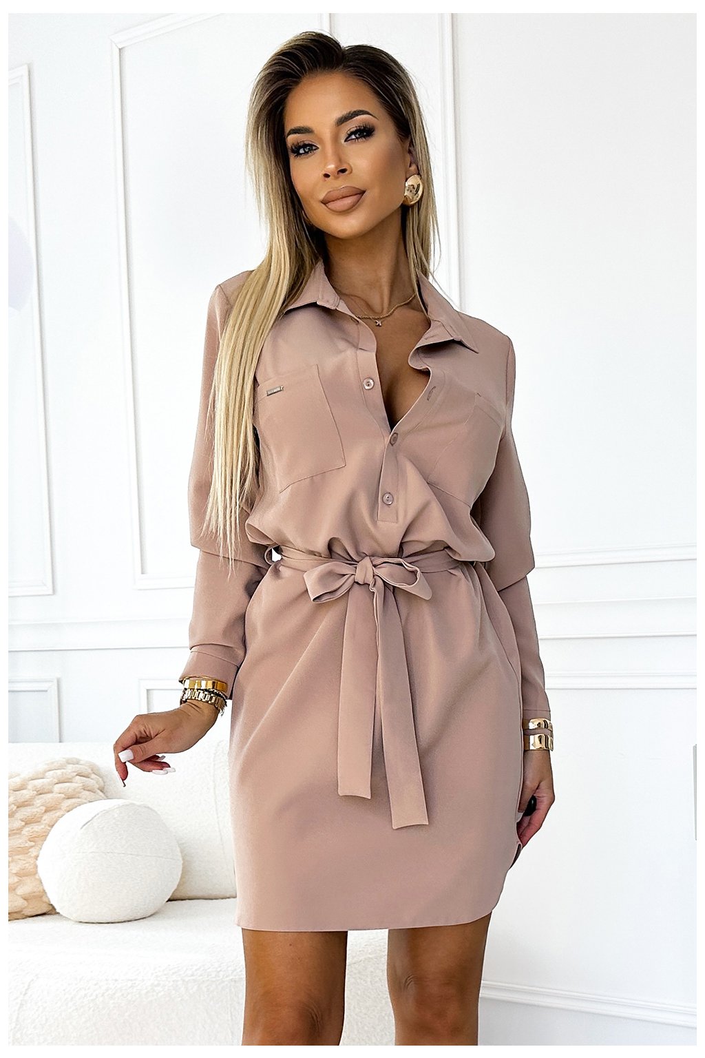 Camille - Košilové šaty s kapsami a zavazováním - béžové. Polský výrobek. Značka numoco.