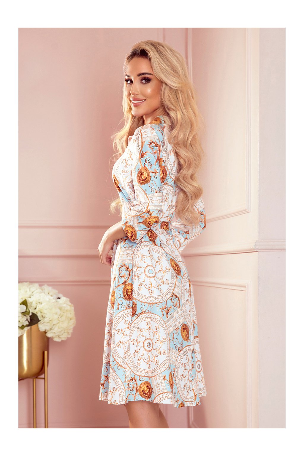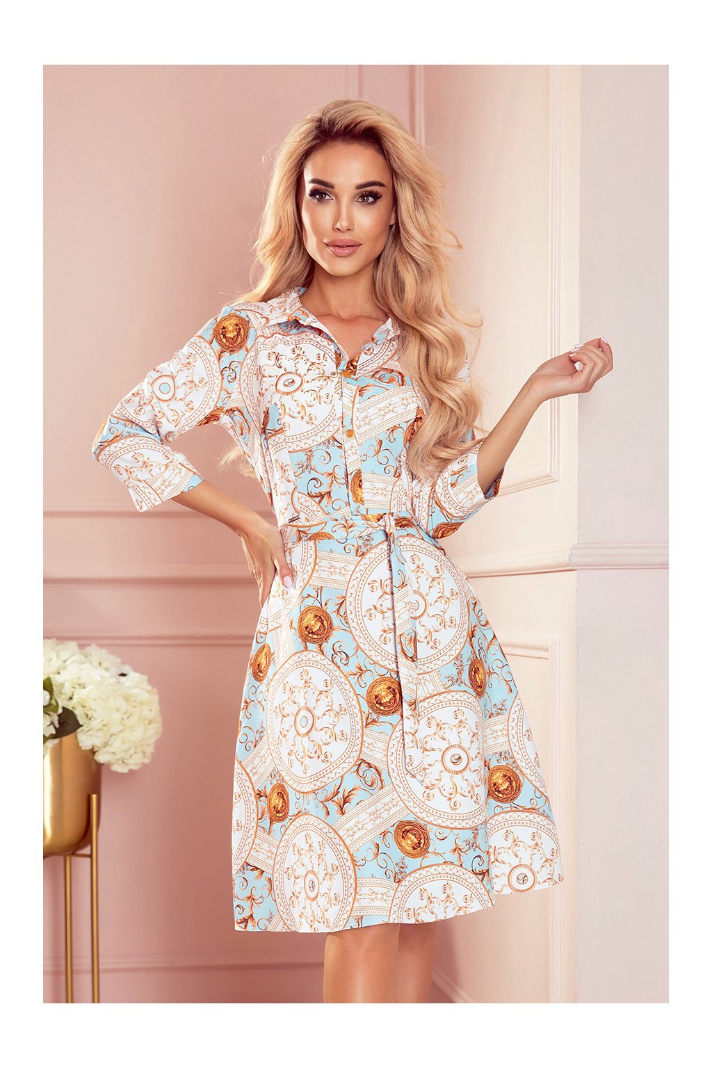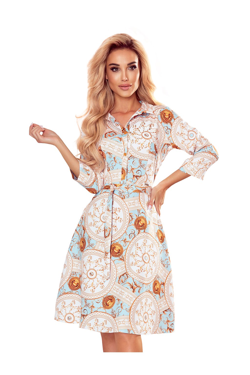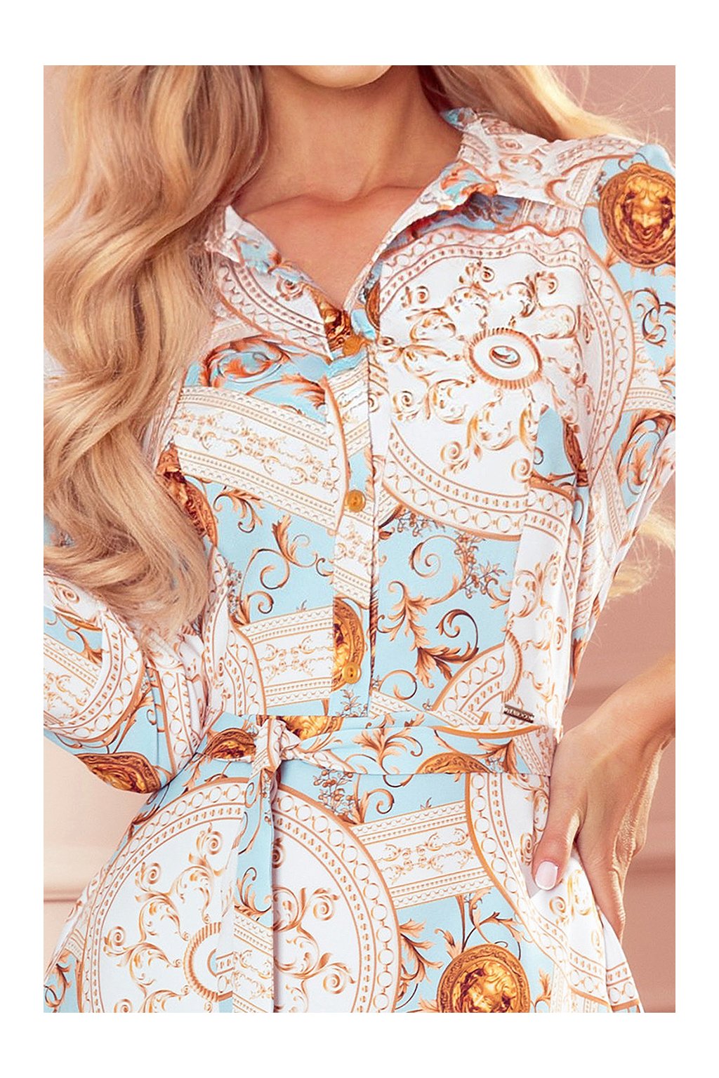 SANDY Košilové rozevláté šaty s bílými a zlatými kruhy na tyrkysovém pozadí. Vyrobeno z příjemného na dotek, málo elastického materiálu (95% polyester, 5% elastan). Značka Numoco.