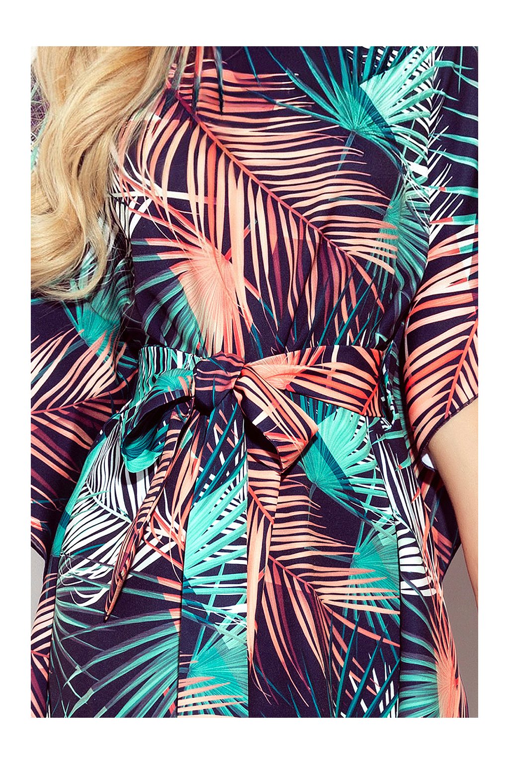 SOFIA Motýlí šaty s páskem - palmové listy na tmavě modrém podkladu. Vyrobeno z materiálu příjemného na dotek. Značka Numoco. Polská výroba.