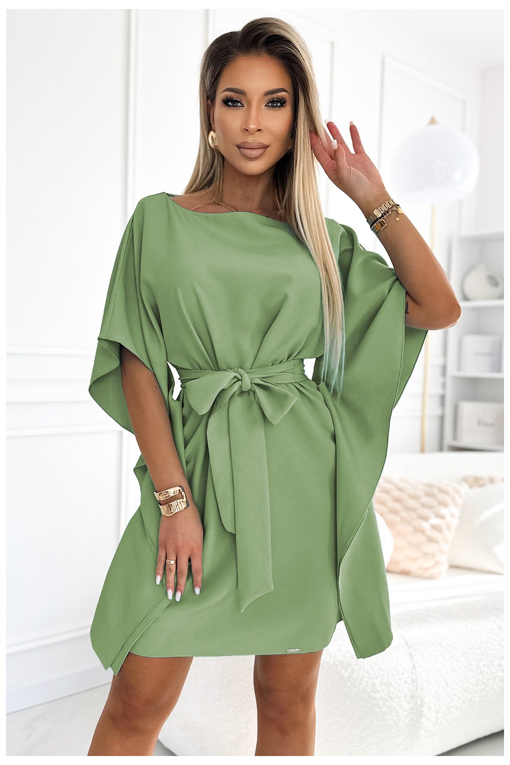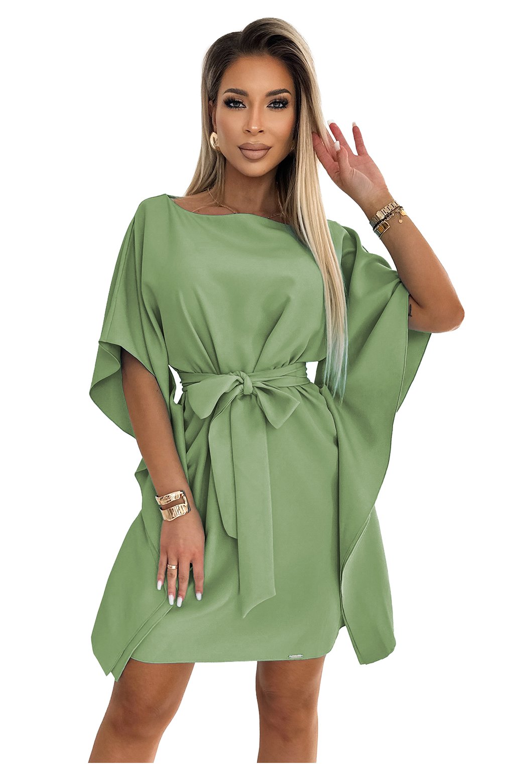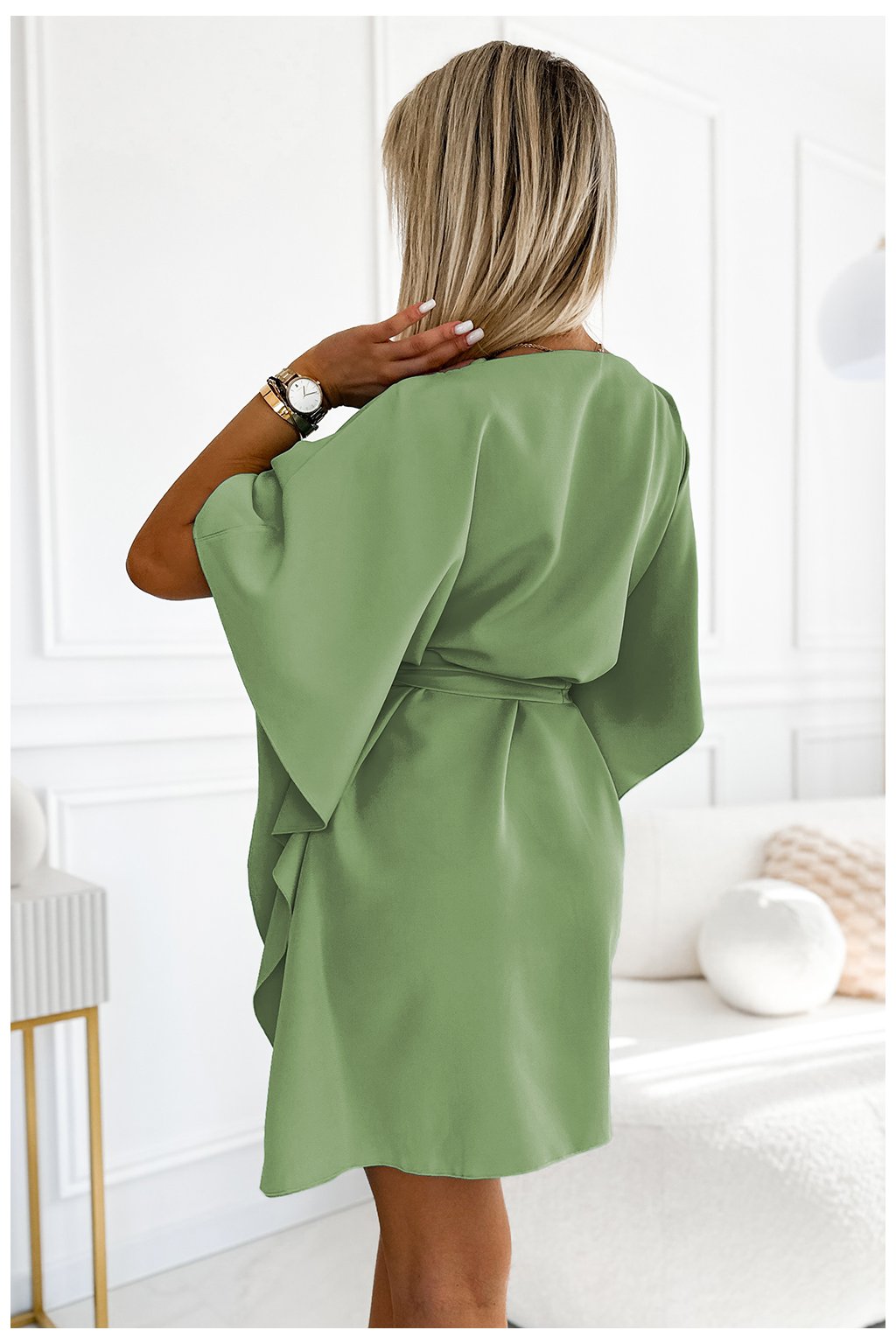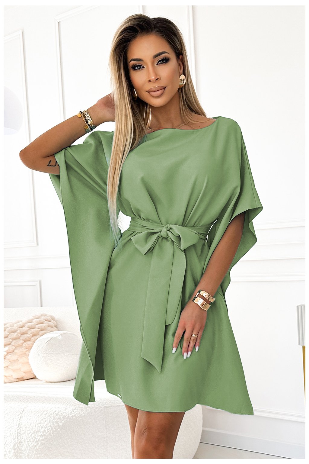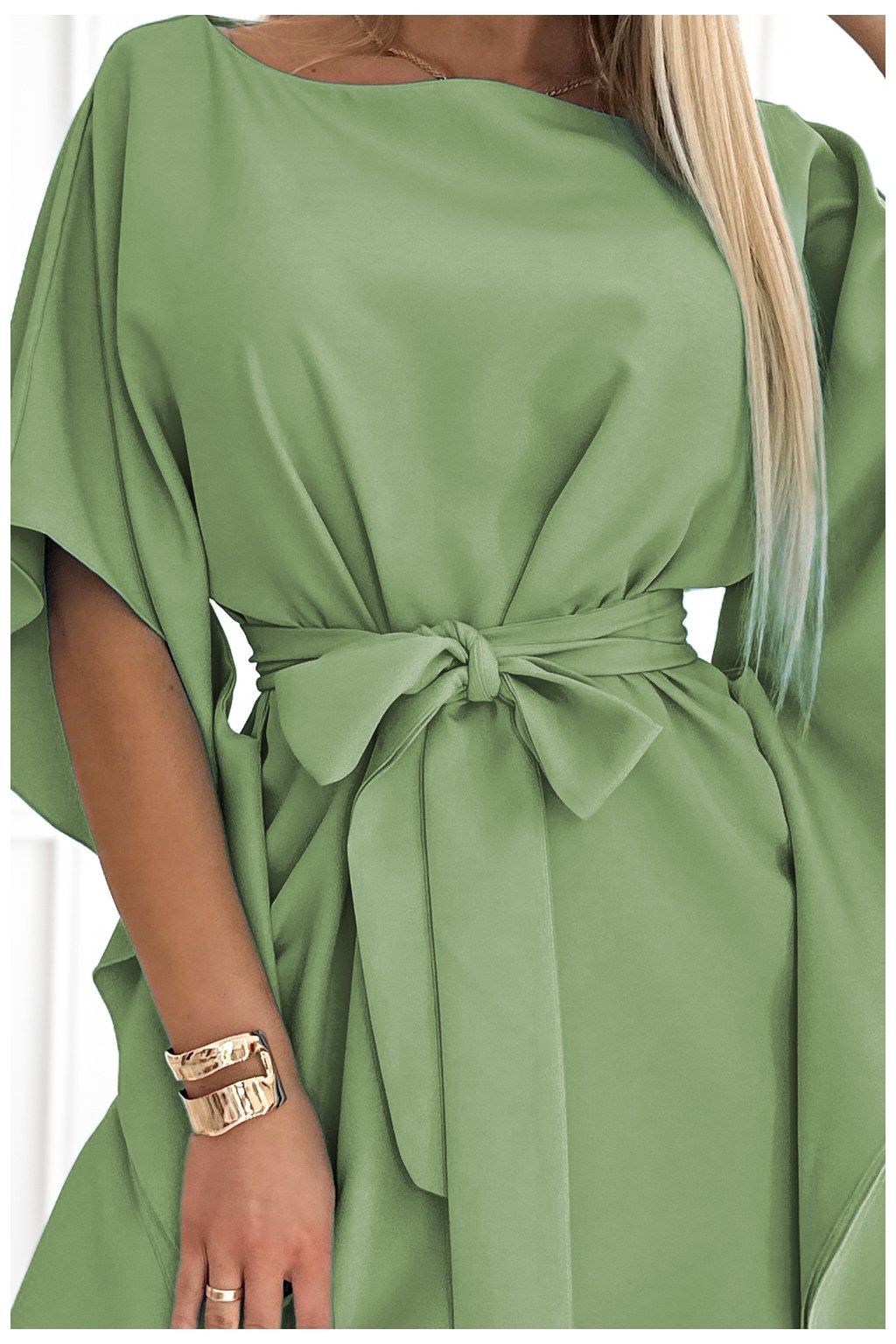SOFIA Motýlí šaty s páskem - olivová barva. Vyrobeno z materiálu příjemného na dotek. Značka numoco. Polská výroba.