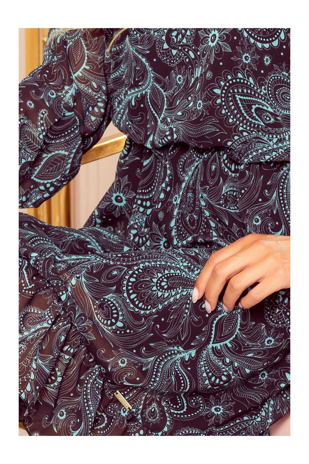 BAKARI - šifónové šaty s volánkami, výstřihem a elastickým pasem. Tyrkysový orientální vzor na černém pozadí. Polská produkce. Značka Numoco.