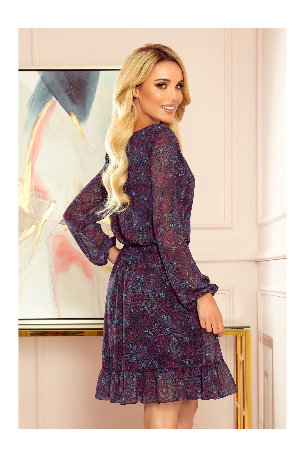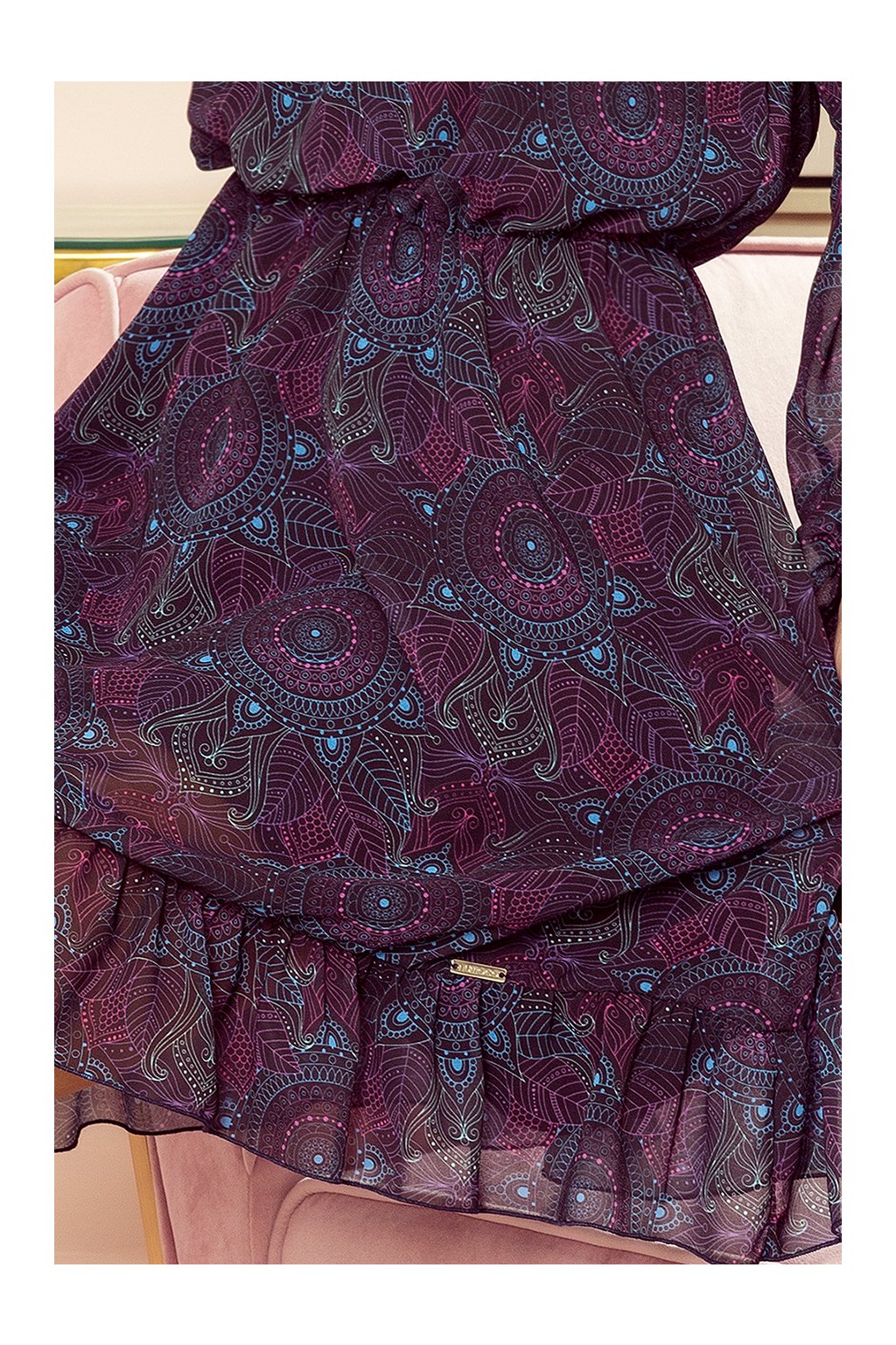 BAKARI - šifónové šaty s volánkami, výstřihem a elastickým pasem. Růžové a modré mandaly na tmavém pozadí. Polská produkce. Značka Numoco.