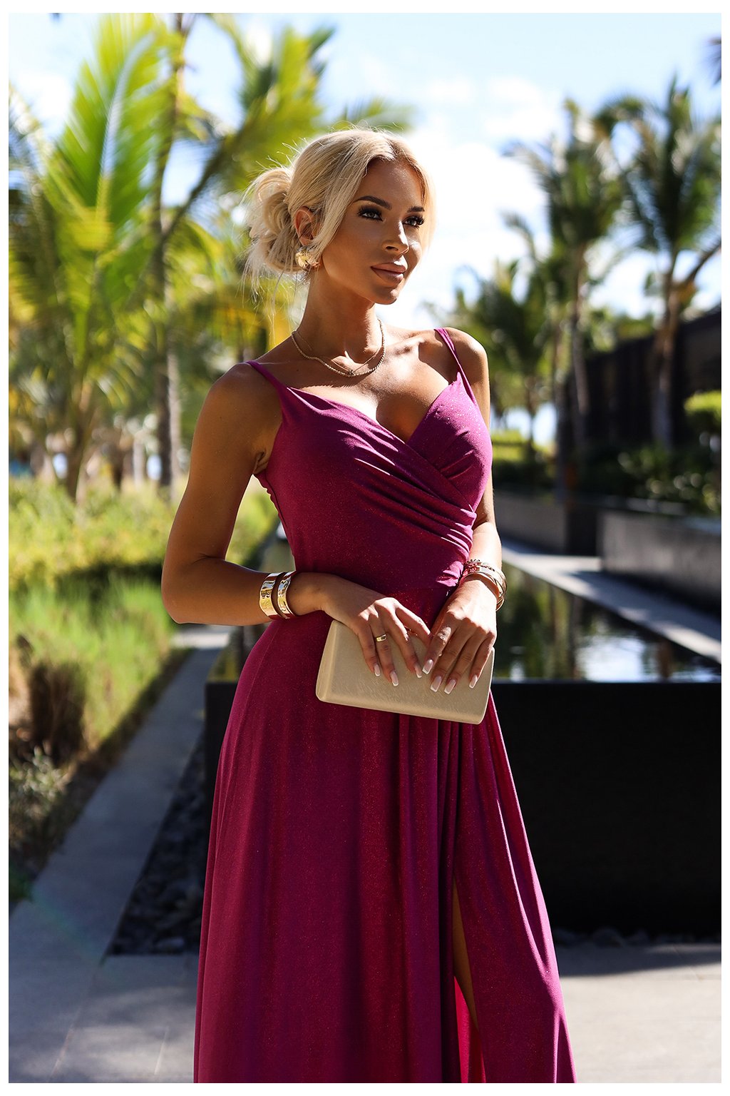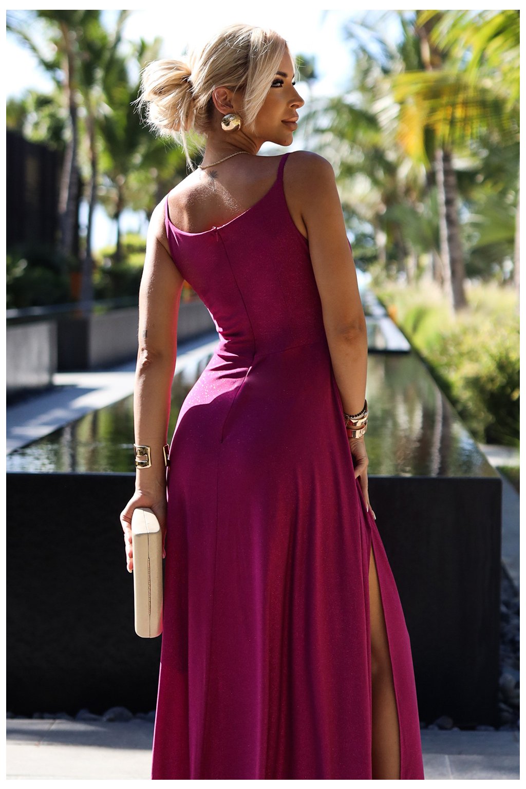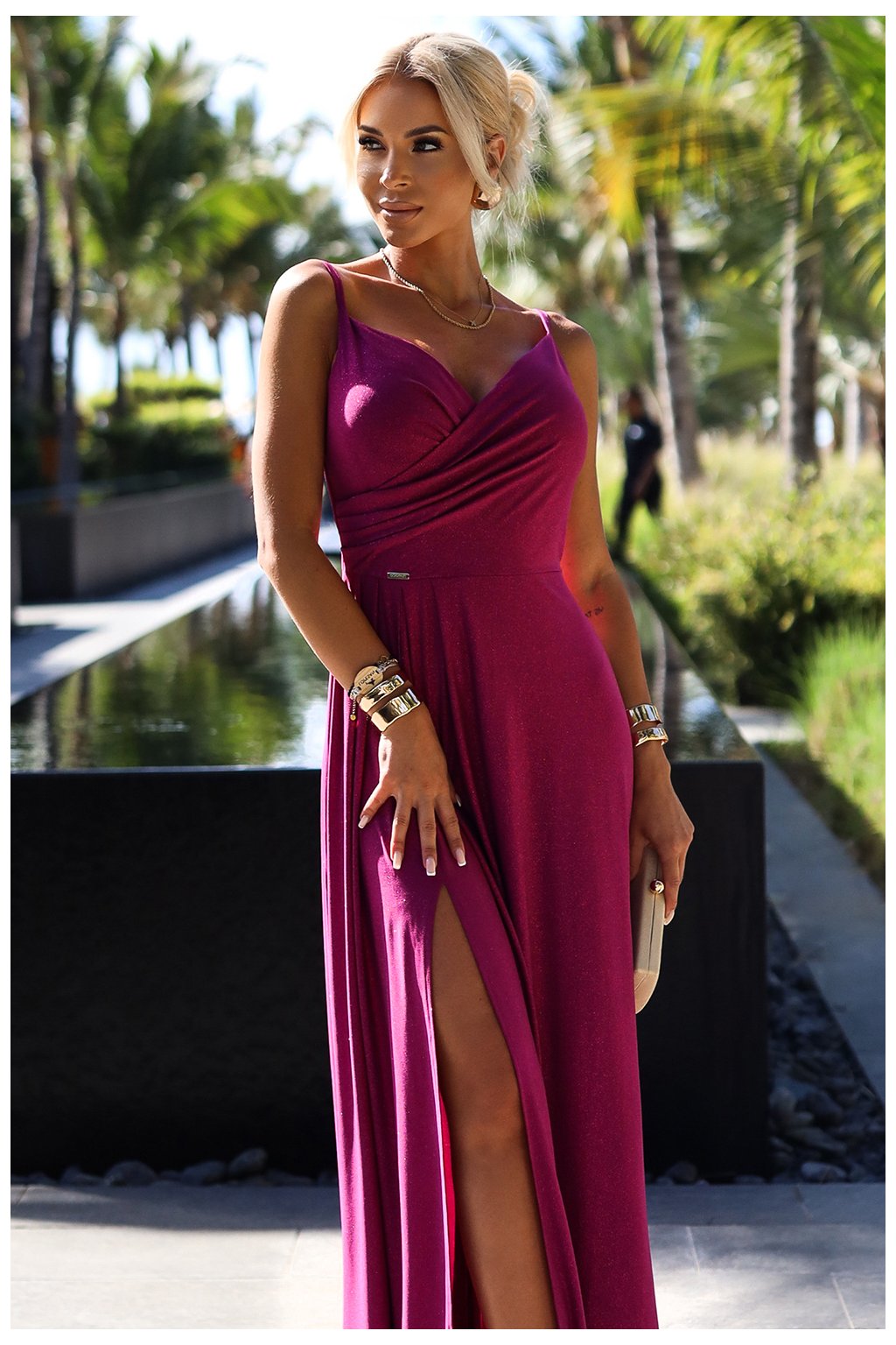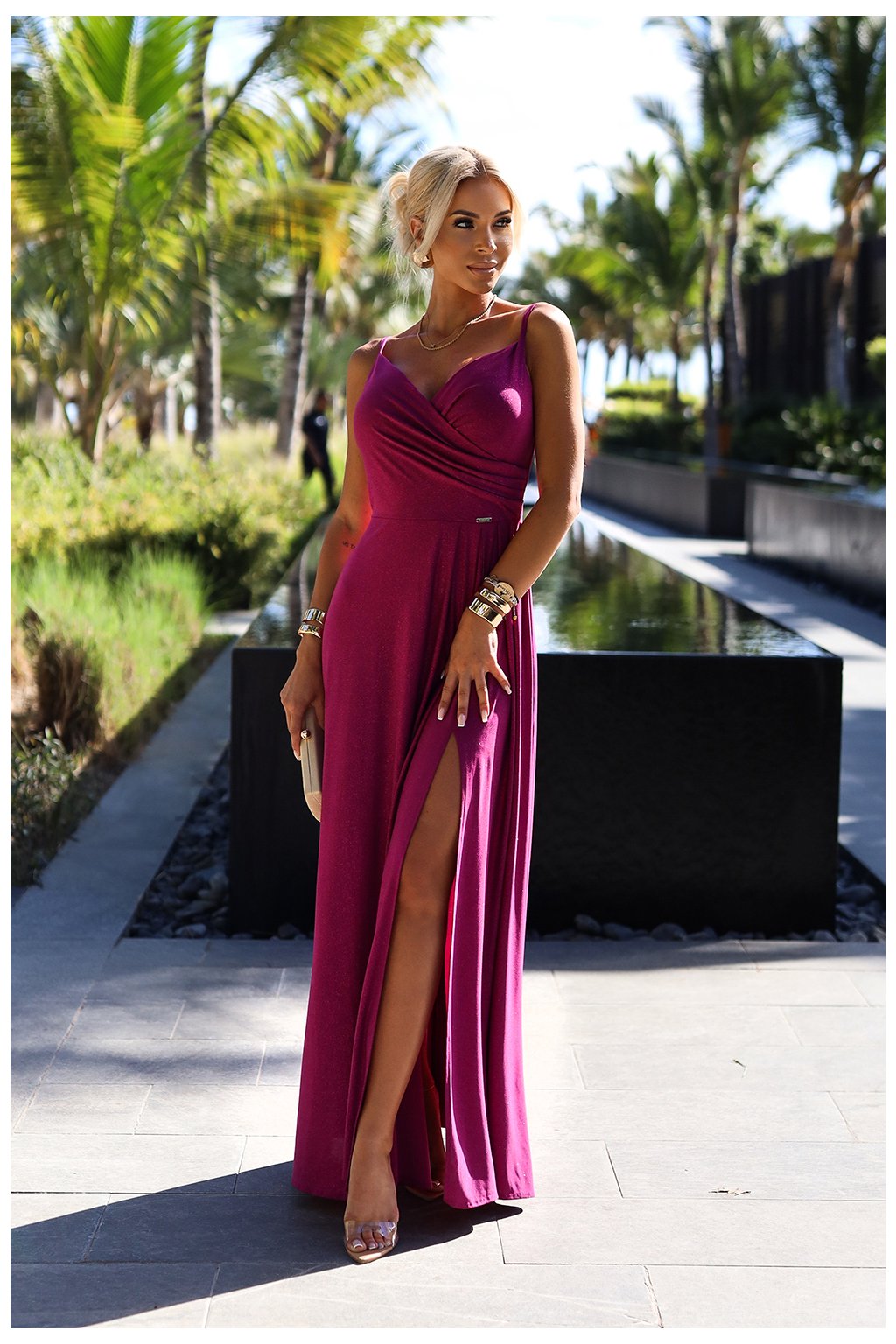 Chiara - elegantní maxi dlouhé lesklé šaty na ramínka. Krásně tvarovaný výstřih a rozparek na sukni vytvářejí neobvyklou kompozici. Vyrobeno ze třpytivého, pružného fuchsiového materiálu. Šaty ideální na svatby, Silvestra, ples, karneval a další významné příležitosti. Polská výroba. Značka Numoco.