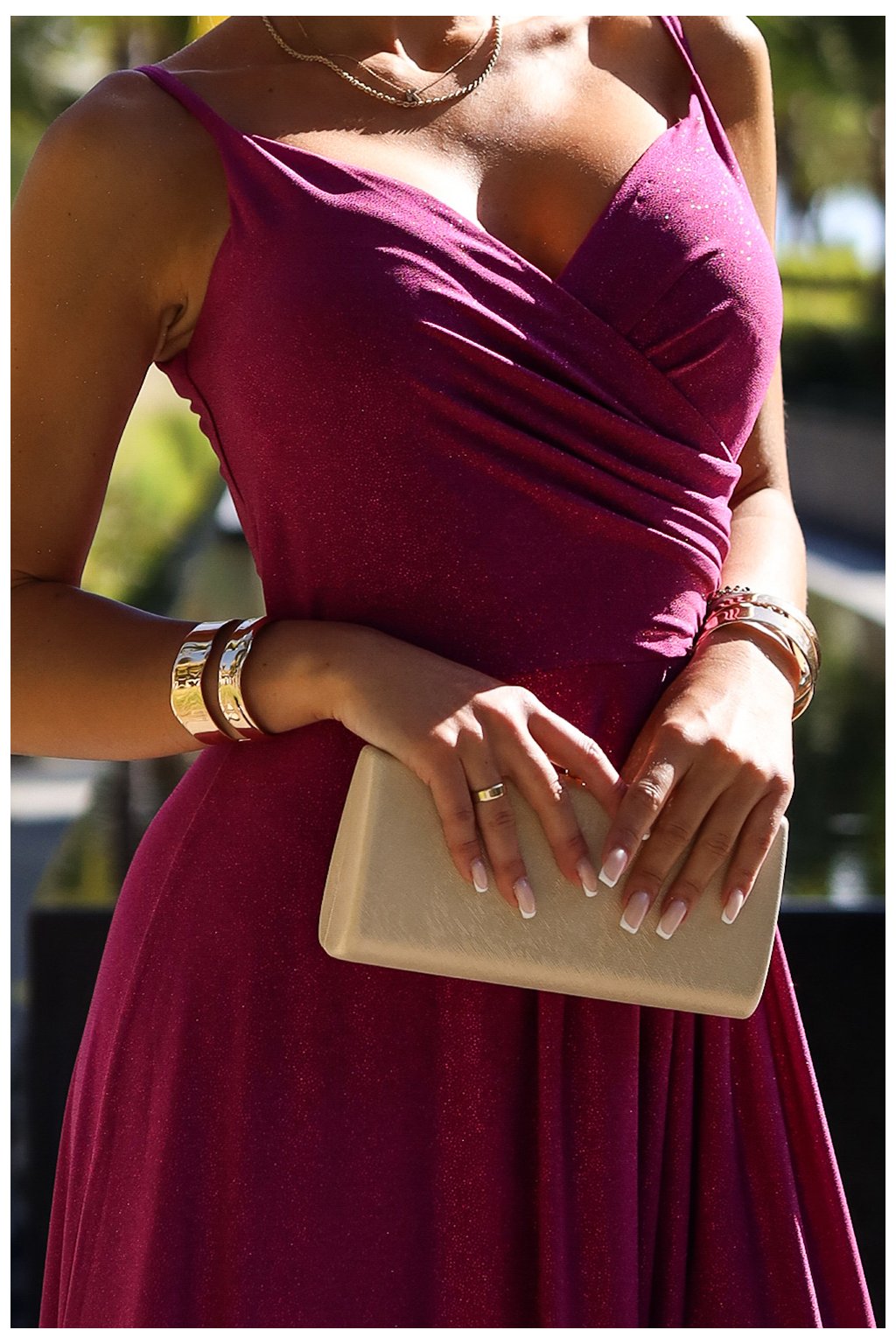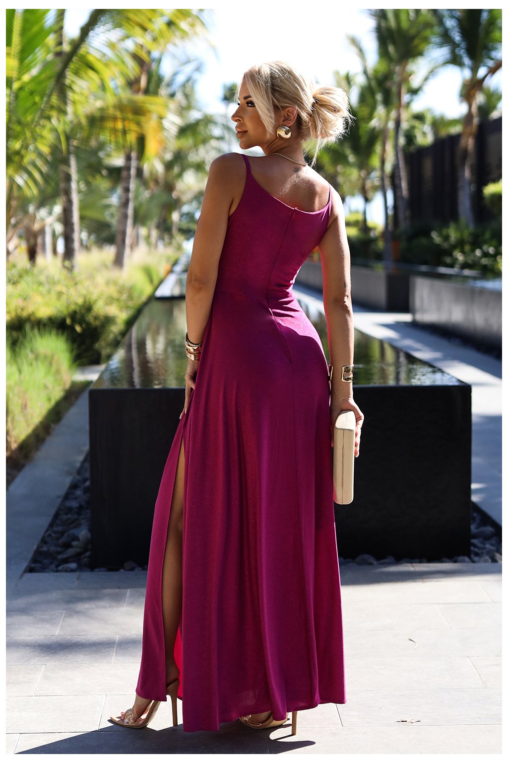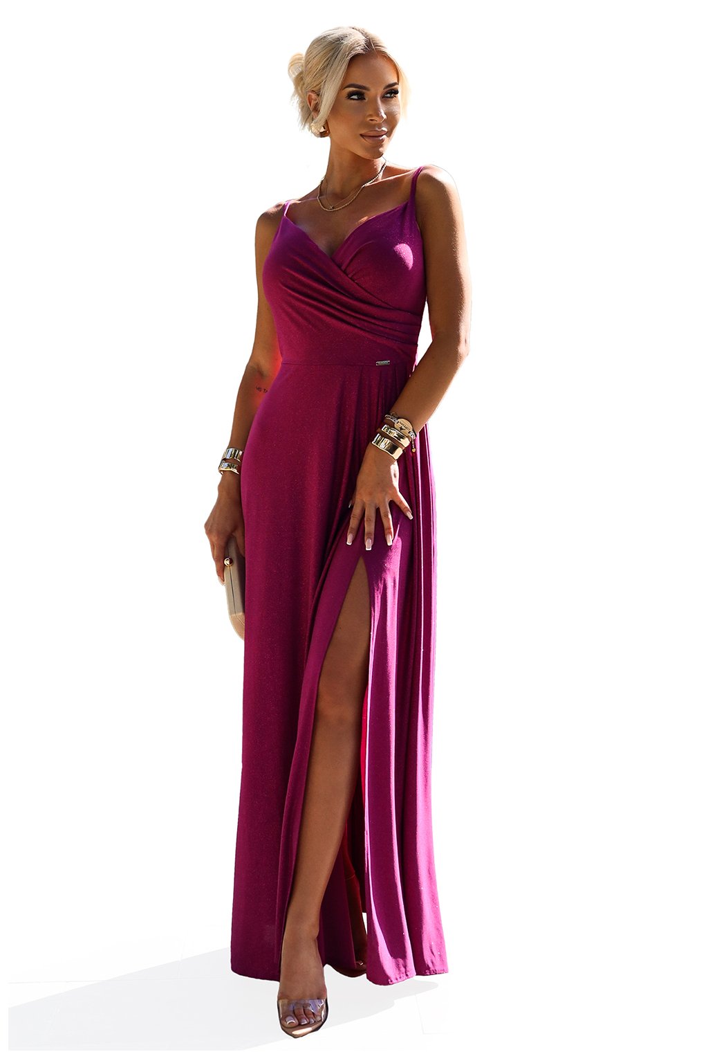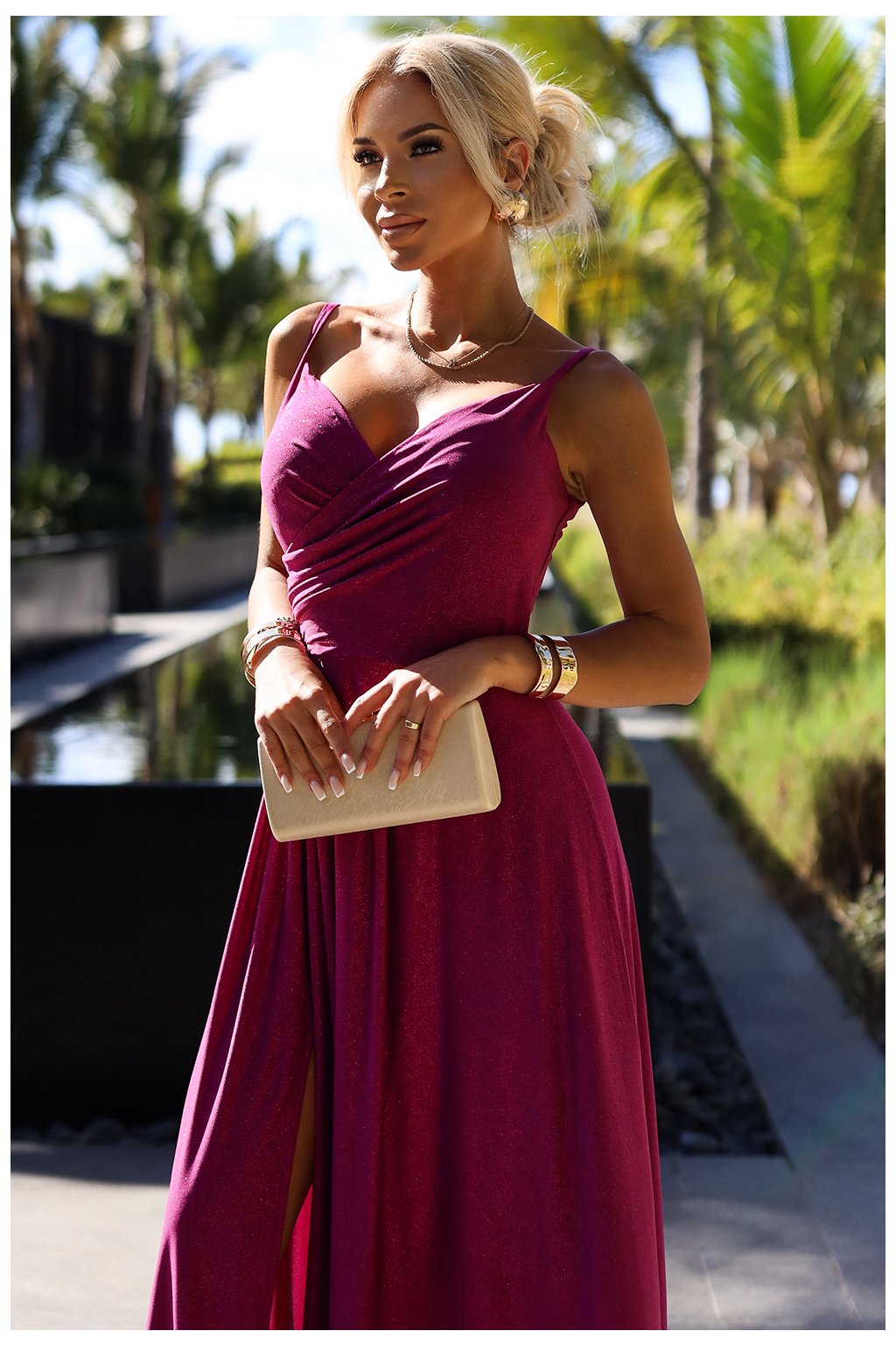 Chiara - elegantní maxi dlouhé lesklé šaty na ramínka. Krásně tvarovaný výstřih a rozparek na sukni vytvářejí neobvyklou kompozici. Vyrobeno ze třpytivého, pružného fuchsiového materiálu. Šaty ideální na svatby, Silvestra, ples, karneval a další významné příležitosti. Polská výroba. Značka Numoco.