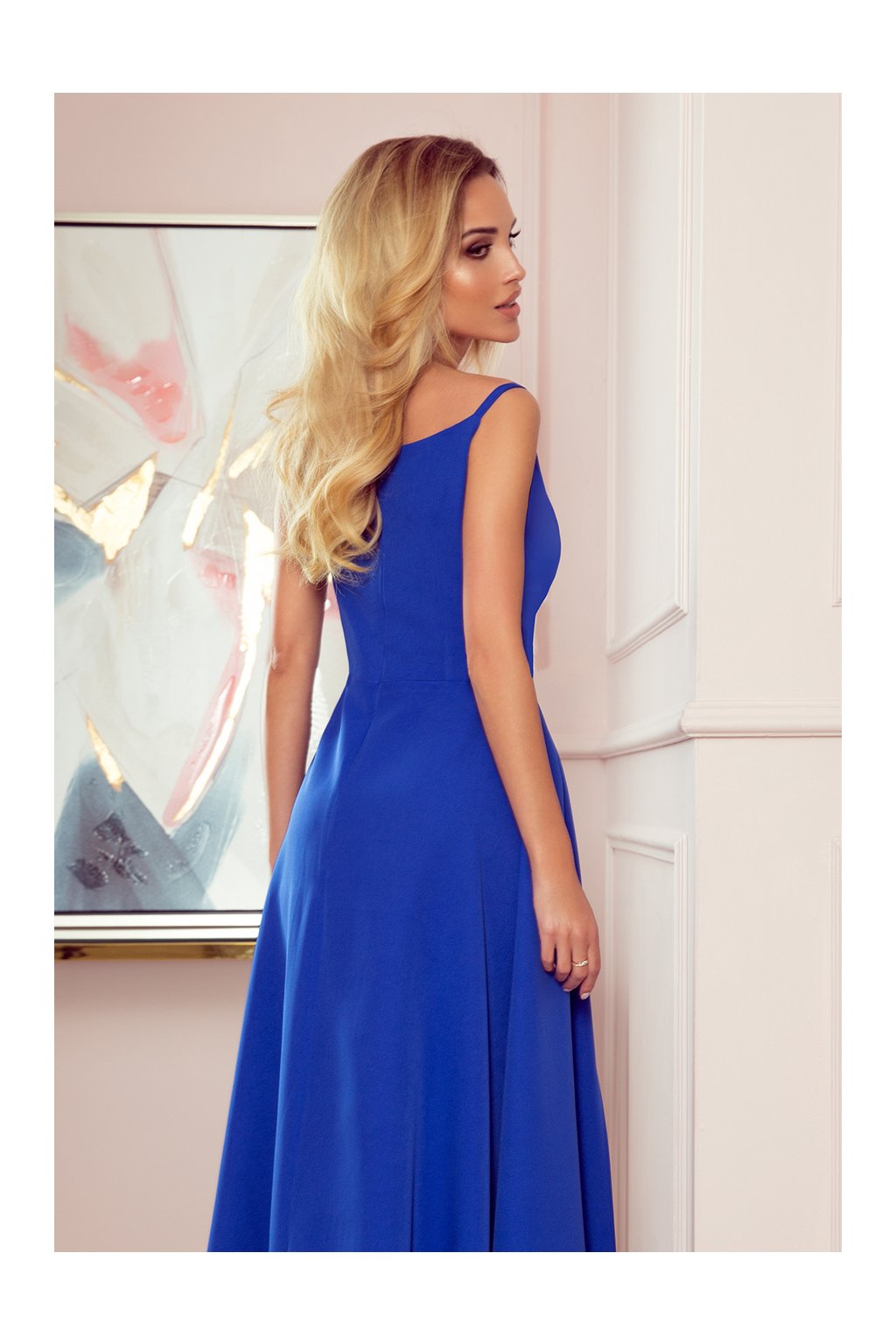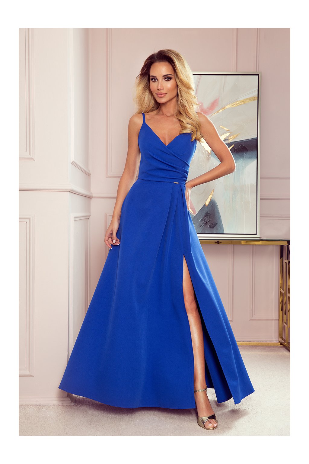 Chiara - elegantní maxi šaty s popruhy. Krásně tvarovaný výstřih a střih na sukni vytváří neobvyklé složení - modrá barva. Polská produkce. Značka Numoco.