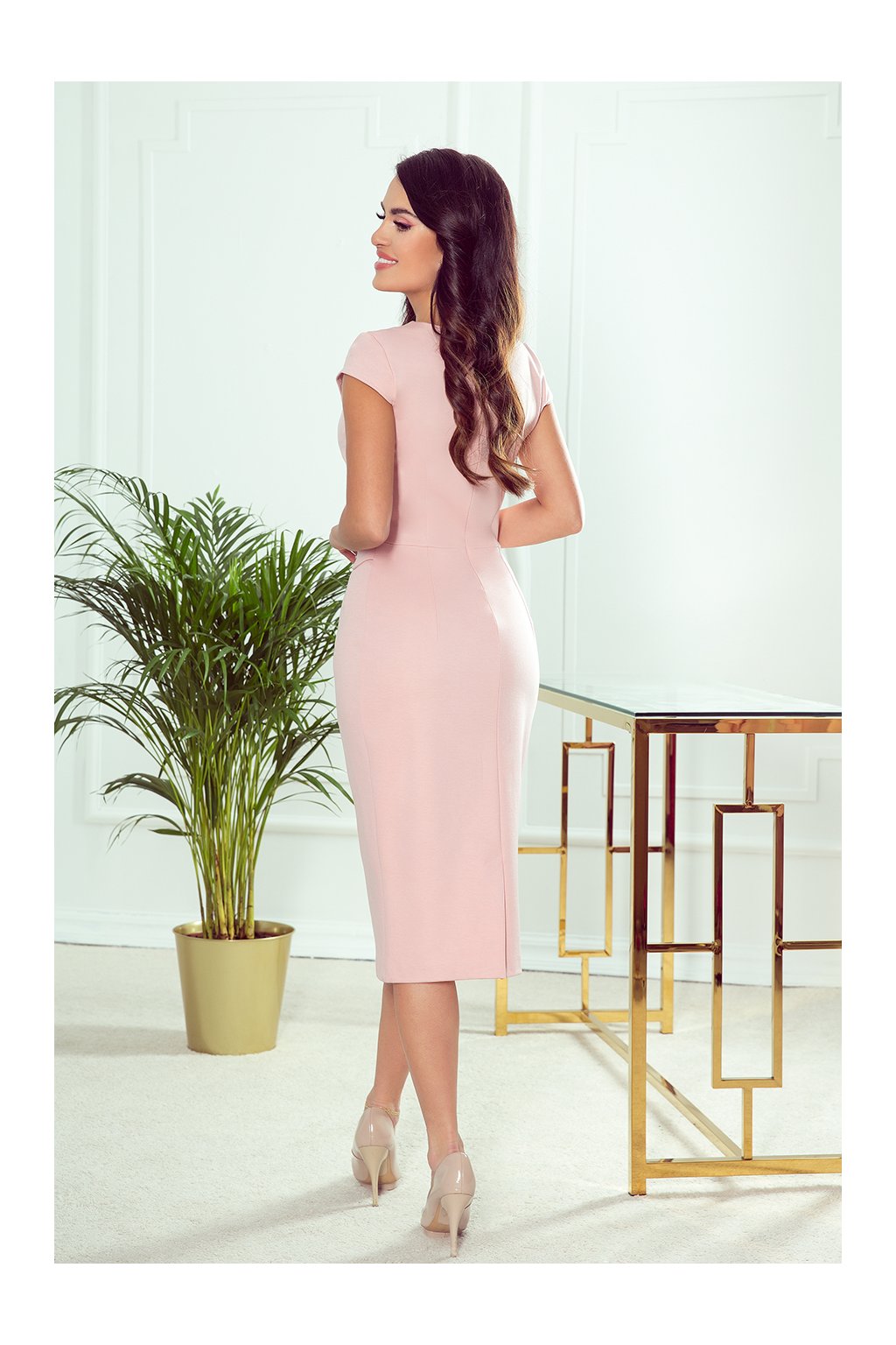 Tamara - Elegantní midi šaty s pásem a krátkým rukávem - špinavá růžová. Vyrobeno z příjemné na dotek, lehce elastický materiál bez podšívky. Připíná se vzadu zakrytým zipem. Značka Numoco. Polský produkt.