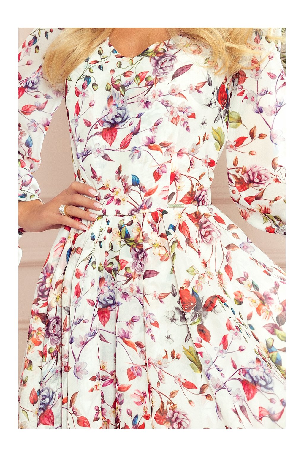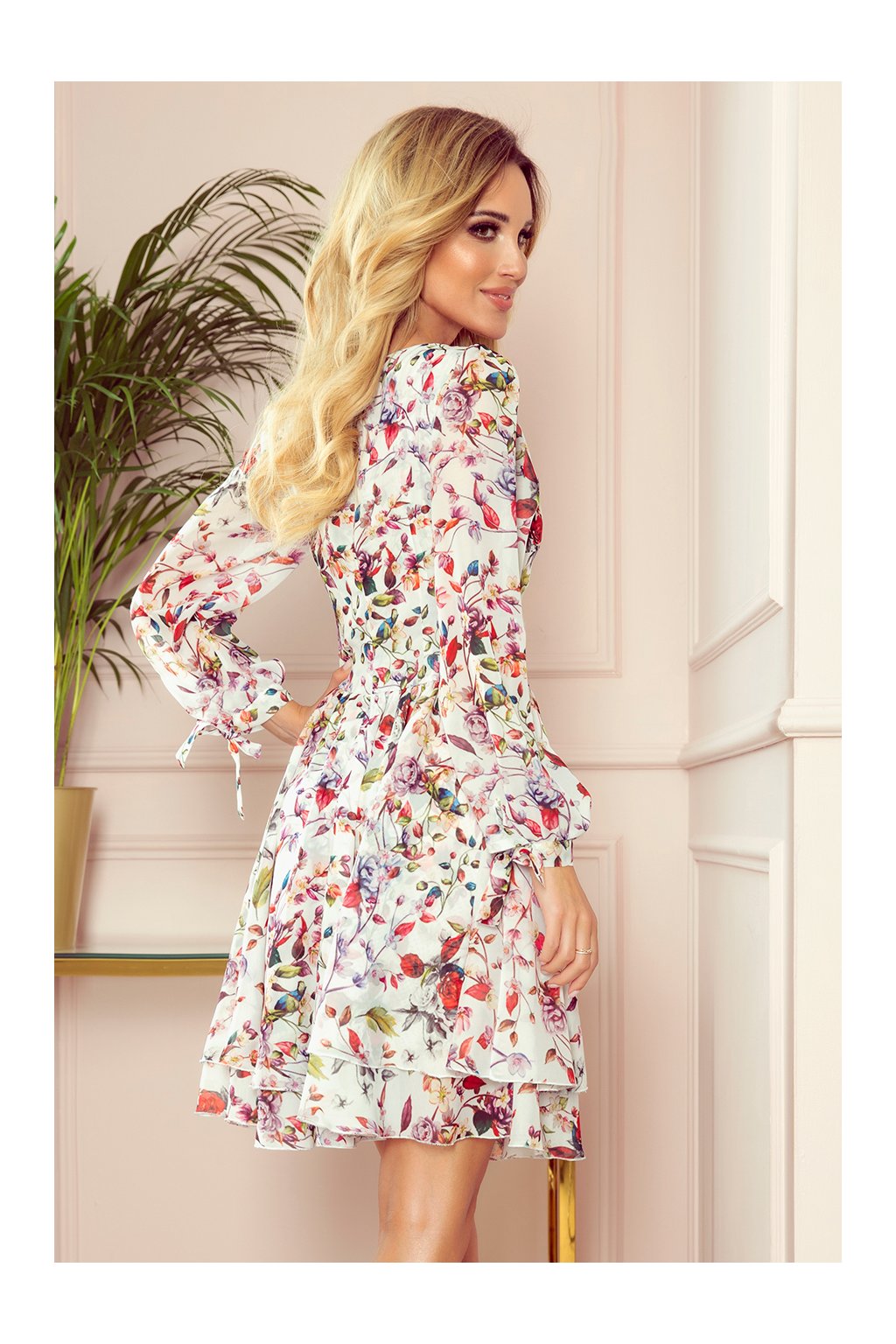 Zoe - šifónové šaty s výstřihem a luky na rukávech. Vzor: barevné květy na světlém pozadí. Polská produkce. Značka Numoco.