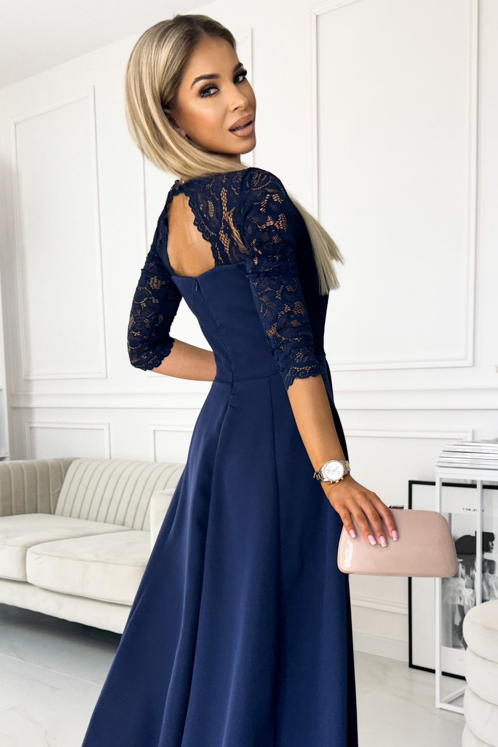 309-6 AMBER elegantní krajkové dlouhé šaty s výstřihem - tmavě modrá