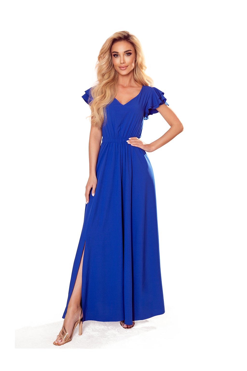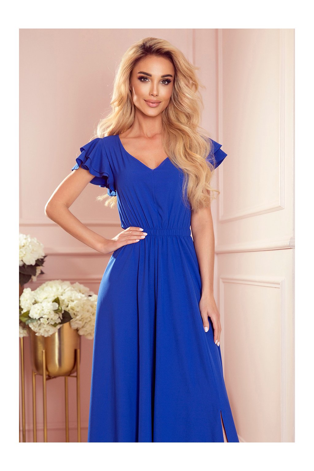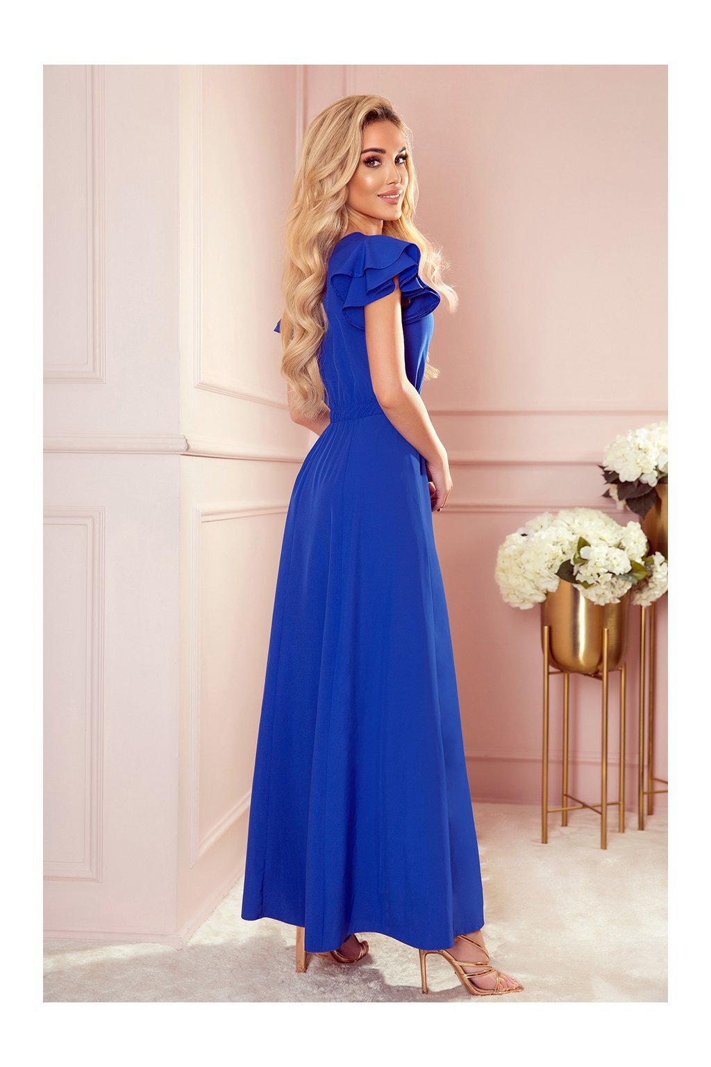 Lidia - dlouhé šaty s výstřihem a volánky na ramenou. Barva: modrá. Numoco. Polská produkce.