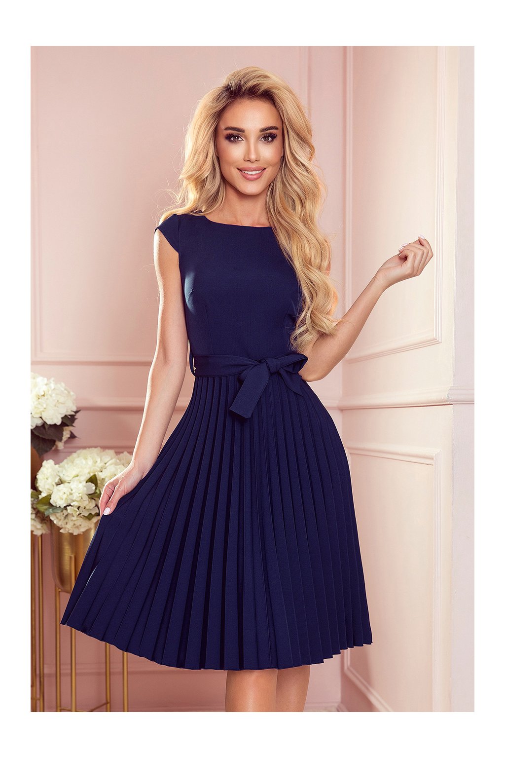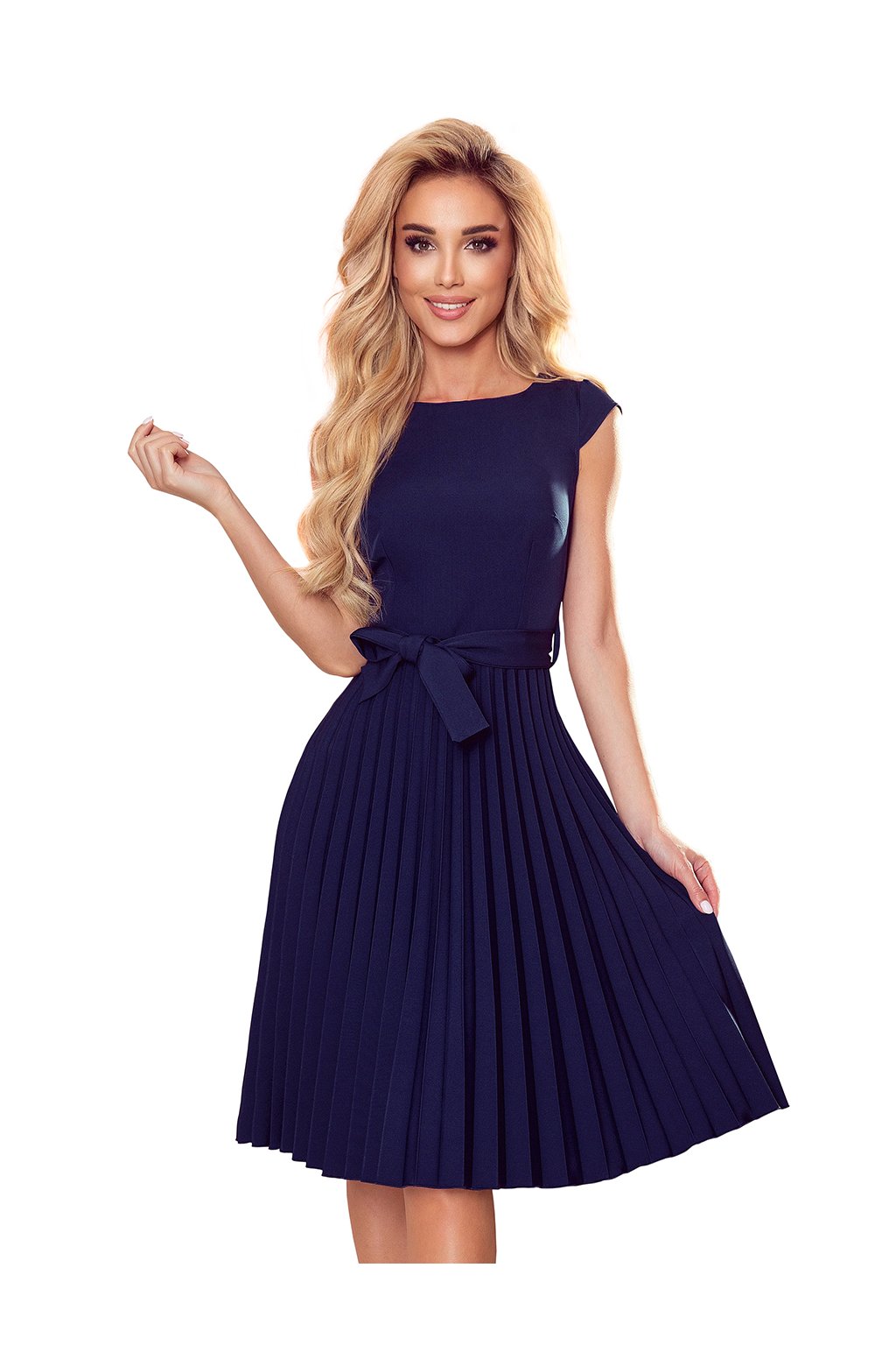 Lila - plisované šaty s krátkým rukávem a opasek. Upevněny vzadu s krytým zipem. Tmavě modrá barva. Značka Numoco. Polská produkce.