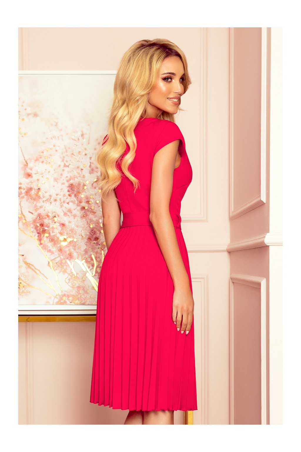 Lila - plisované šaty s krátkým rukávem a opasek. Upevněny vzadu s krytým zipem. Malinová barva. Značka Numoco. Polská produkce.