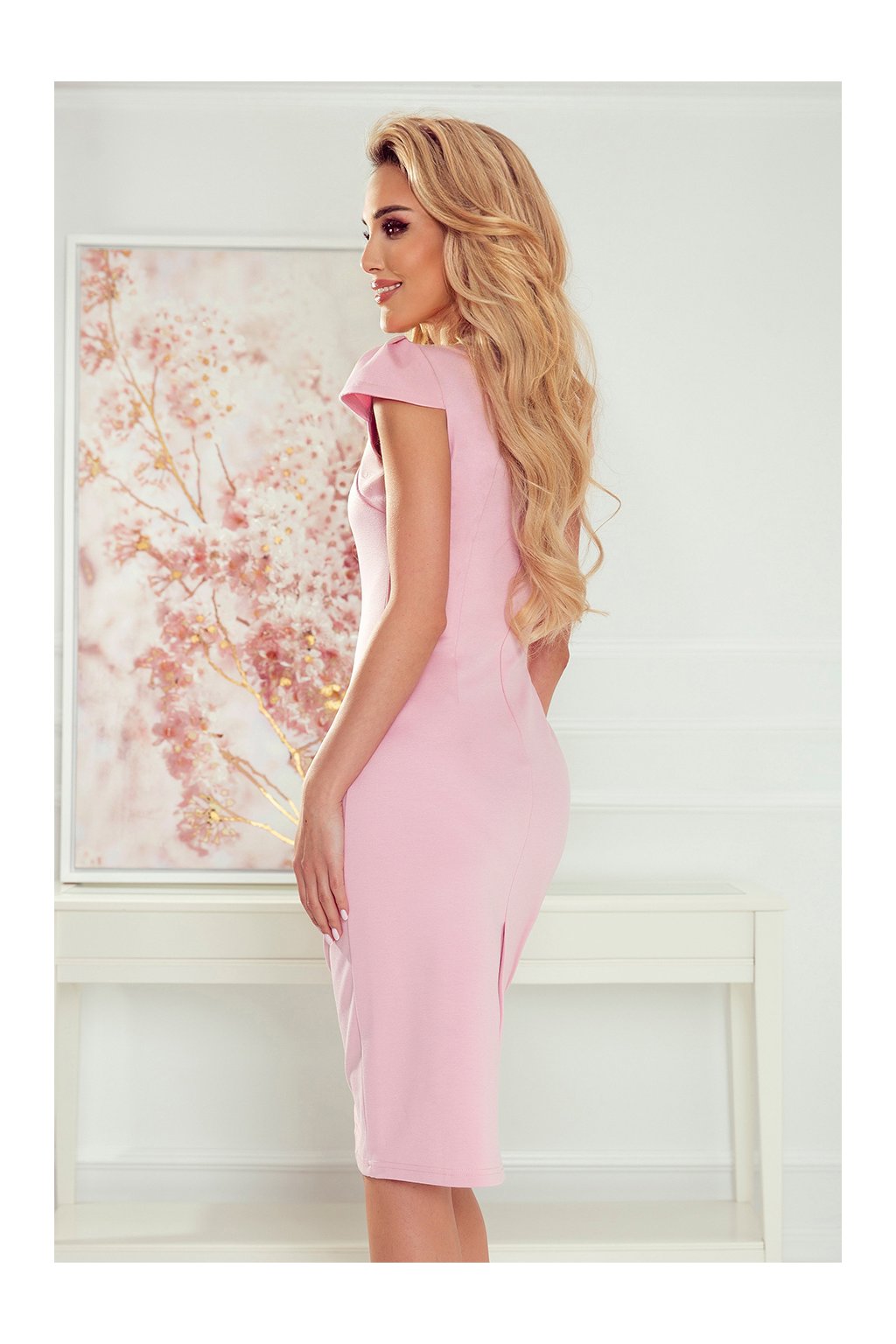 Midi šaty s pěkným výstřihem a krátkými rukávy. Barva: pudrově růžová. Klasické a elegantní. Vyrobeno ze silnějšího, pružného materiálu. Polská výroba. Značka Numoco.