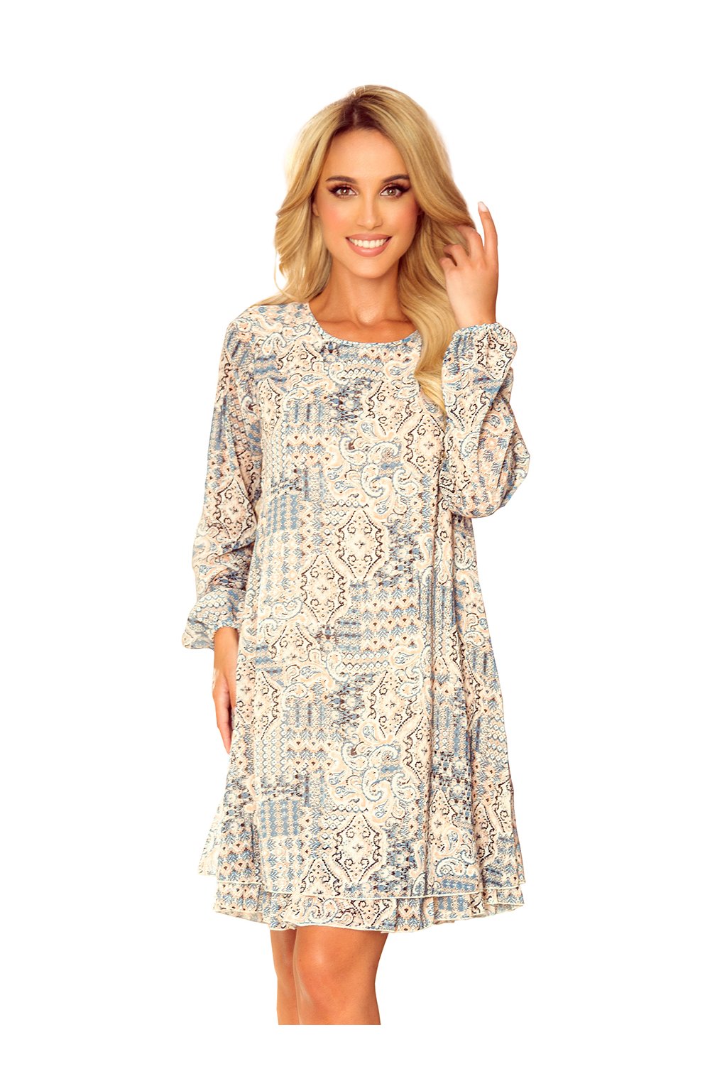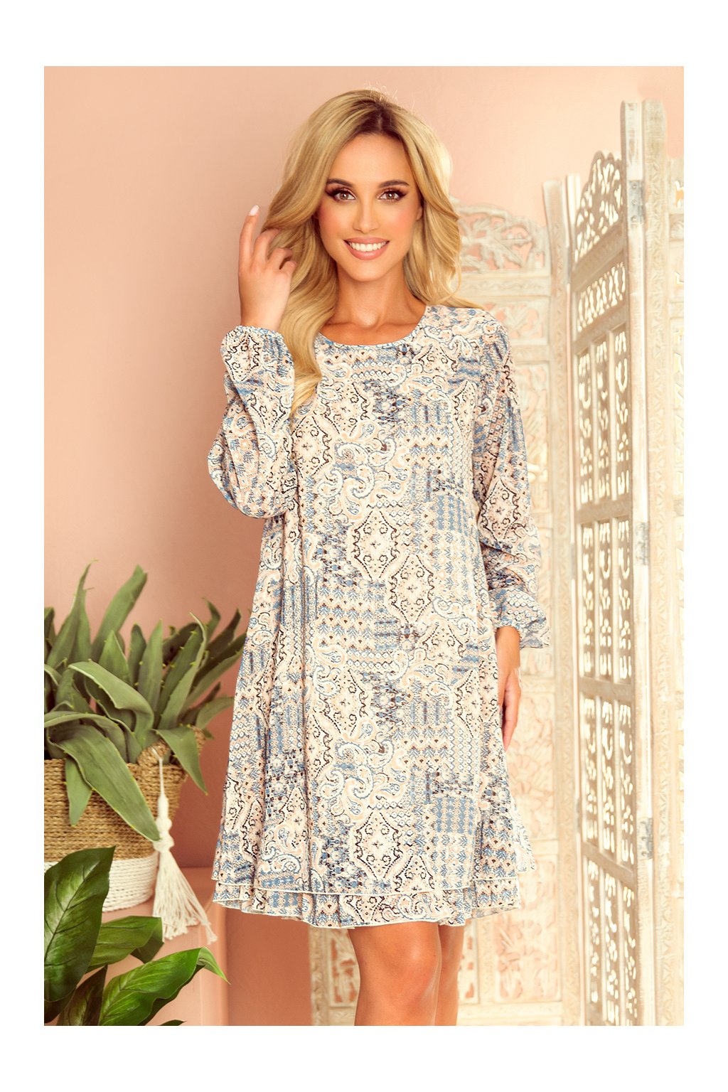 Hannah - šifónové šaty s dlouhými rukávy a výstřihem na zádech. Béžový a modrý boho vzor + podšívka. Značka Numoco. Polská produkce.