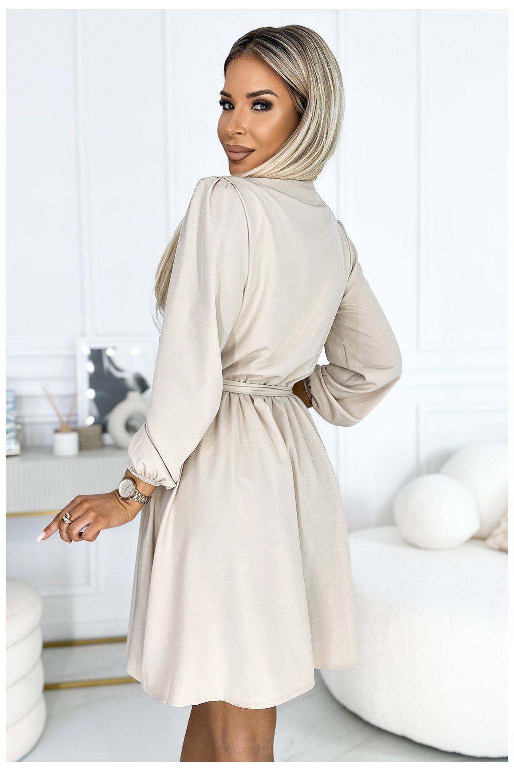339-4 BINDY Dámské šaty s výstřihem a páskem - béžové