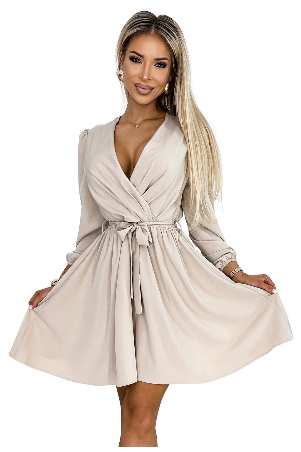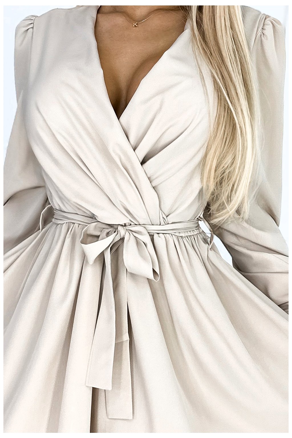 Bindy - ženské a elegantní šaty s psaníčkovým výstřihem, zavazováním v pase a gumičkami na rukávech. Barva béžová. Polská výroba. Značka numoco.