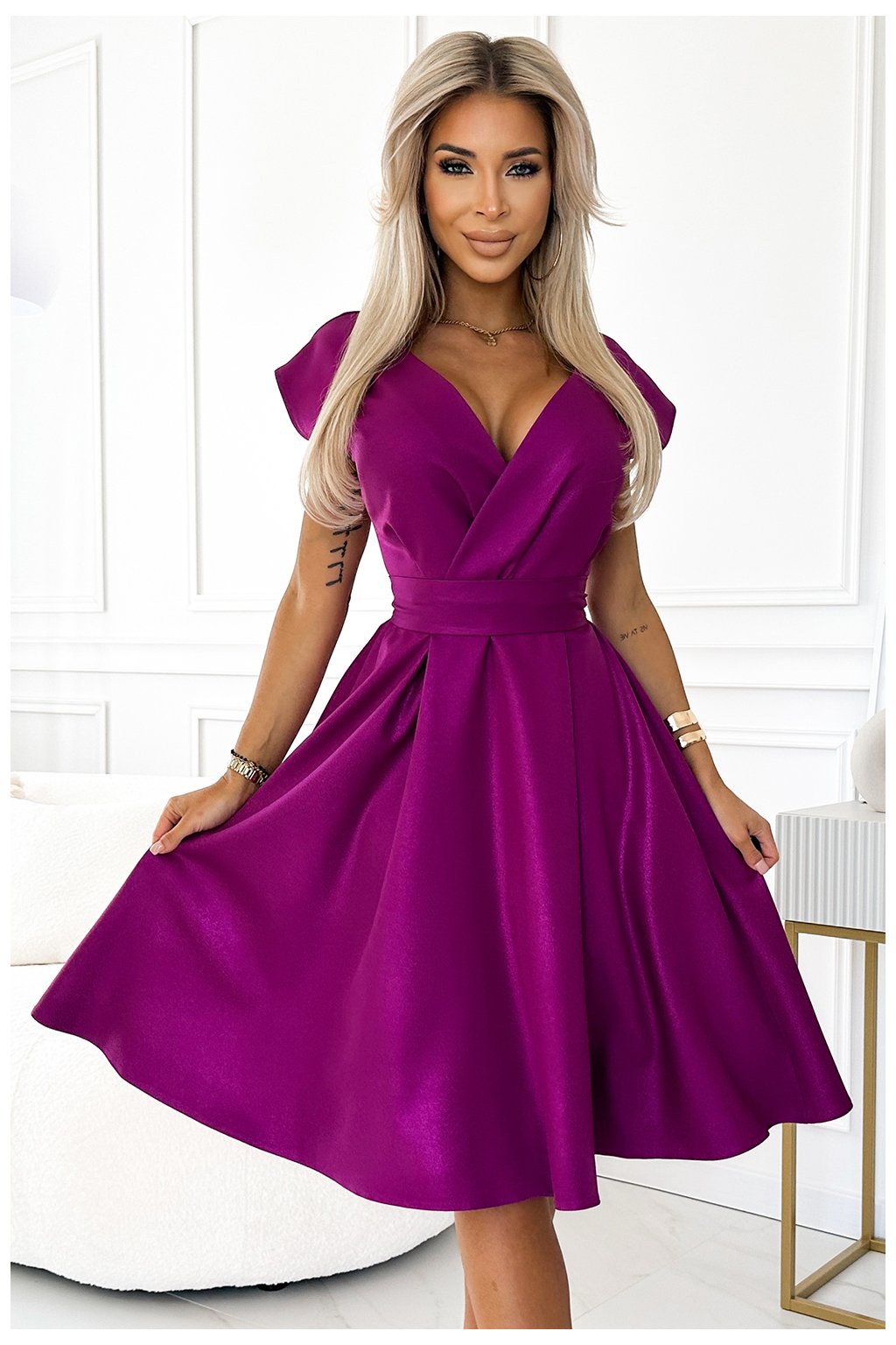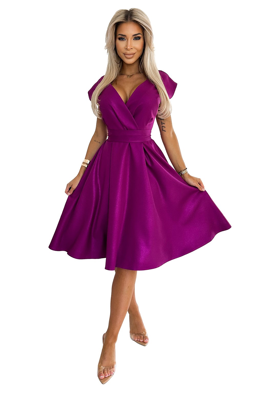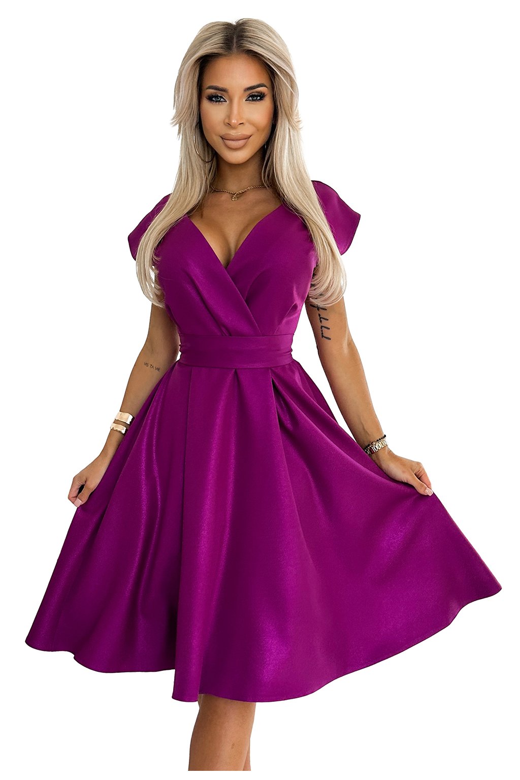Scarlett jsou okouzlující šaty rozevlátého střihu, charakteristické elegantním psaníčkovým výstřihem a páskem zvýrazňujícím pas. Je vyrobena z kvalitního materiálu se třpytkami. Barva: Fuchsia. Značka numoco zaručuje vysokou kvalitu zpracování a výroba v Polsku dokazuje důraz na vysokou kvalitu šití. Tyto šaty jsou perfektní volbou pro různé druhy oslav, jako jsou křtiny, svatby, přijímání, Silvestr nebo večerní výlety, dodají každé ženě elegantní a šik vzhled.