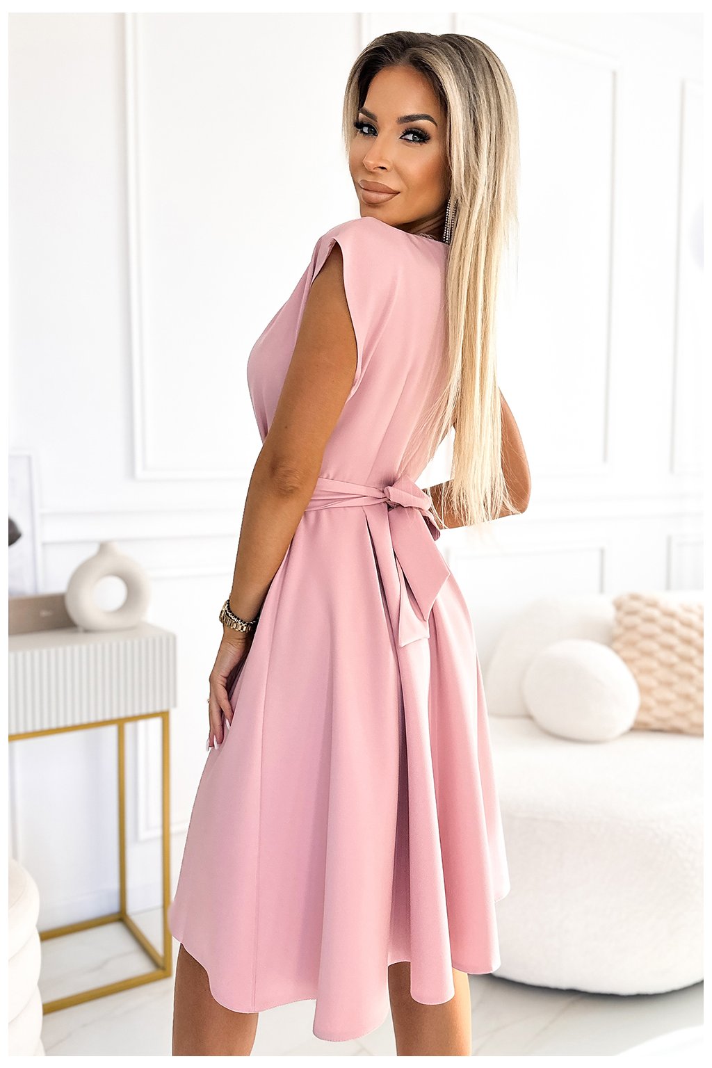 Scarlett - rozšířené šaty s výstřihem obálky a opaskem. Vyrobeno z materiálu příjemného na dotek (95% polyester, 5% elastan). Barva: prášková růžová. Značka Numoco. Polská produkce.