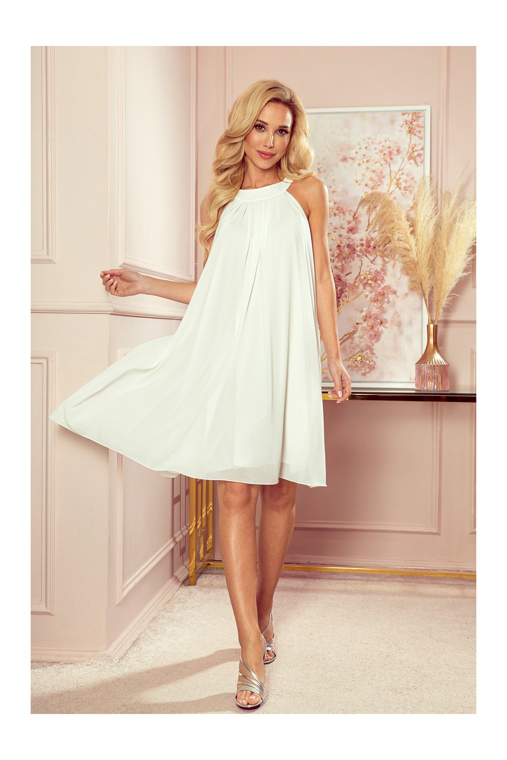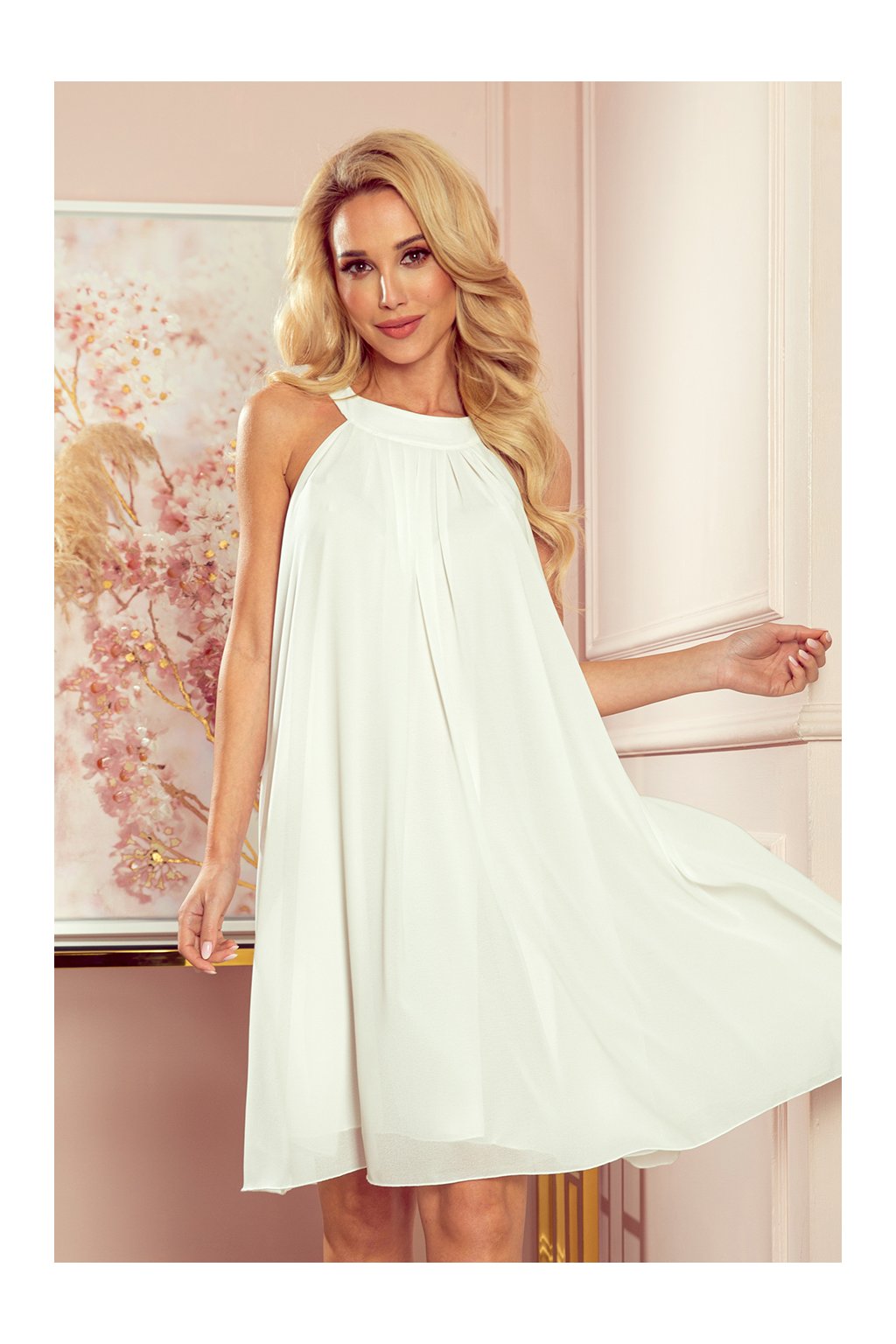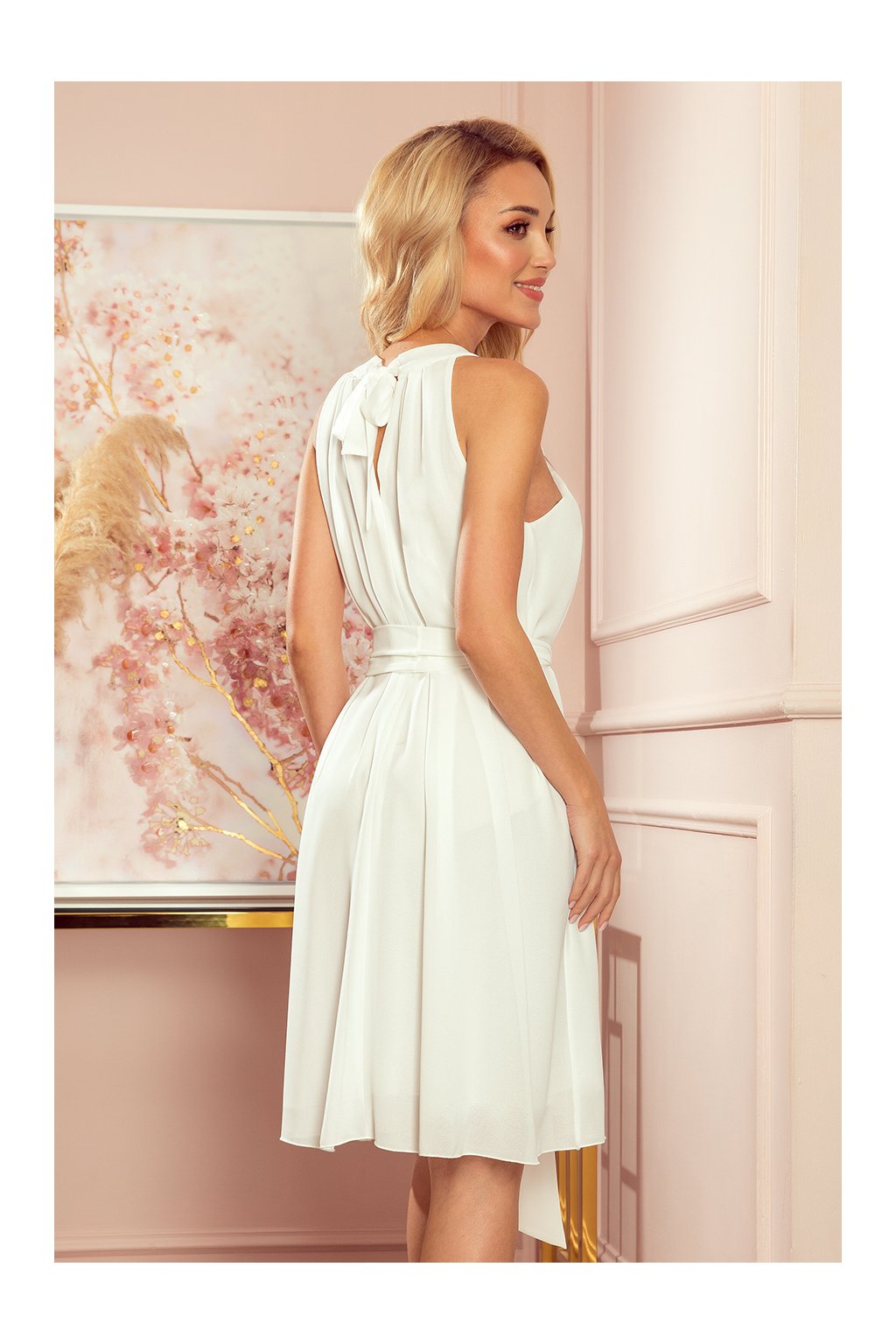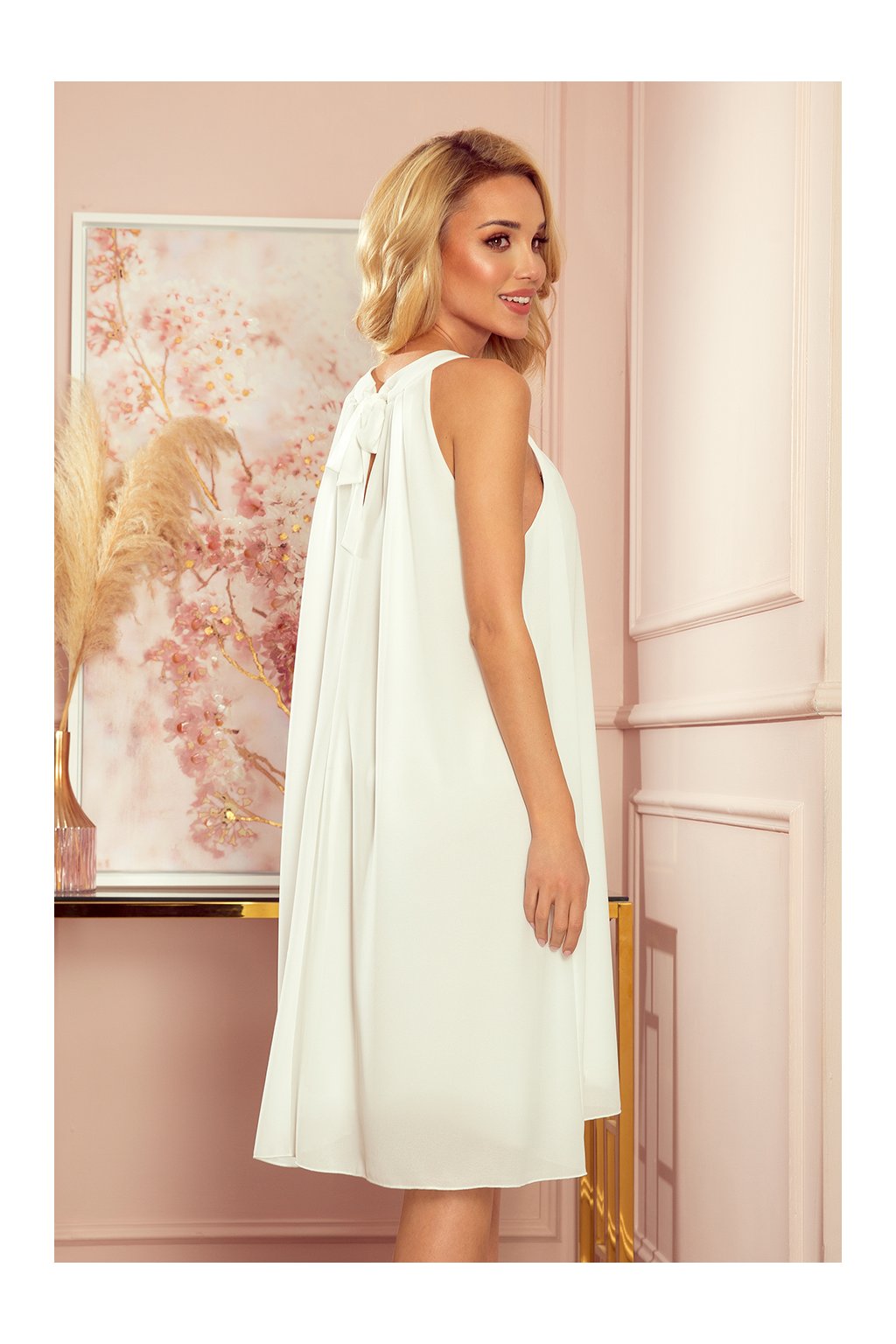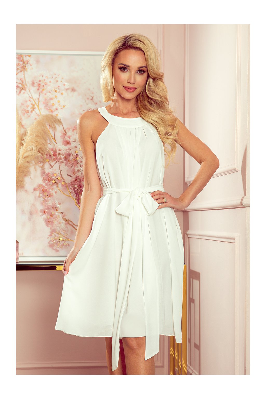 Alizee - šifónové šaty s opaskem a kravatou na zádech. Barva: ecru. Značka Numoco. Polská produkce.