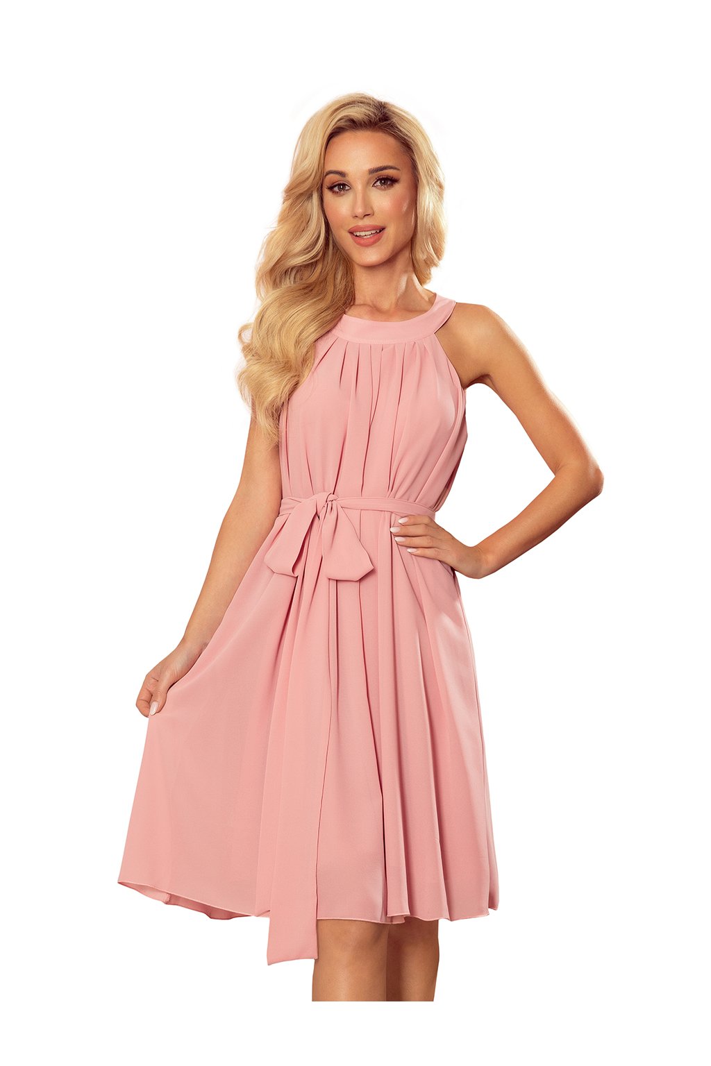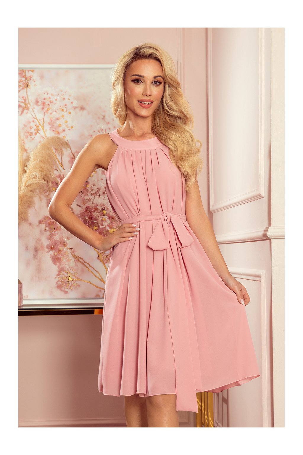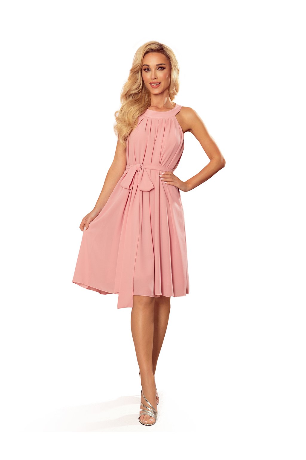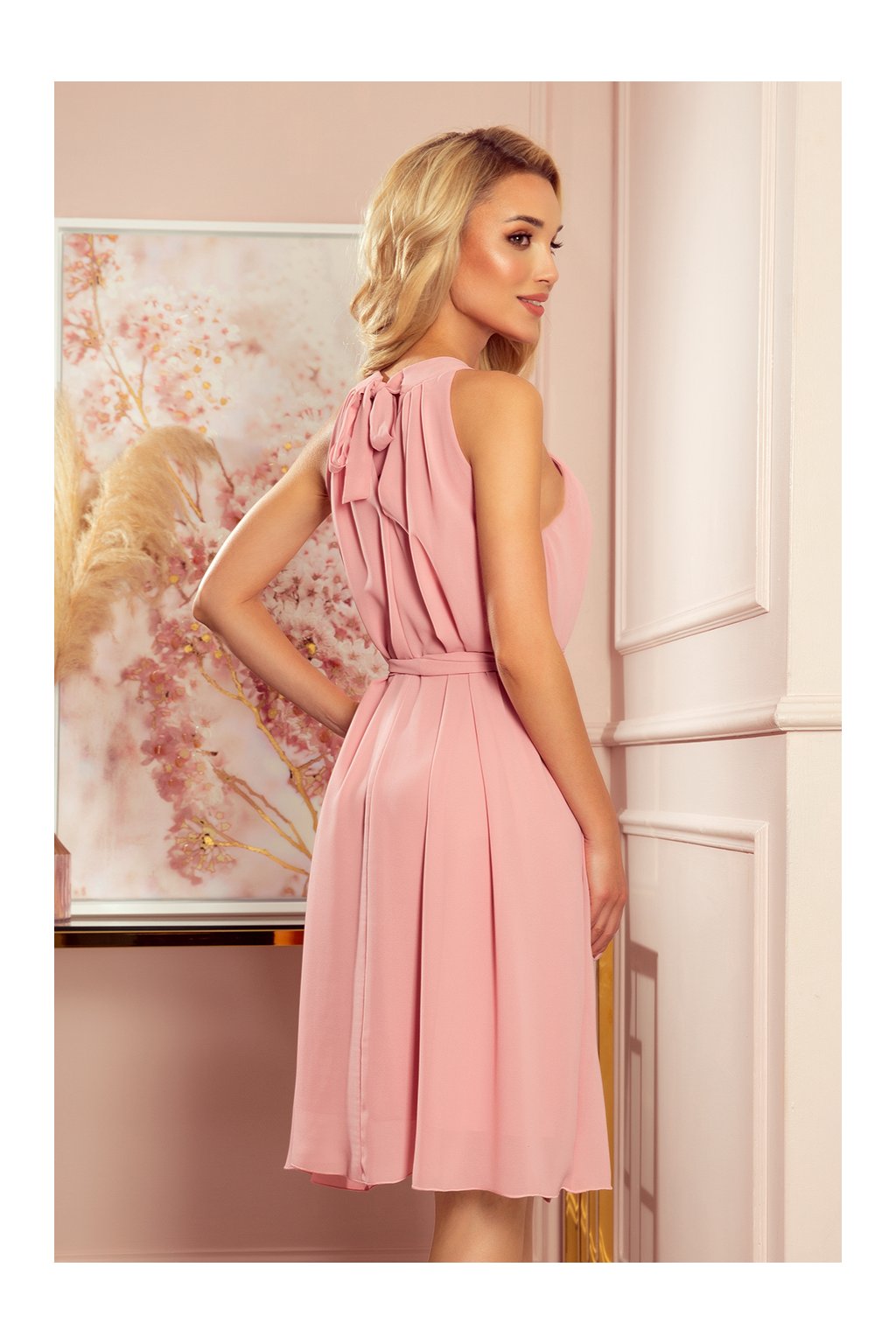 Alizee - šifónové šaty s opaskem a kravatou na zádech. Barva: prášková růžová. Značka Numoco. Polská produkce.