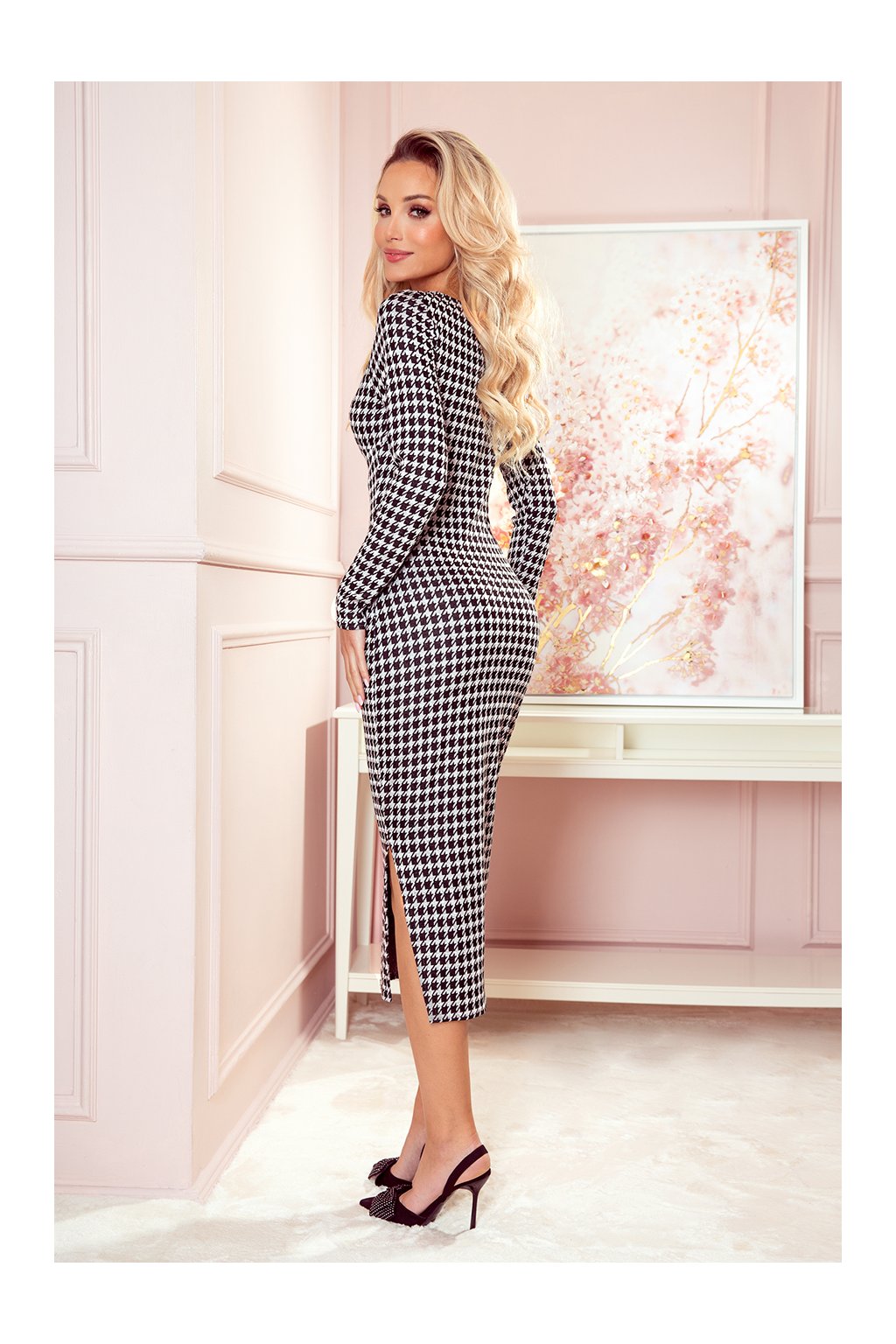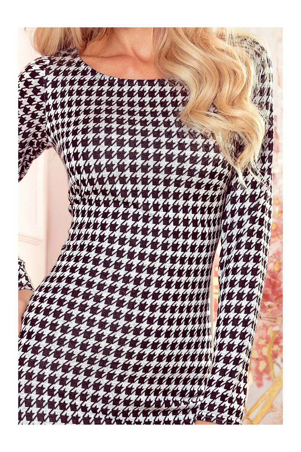 Vypasované midi šaty s bočním rozparkem a 3/4 rukávy. Vzor: černá a šedá houndstooth. Vyrobeno z na dotek příjemného žakárového materiálu. Polská výroba. Značka Numoco.