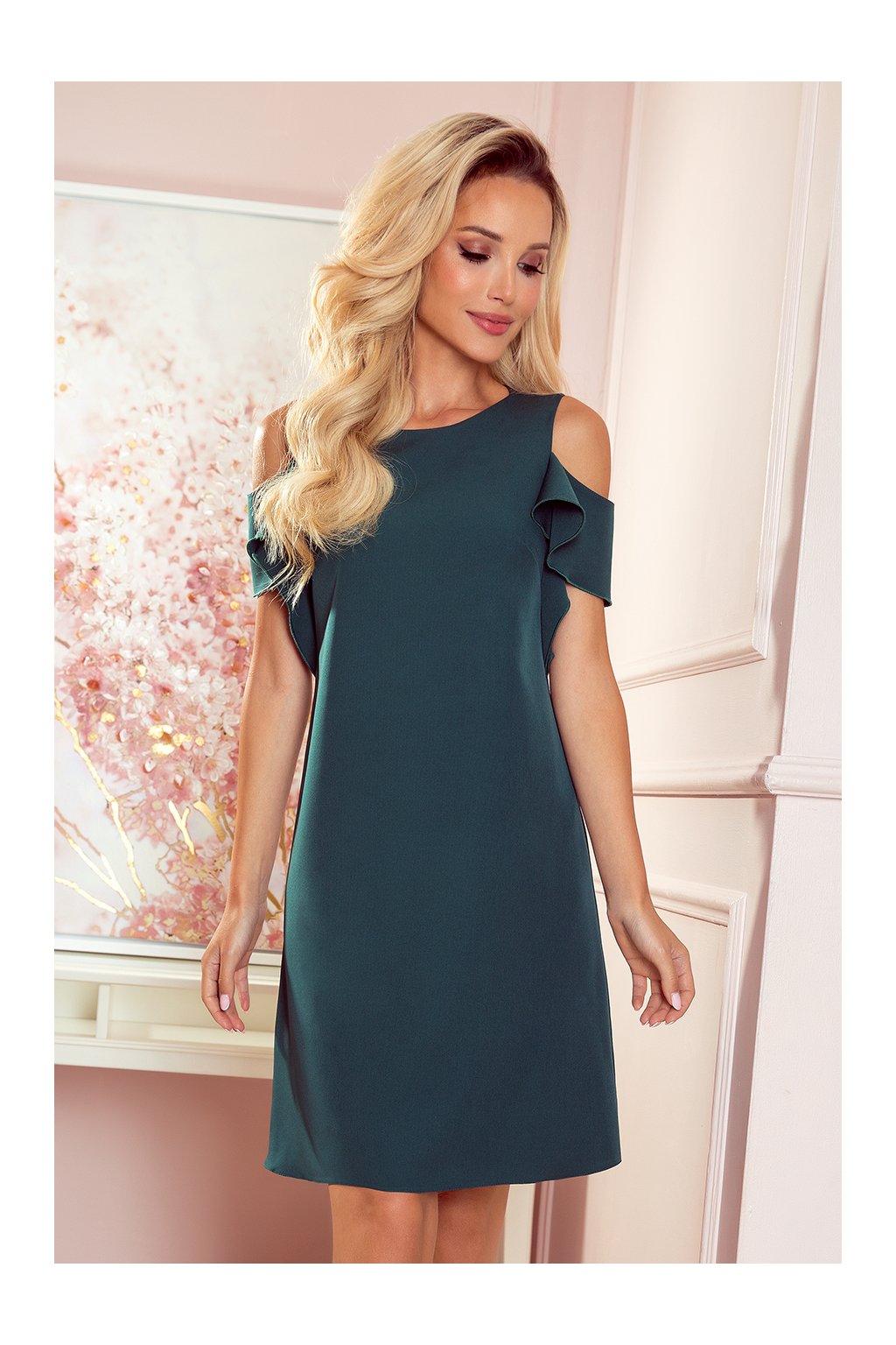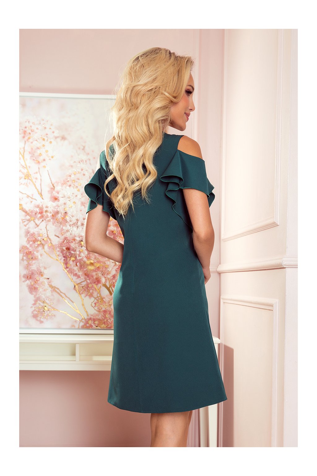 Lichoběžníkové šaty s volánky na rukávech a podšívke. Vyrobeno z materiálu příjemného na dotek (95% polyester, 5% elastan). Barva: lahvově zelená. Značka Numoco. Polská výroba.