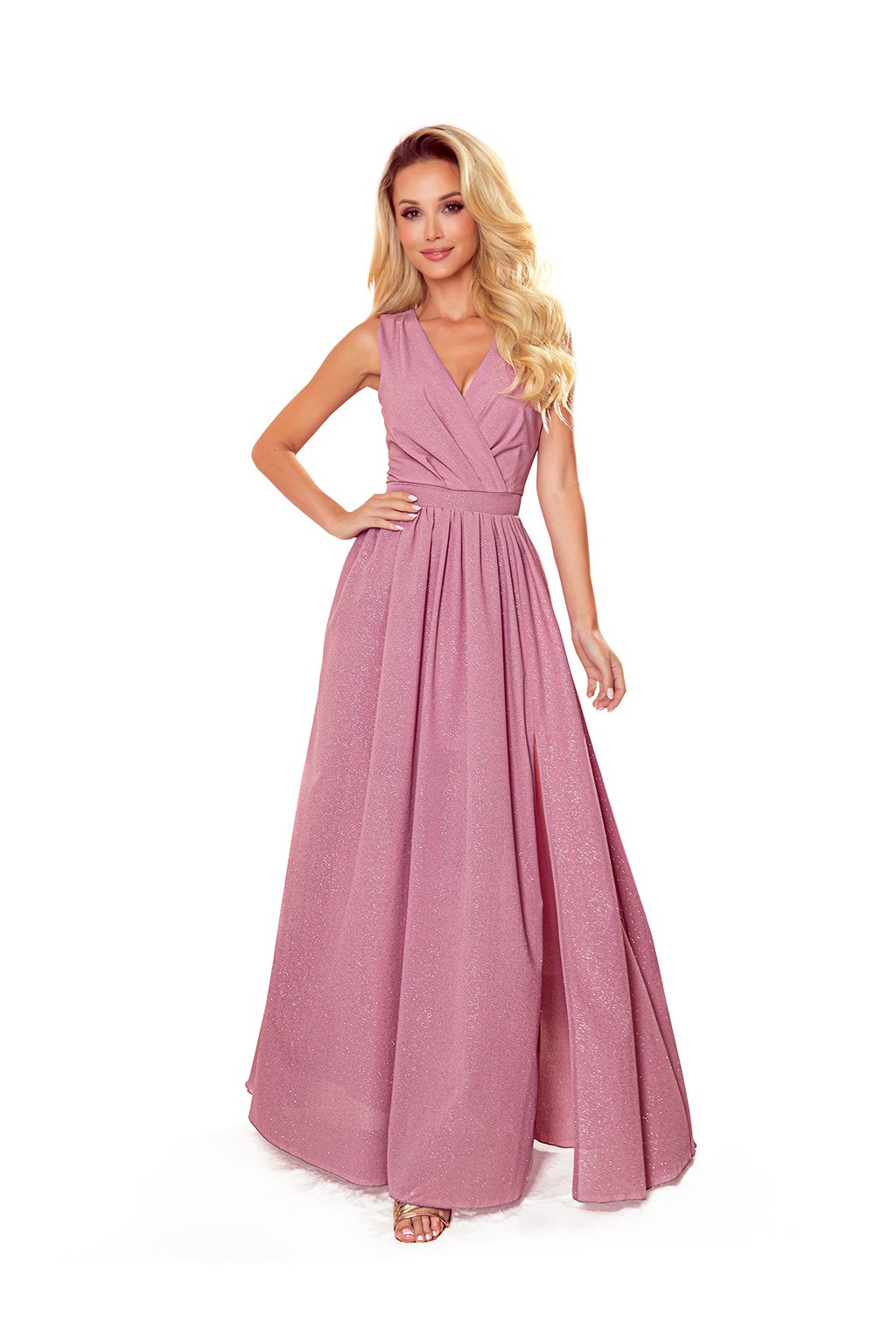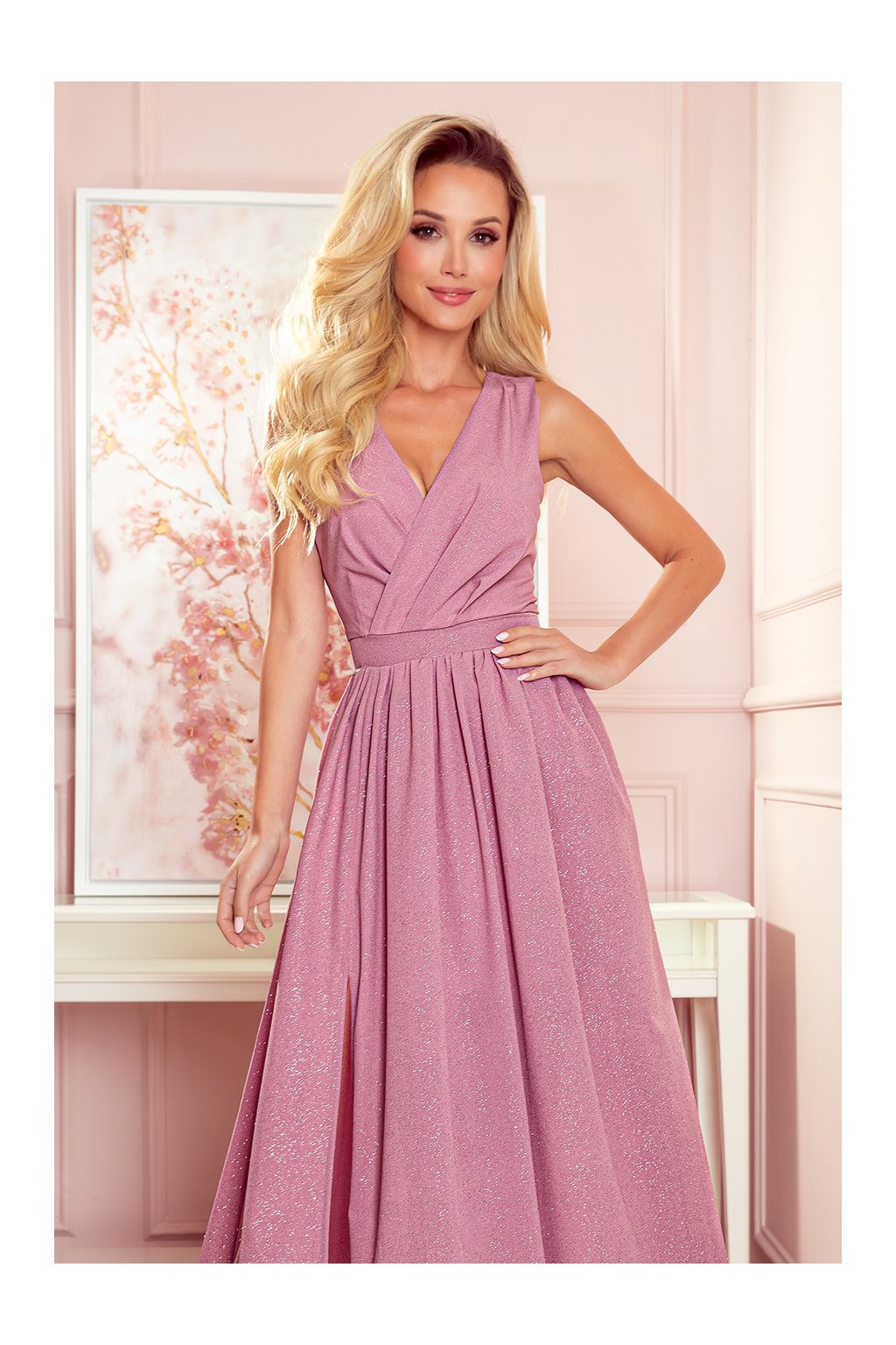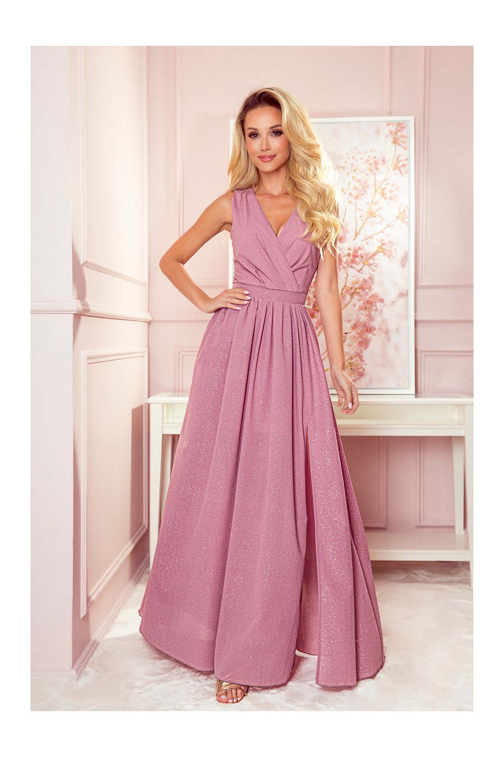362-1 JUSTINE Dlouhé šaty s výstřihem a zavazováním - pudrově růžové se třpytkami