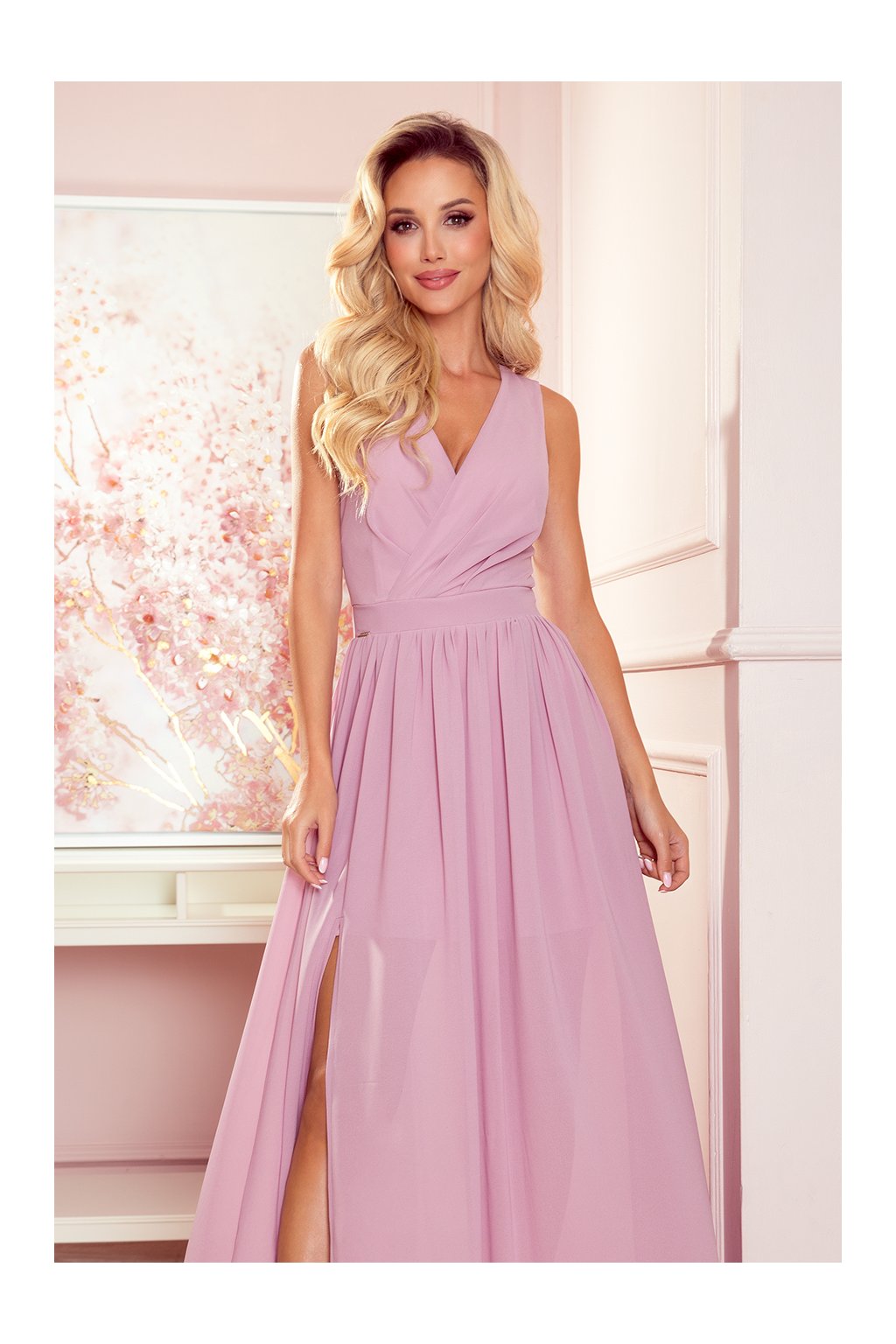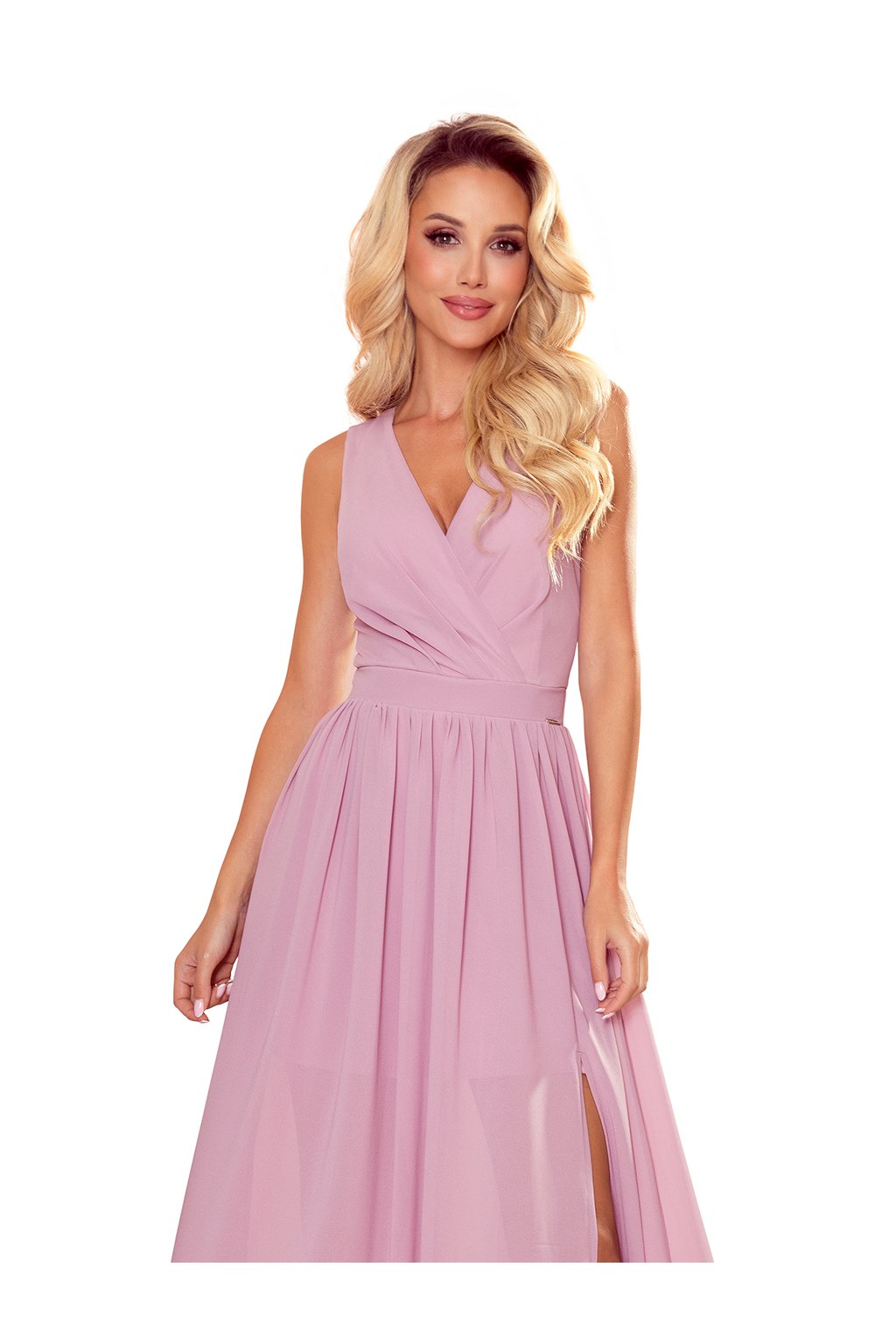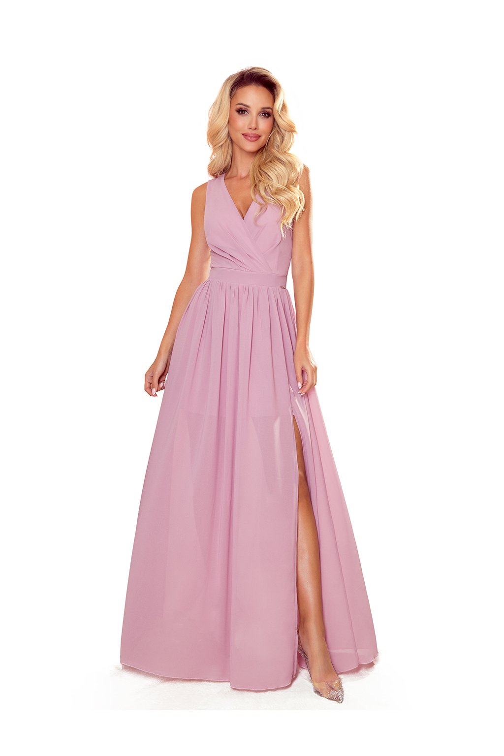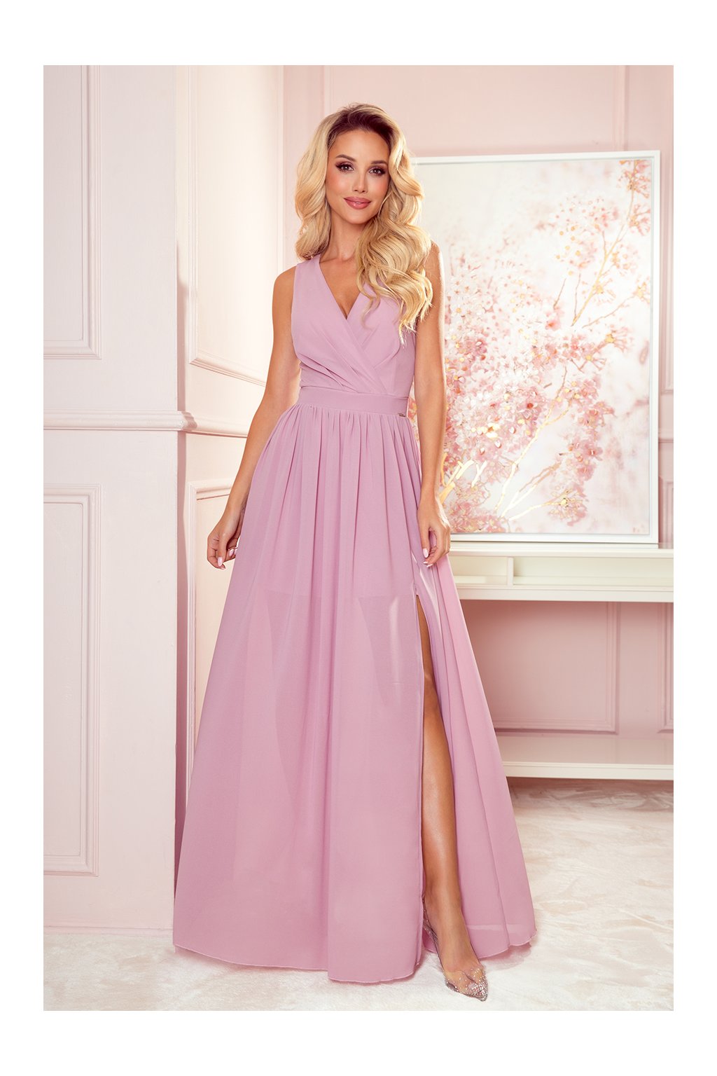 Justine - dlouhé šaty s výstřihem, rozparkem na nohavici a zavazováním na zádech. Vyrobeno ze vzdušného materiálu v pudrově růžové barvě. Zapínání vzadu na krytý zip. Polský výrobek. Značka Numoco.