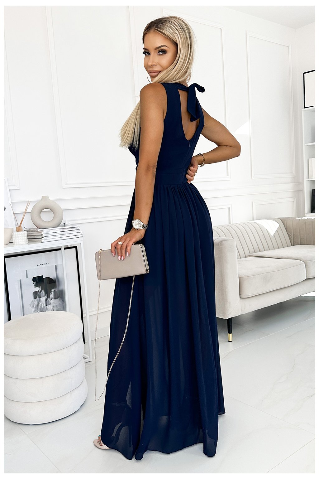 362-7 JUSTINE Dlouhé šaty s výstřihem a zavazováním - tmavě modré