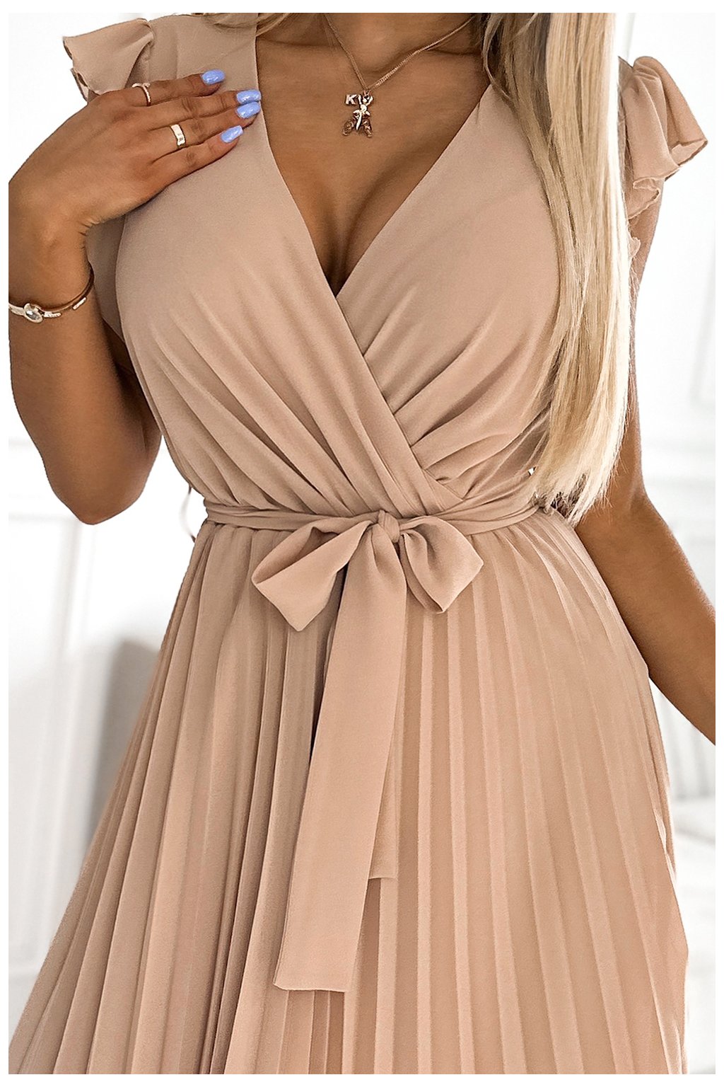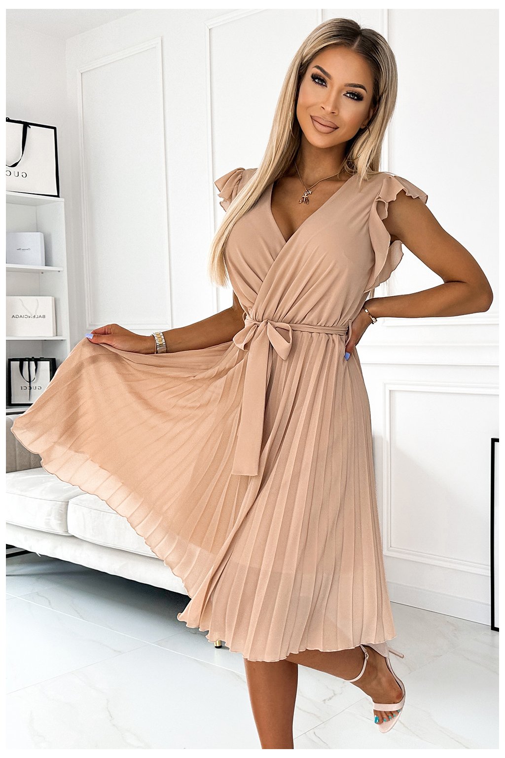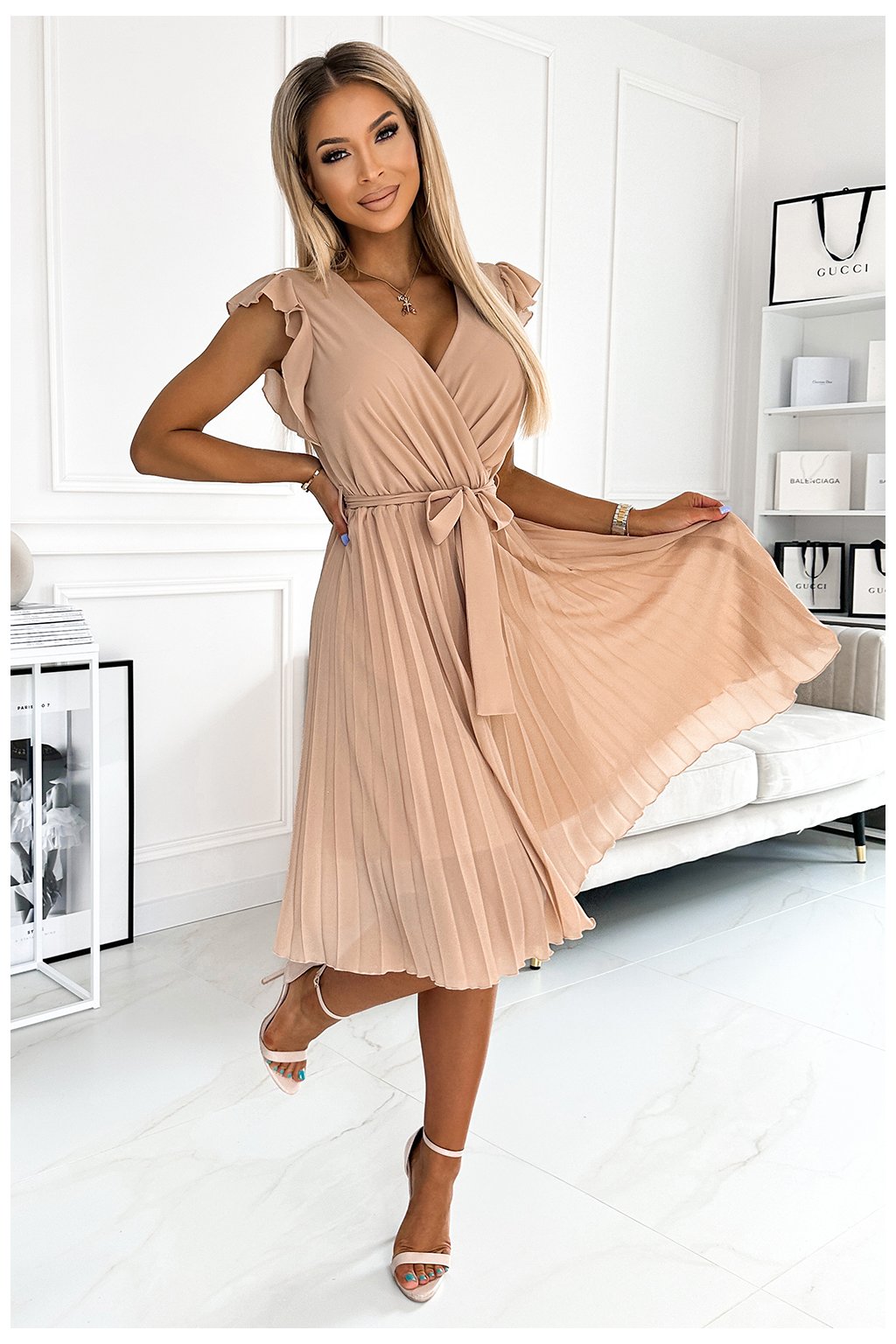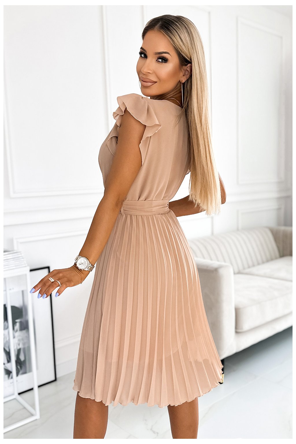 374-5 POLINA Plisované šaty s výstřihem a volány - béžové