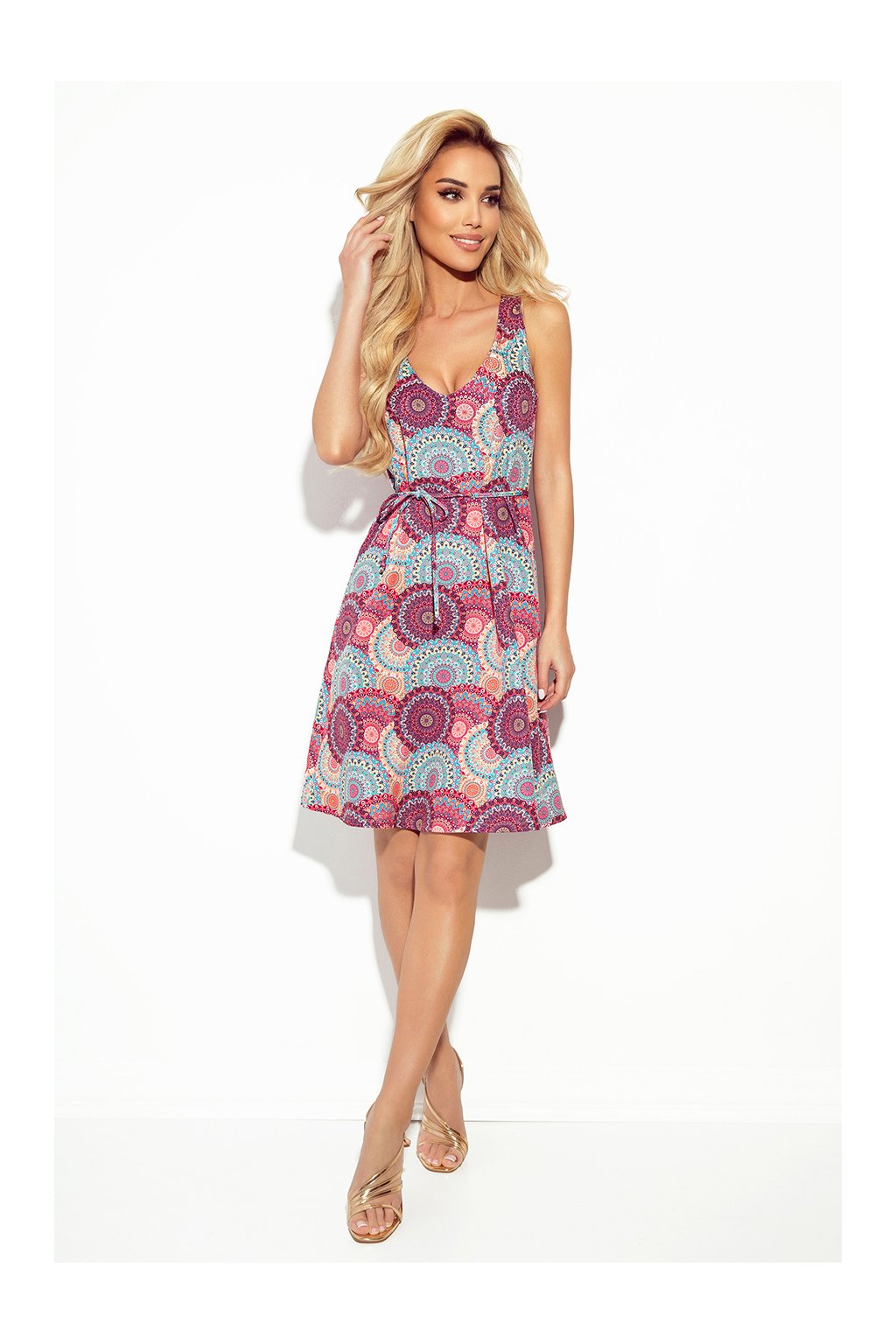 Volné trapézové šaty s výstřihem a páskem. Modré a růžové mandaly. Značka Numoco. Polská výroba.