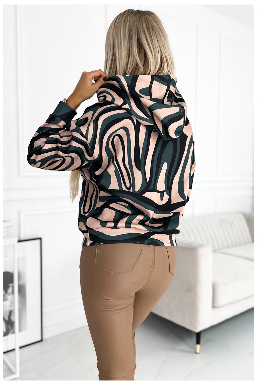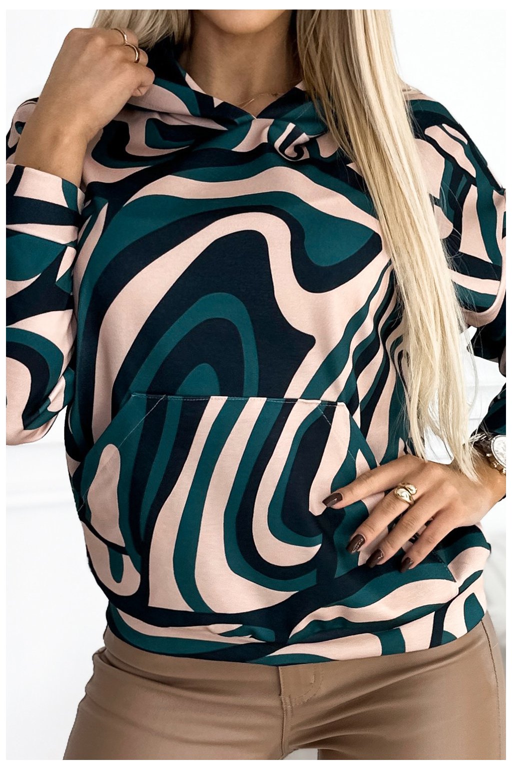 Pohodlná klokaní mikina s kapucí. Vzor: béžové a zelené vlny. Vyrobeno z hřejivého a mírně elastického materiálu. Polský výrobek. Značka Numoco.