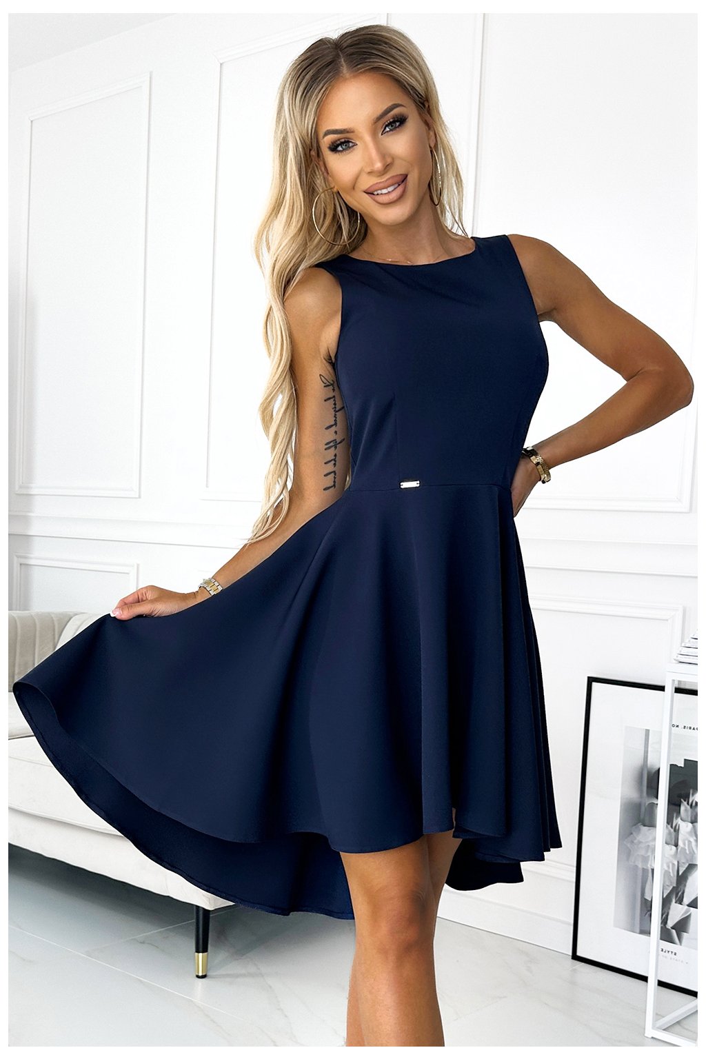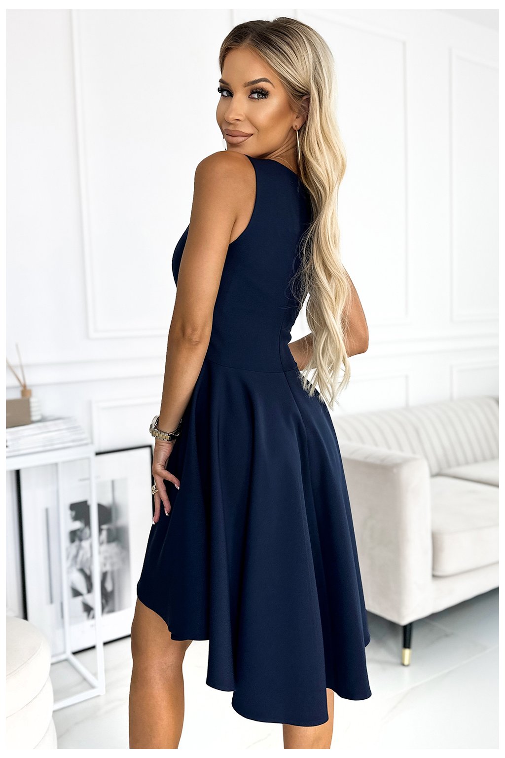 Elegantní šaty s delšími zády. Vyrobeno z materiálu příjemného na dotek v tmavě modré barvě. Na tanec se bude skvěle hodit sukně s delším zadním dílem. Zapínání vzadu na skrytý zip. Polská výroba. Značka Numoco.