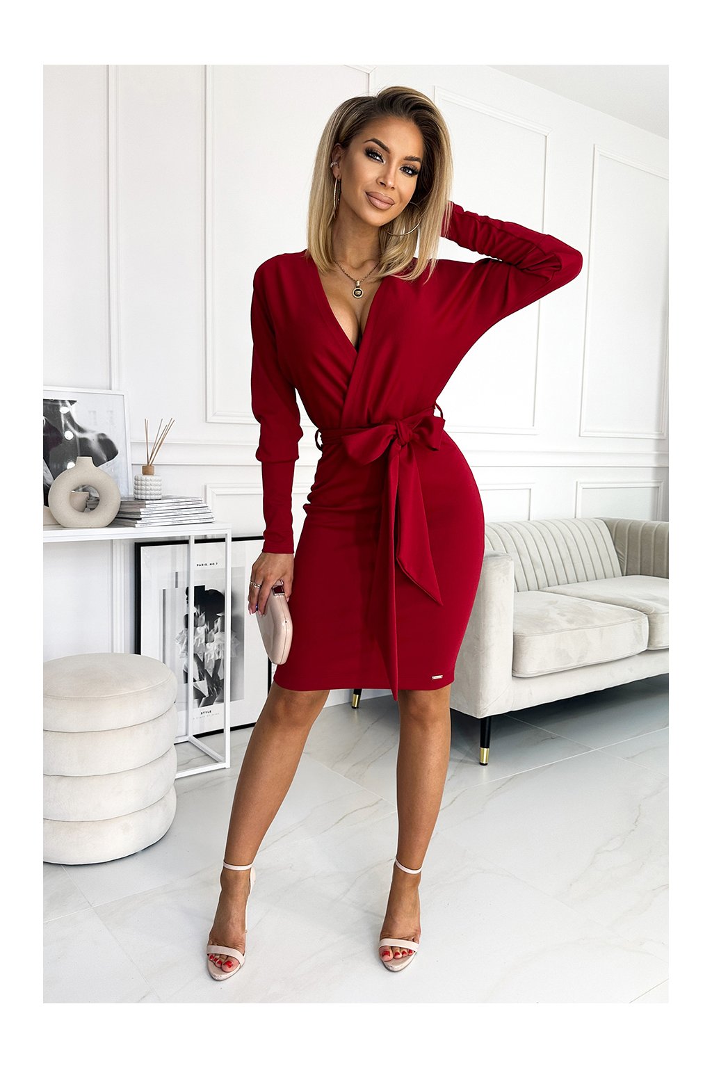 Celia - Obálkové šaty s výstřihem na zádech, dlouhým rukávem a zavazováním v pase. Vyrobeno z příjemného na dotek, silnějšího materiálu. Vínová barva. Značka Numoco. Polská výroba.
